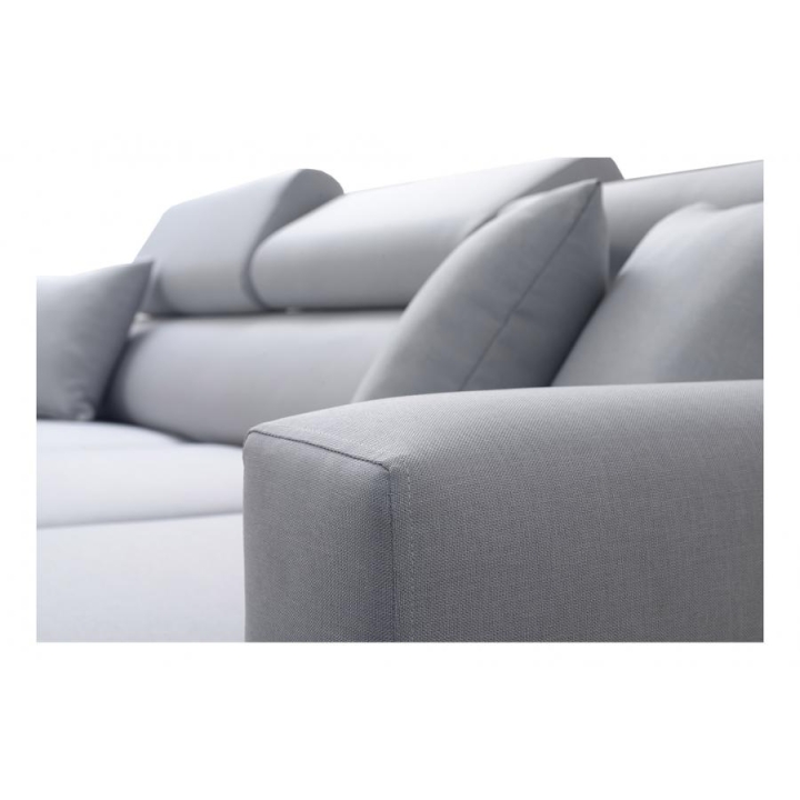Dla zwiększenia ergonomii, Narożnik Loretti I Brattex posiada 3 regulowane zagłówki, umożliwiające indywidualne dopasowanie kąta podparcia głowy do preferencji użytkownika. Mebel opiera się na stopkach, które są dostępne w kilku wariantach do wyboru: metal chrom, metal satyna lub drewniane w kolorach: czarny, biały, olcha, venge i buk.