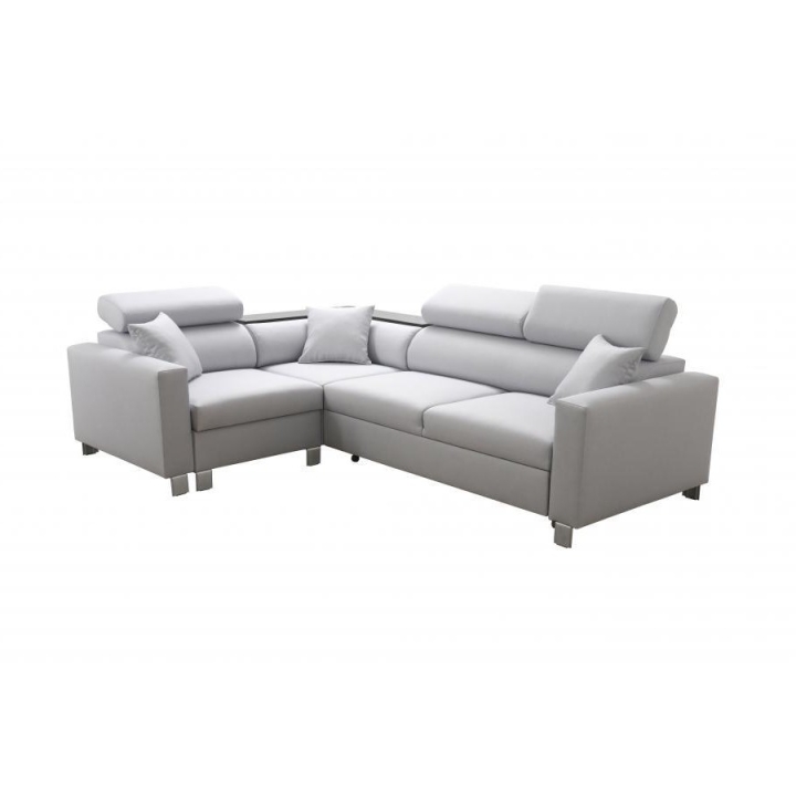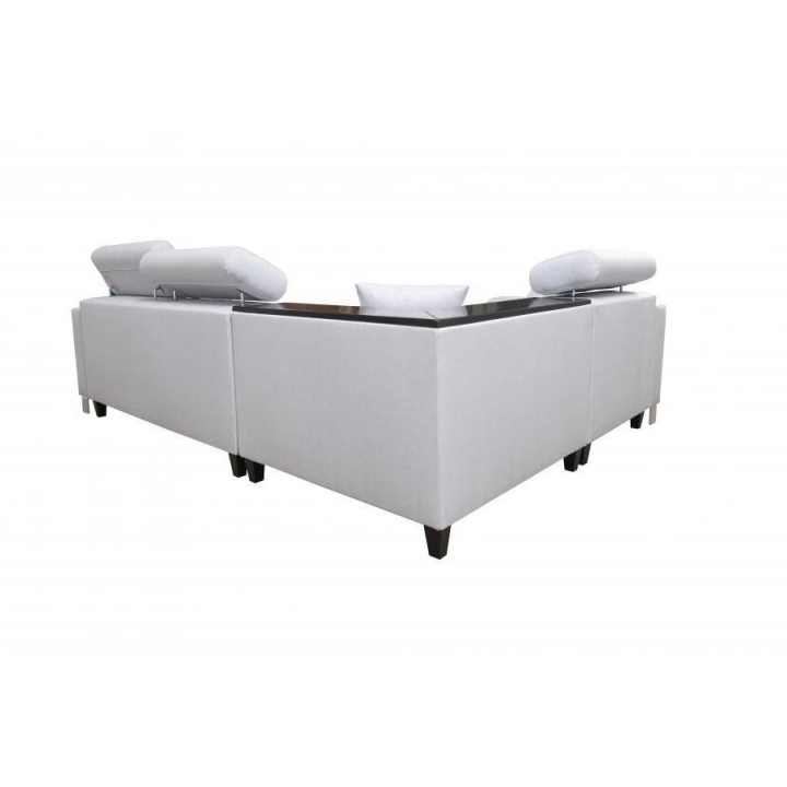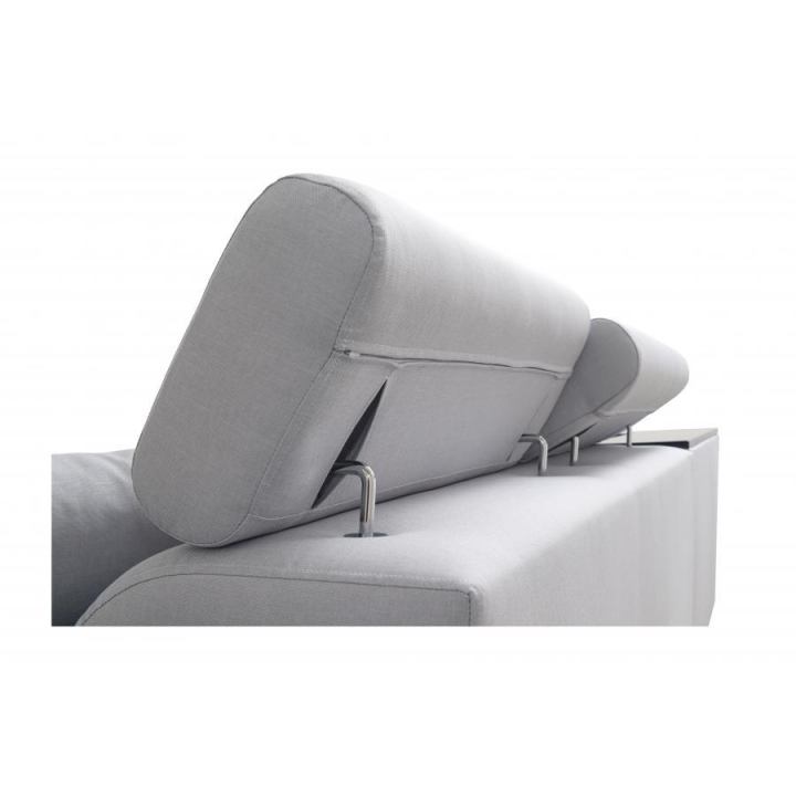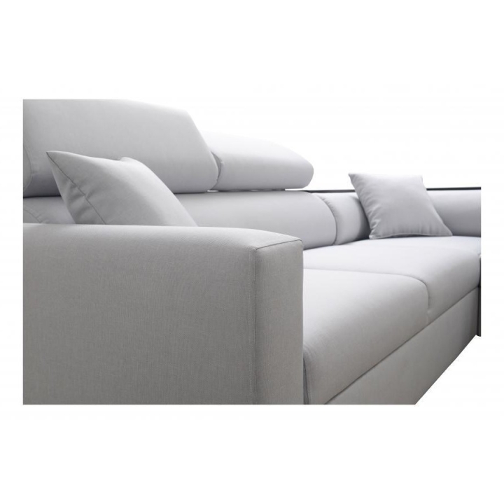 Użytkownicy docenią możliwość dopasowania mebla do swoich potrzeb dzięki trzem regulowanym zagłówkom oraz półce zintegrowanej w rogu narożnika, która służy do odłożenia drobnych przedmiotów. Funkcja spania pozwala na transformację mebla w przestrzeń wypoczynkową o powierzchni 210 x 127 cm. Pod segmentem siedziska umieszczono jeden pojemnik na pościel, co ułatwia utrzymanie porządku.