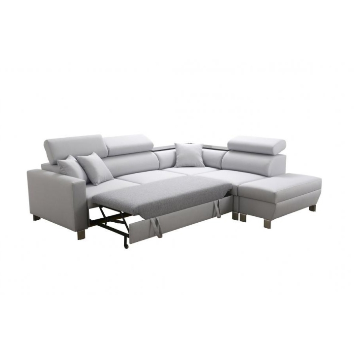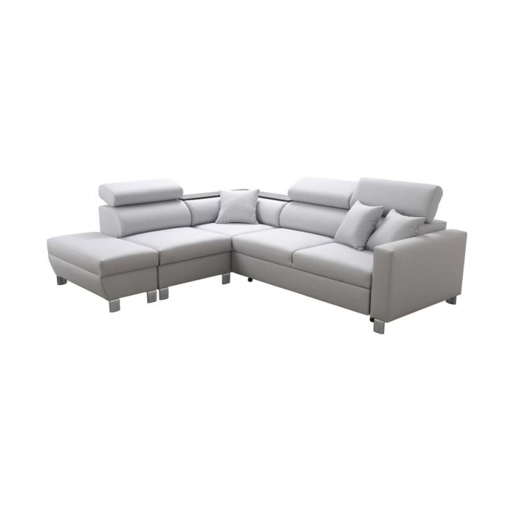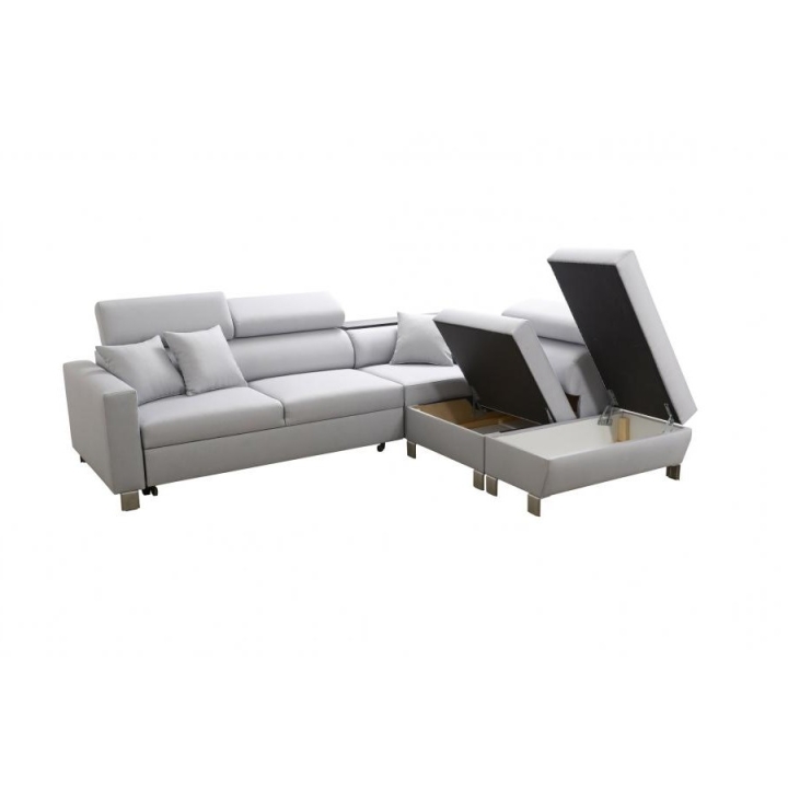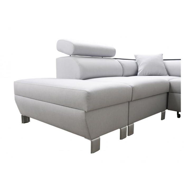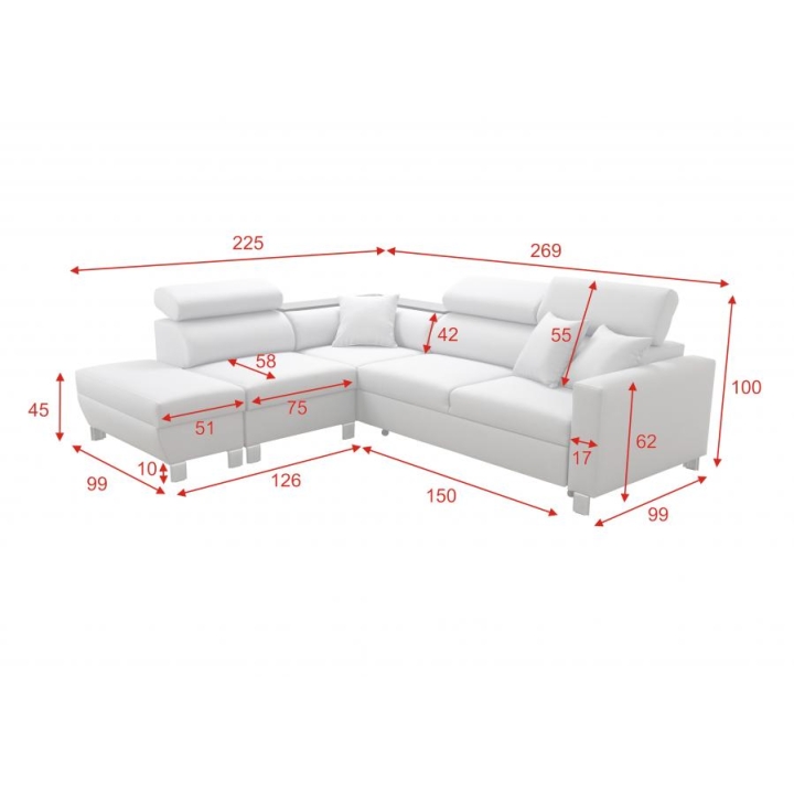 Loretti III charakteryzuje się rozbudowaną specyfikacją, która podnosi jego użyteczność w codziennym życiu. Model wyposażono w dwa niezależne pojemniki na pościel, co ułatwia organizację i przechowywanie. Ponadto, w narożnej sekcji mebla zintegrowana została praktyczna półka, dostępna w kolorach: czarnym, białym, olcha, buk lub venge. Krótszy bok narożnika ma głębokość 90 cm, a dłuższy bok 225 cm, co należy uwzględnić w planowaniu rozmieszczenia.