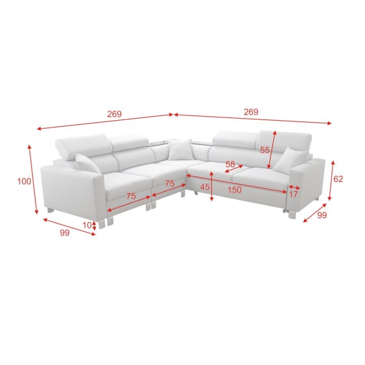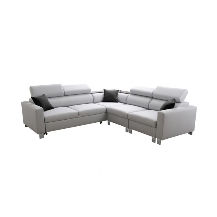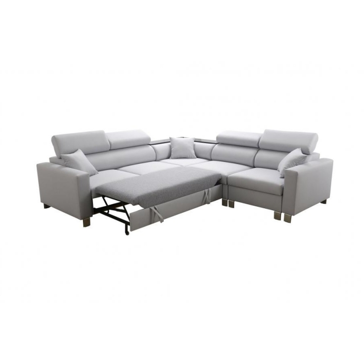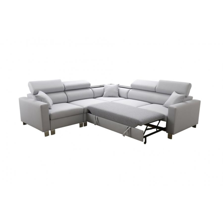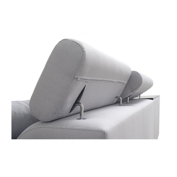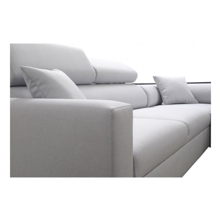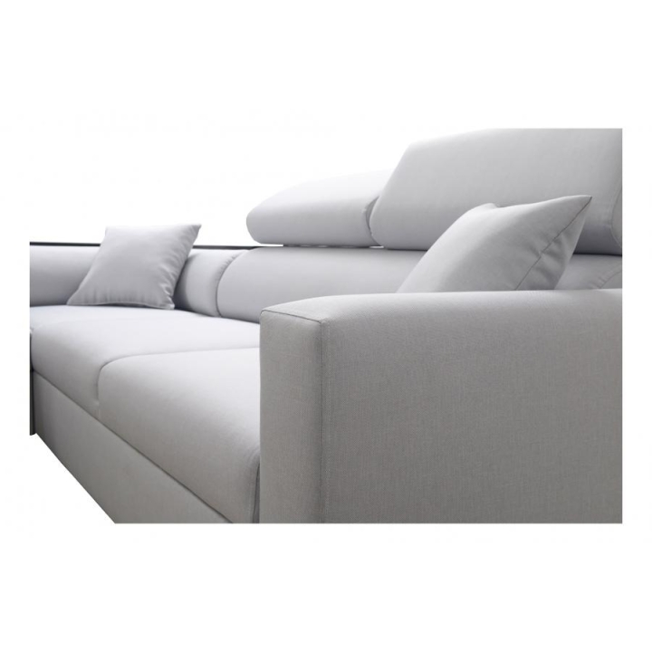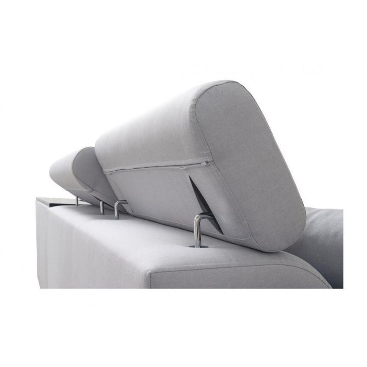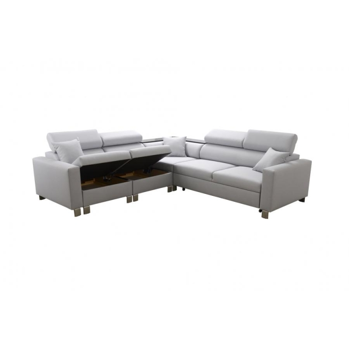 Narożnik wyposażono w szereg udogodnień podnoszących jego wartość użytkową. Posiada cztery regulowane zagłówki, które pozwalają na indywidualne dostosowanie wysokości podparcia do potrzeb użytkownika. Pod powierzchnią siedzącą zaimplementowano dwa pojemniki na pościel, oferując dyskretne miejsce do przechowywania. Elementem wyróżniającym jest półka w rogu, która pełni funkcję pomocniczego blatu.