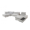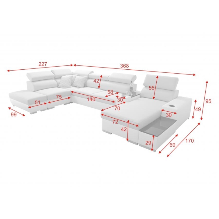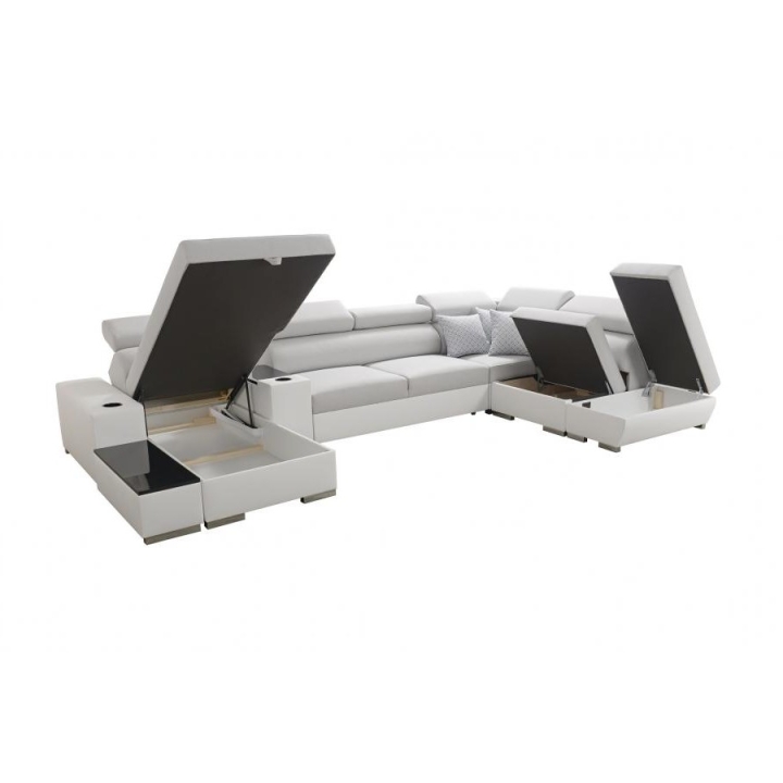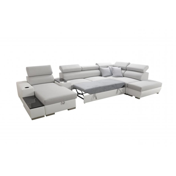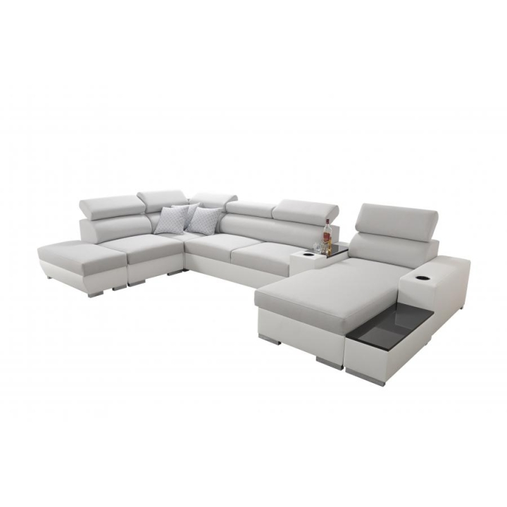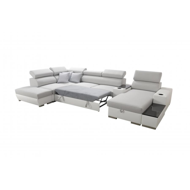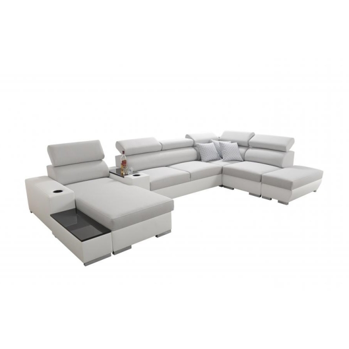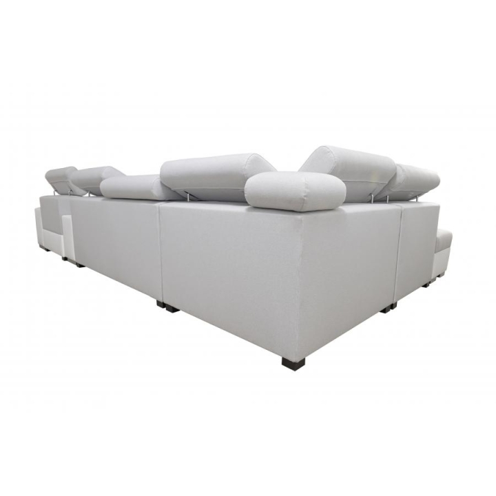 Mebel zawiera 6 regulowanych zagłówków, które pozwalają na dopasowanie stopnia podparcia głowy. Do dyspozycji znajdują się także 3 pojemniki na pościel, ułatwiające organizację przestrzeni. Dodatkowe wyposażenie obejmuje otwierany barek, uchwyty na kubek oraz ruchomą dostawkę, która zwiększa komfort korzystania z narożnika.