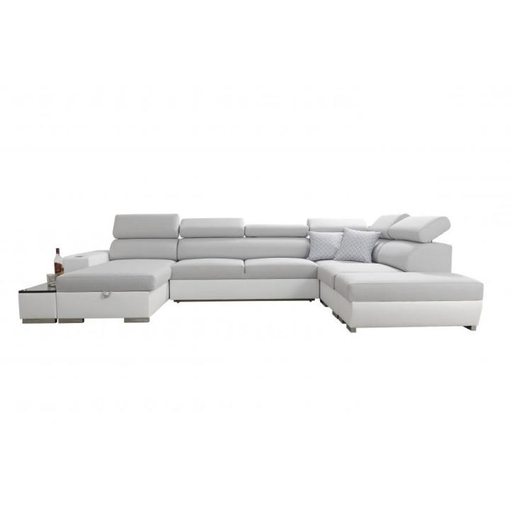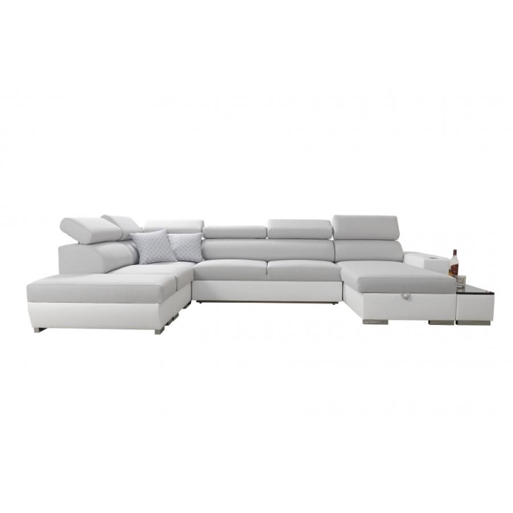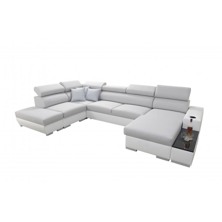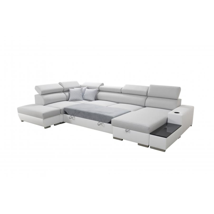 W wyposażeniu mebla znajdują się m.in. 6 regulowanych zagłówków, które pozwalają dopasować oparcie do indywidualnych potrzeb użytkownika. Do dyspozycji pozostają także 3 pojemniki na pościel, umożliwiające uporządkowane przechowywanie dodatków tekstylnych. Uzupełnieniem konstrukcji jest otwierany barek, uchwyty na kubek oraz ruchoma dostawka, dzięki której można rozszerzyć powierzchnię użytkową w zależności od sytuacji.