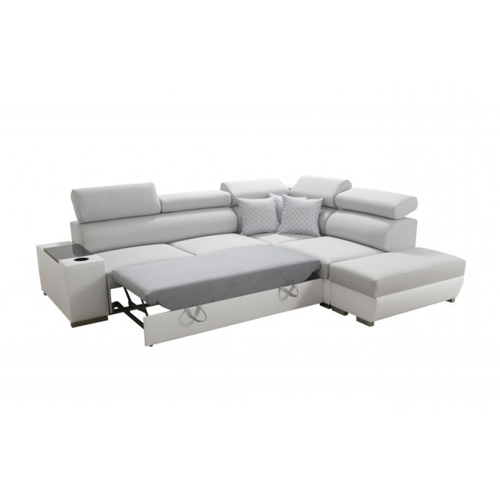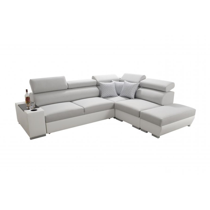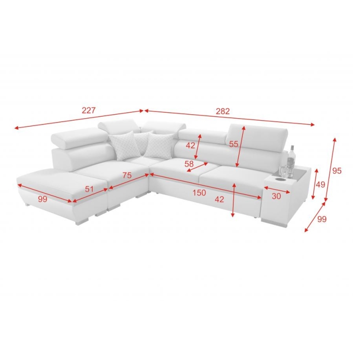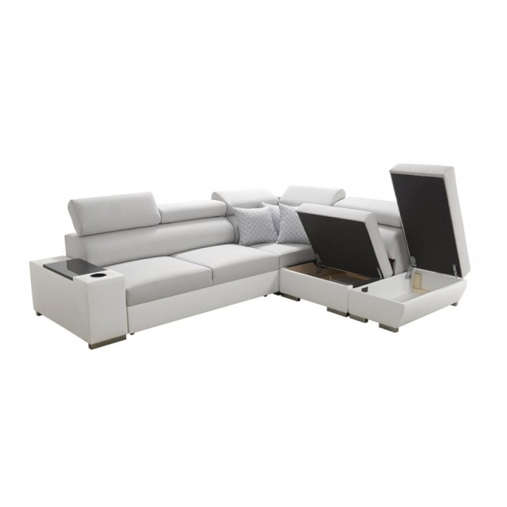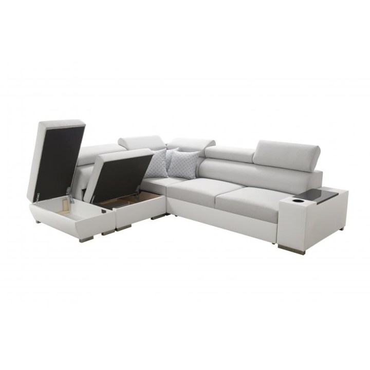 W konstrukcję narożnika wkomponowano 5 regulowanych zagłówków, dzięki którym można dopasować oparcie do indywidualnych potrzeb. Dwa pojemniki na pościel ułatwiają organizację przestrzeni, natomiast otwierany barek oraz uchwyt na kubek zwiększają komfort korzystania z mebla podczas codziennych aktywności. Tak rozbudowane wyposażenie czyni Perseon VII propozycją odpowiednią do nowoczesnych wnętrz wymagających wysokiego poziomu wygody.
