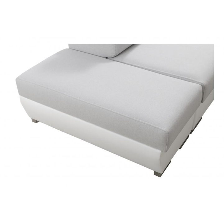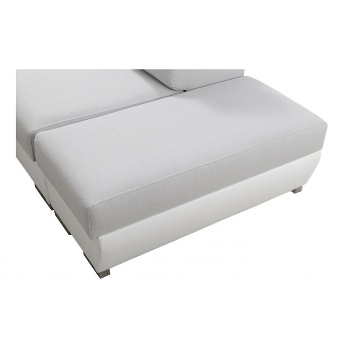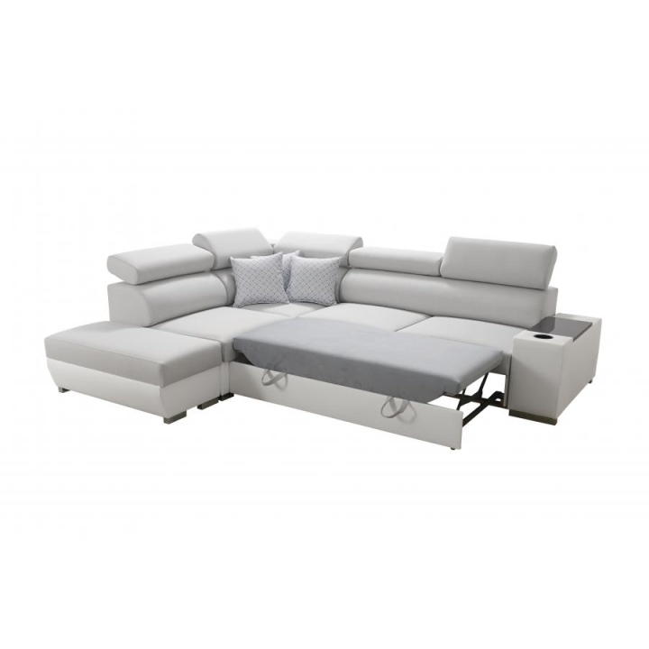 Całość wykonano z materiałów cenionych za trwałość: wzmocniony stelaż z ramy drewnianej i płyty wiórowej, sprężyny faliste, a także pianka T-30/40 o grubości 10 cm w siedzisku i około 7 cm w powierzchni spania zapewniają odpowiednie podparcie. Tkaniny wykorzystane do obicia należą do grupy materiałów o najwyższej jakości, co podkreśla staranne wykończenie mebla. Do wyboru pozostają również stopki: chromowane lub matowe czarne (za dopłatą), a otwór na kubek można zamówić w kolorze czarnym albo srebrnym.