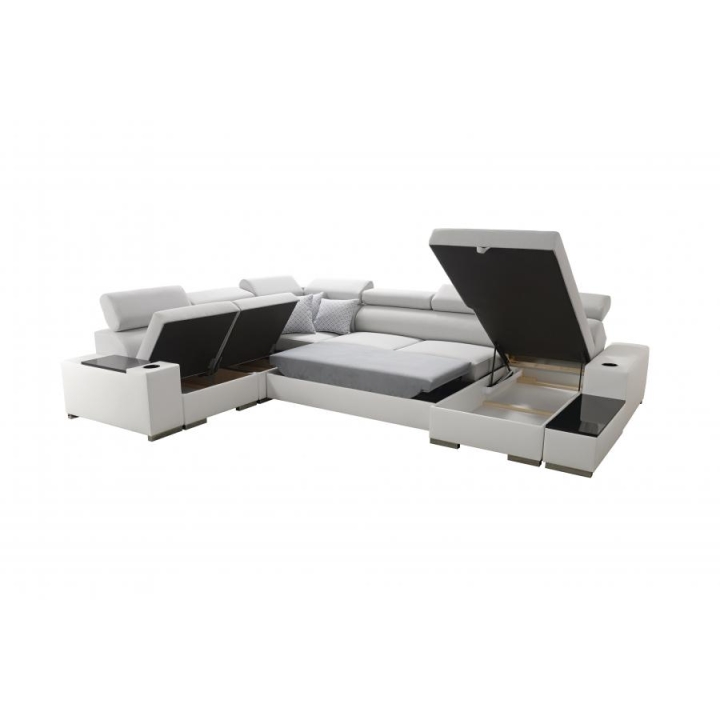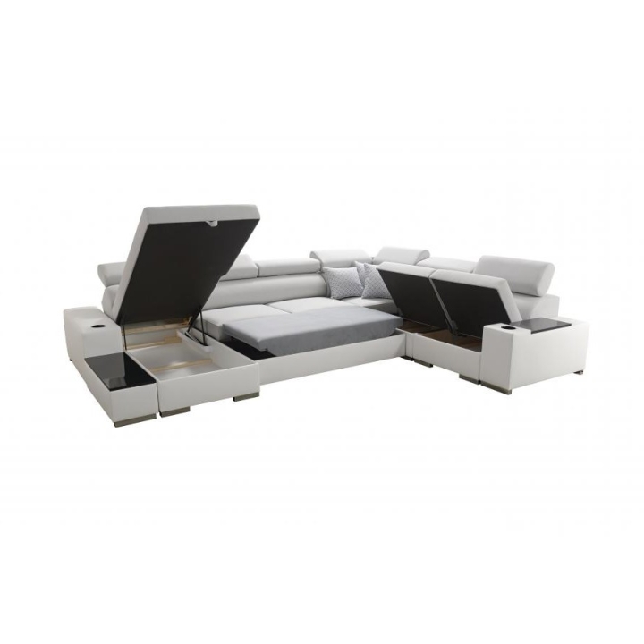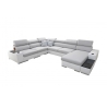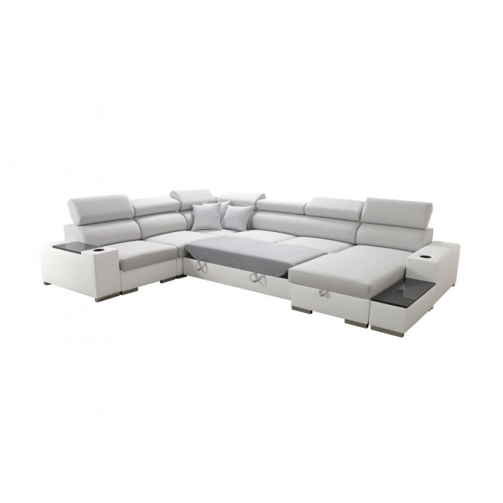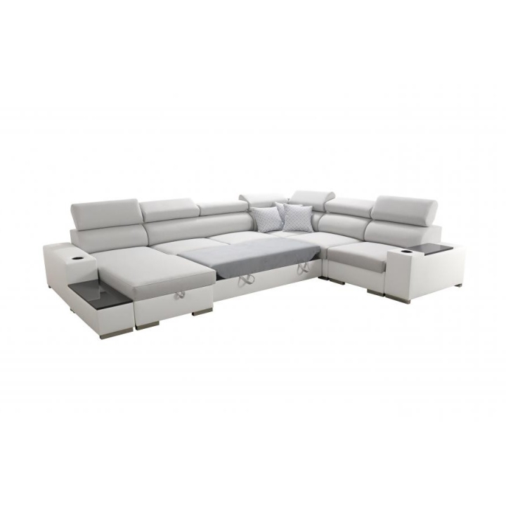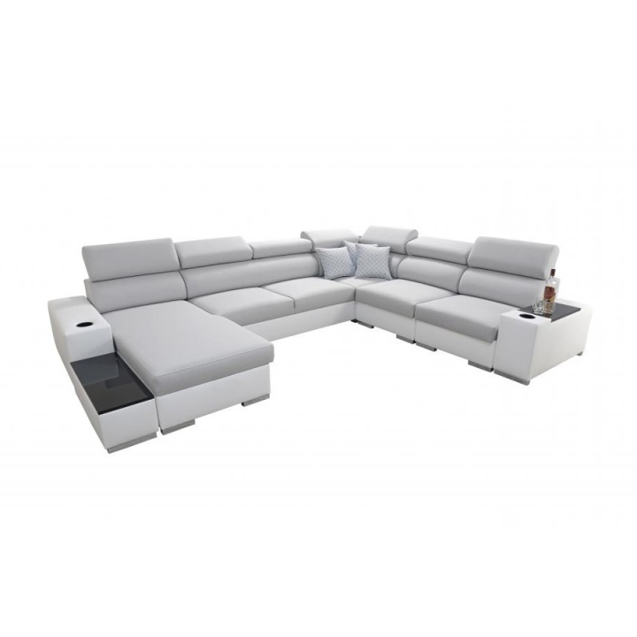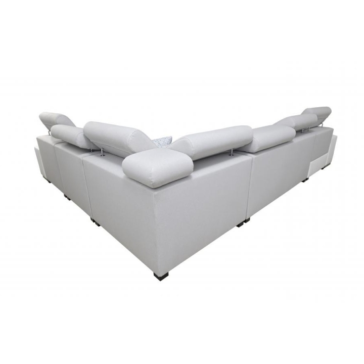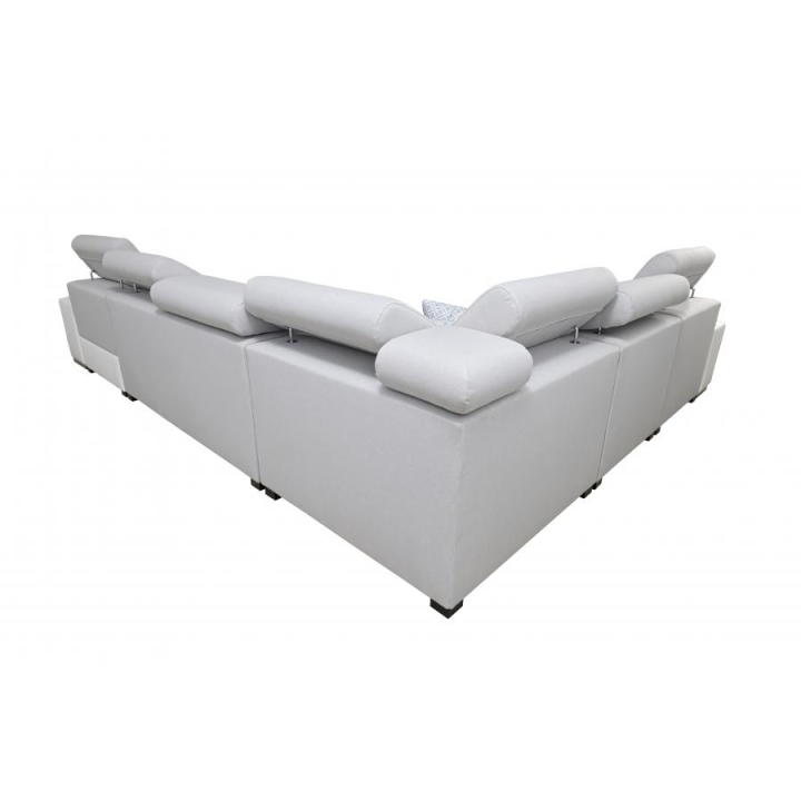 Wyposażenie narożnika obejmuje 7 regulowanych zagłówków, 3 pojemniki na pościel, a także otwierany barek oraz uchwyty na kubek, co sprzyja wygodnemu korzystaniu z mebla na co dzień. W zestawie znajduje się również ruchoma dostawka, umożliwiająca dopasowanie układu siedziska do bieżących potrzeb użytkownika. Dodatkowym atutem są poduszki widoczne na zdjęciu – dostępne w komplecie bez dopłaty.