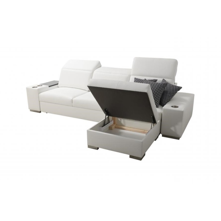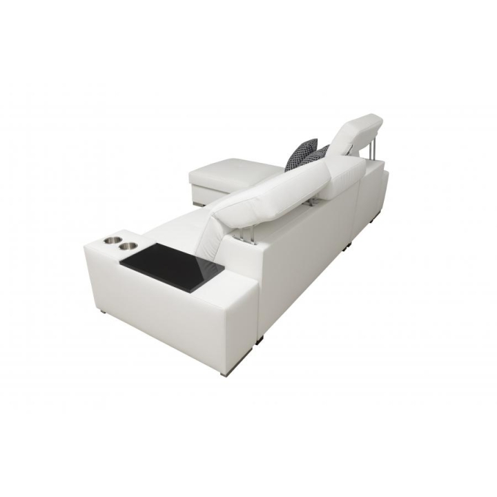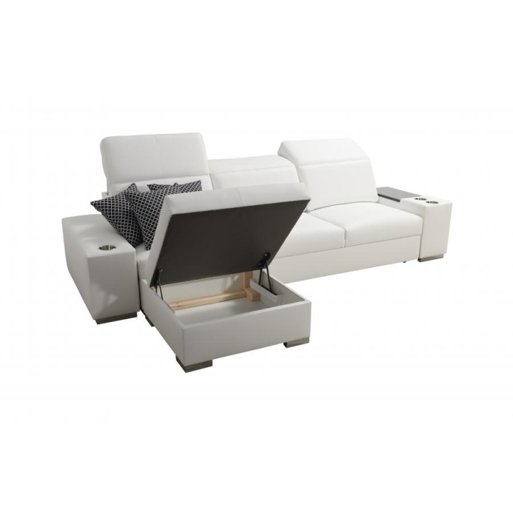 Konstrukcja narożnika opiera się na 3 regulowanych zagłówkach, które pozwalają na dostosowanie kąta nachylenia oparcia głowy. Wewnątrz mebla znajduje się 1 pojemnik na pościel, ułatwiający przechowywanie dodatkowych tekstyliów. Zestaw obejmuje również otwierany barek, a leżanka została zaprojektowana z dwóch części – pufy oraz siedziska – co poszerza możliwości użytkowania.