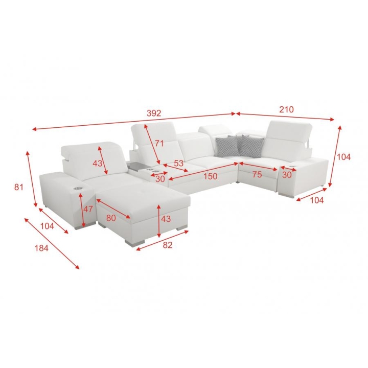 Wysokość narożnika mieści się w przedziale od 81 cm do 104 cm, dzięki czemu możliwe jest dostosowanie oparcia do preferencji osoby siedzącej. Zastosowano tu 6 regulowanych zagłówków, wpływających na odpowiednie podparcie odcinka szyjnego. Wysokość siedziska wynosi 43 cm, co sprzyja wygodnej pozycji zarówno podczas odpoczynku, jak i czytania czy oglądania telewizji.