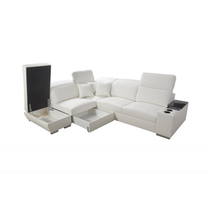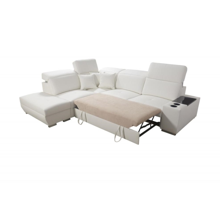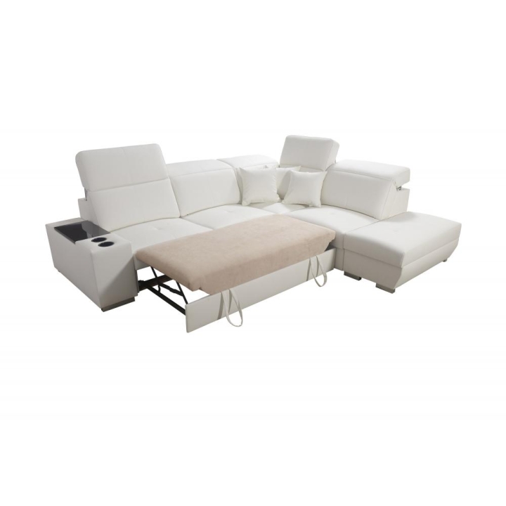 Narożnik oferuje liczne rozwiązania podnoszące wygodę przechowywania, w tym 2 pojemniki na pościel oraz otwierany barek. Do mebla dołączone są poduszki widoczne na zdjęciu – gratis, co stanowi dodatkowy atut kompletu. Całość opiera się na stopkach metalowych chromowanych, nadających konstrukcji solidności.