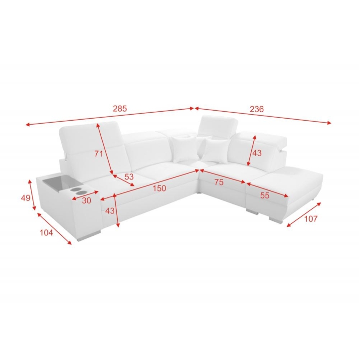 Narożnik Ricto VII Brattex został zaprojektowany jako model w kształcie litery L, dostępny w wersji prawo- lub lewostronnej, co umożliwia dopasowanie go do układu pomieszczenia. Jego szerokość wynosi 285 cm, natomiast głębokość oraz dłuższy bok mierzą 236 cm. Krótszy bok osiąga 104 cm, co tworzy wyważoną bryłę o proporcjach sprzyjających komfortowi użytkowania.