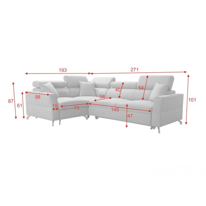 Wymiary narożnika — szerokość 271 cm, głębokość 193 cm, wysokość 101 cm, a także dłuższy bok 193 cm i krótszy 98 cm — zapewniają harmonijne wykorzystanie przestrzeni. Odpowiednio zaprojektowana wysokość siedziska 47 cm sprzyja wygodnemu ułożeniu ciała podczas wypoczynku. Całość tworzy solidną konstrukcję, która pozwala na wieloletnie użytkowanie bez utraty pierwotnych właściwości.