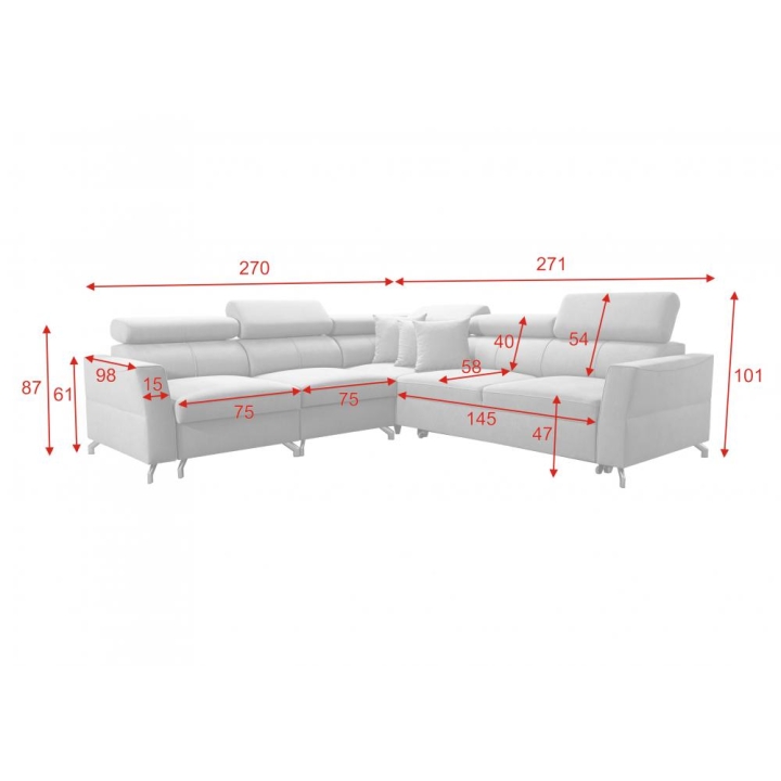 Szerokość narożnika wynosi 271 cm, natomiast jego głębokość i długość dłuższego boku to 270 cm, przy krótszym boku liczącym 98 cm. Oparcie osiąga wysokość 101 cm, a wysokość siedziska 47 cm zapewnia odpowiednie podparcie podczas siedzenia. Po rozłożeniu dostępna jest powierzchnia spania o wymiarach 210 × 127 cm, wspierana przez funkcję spania typu Delfin.