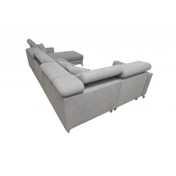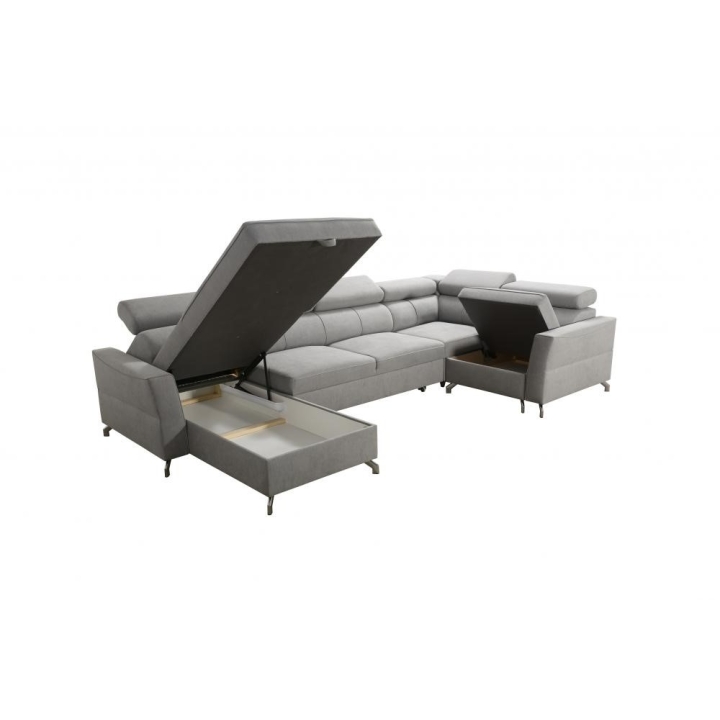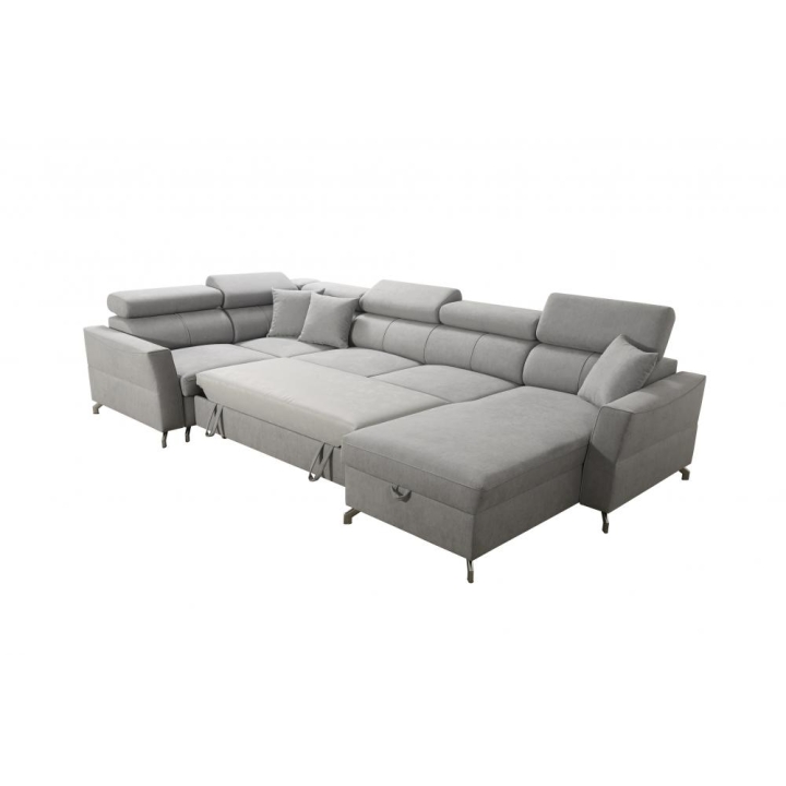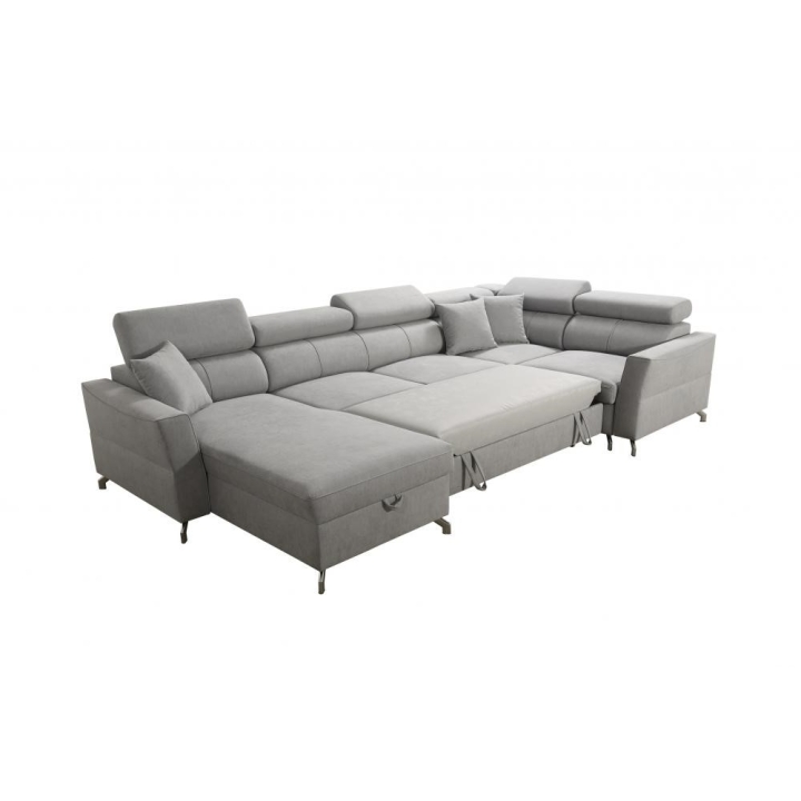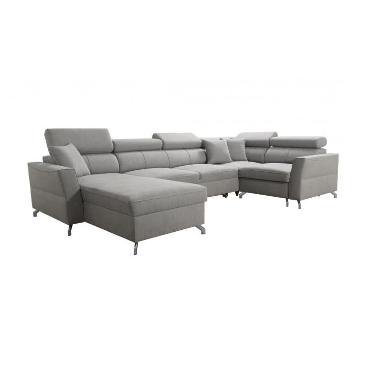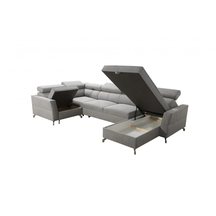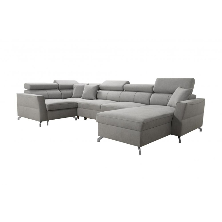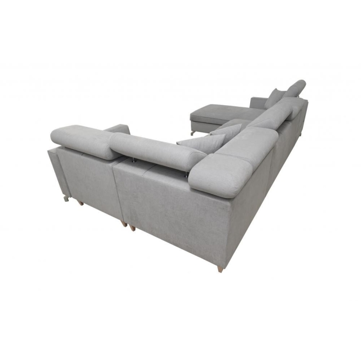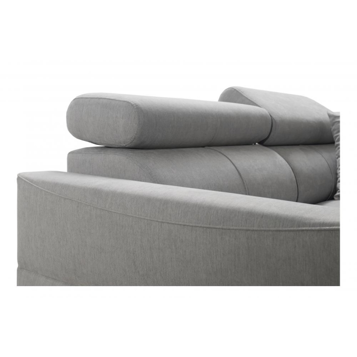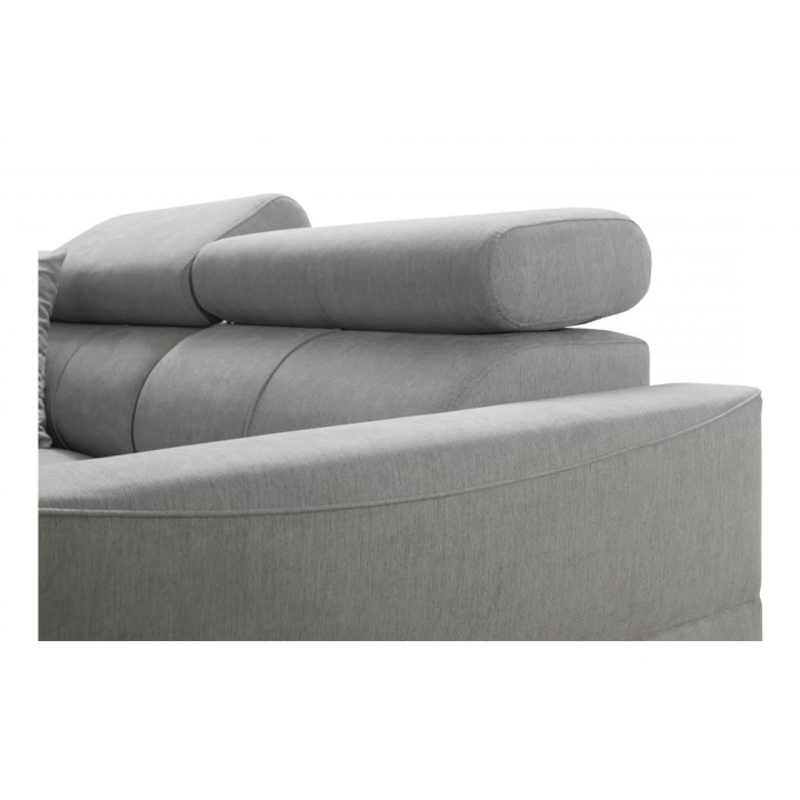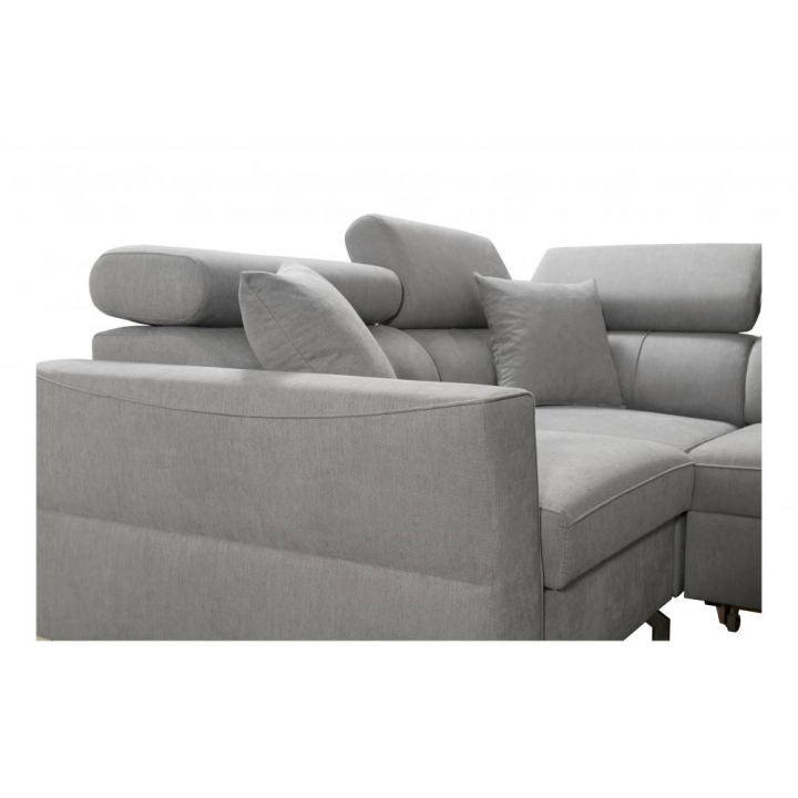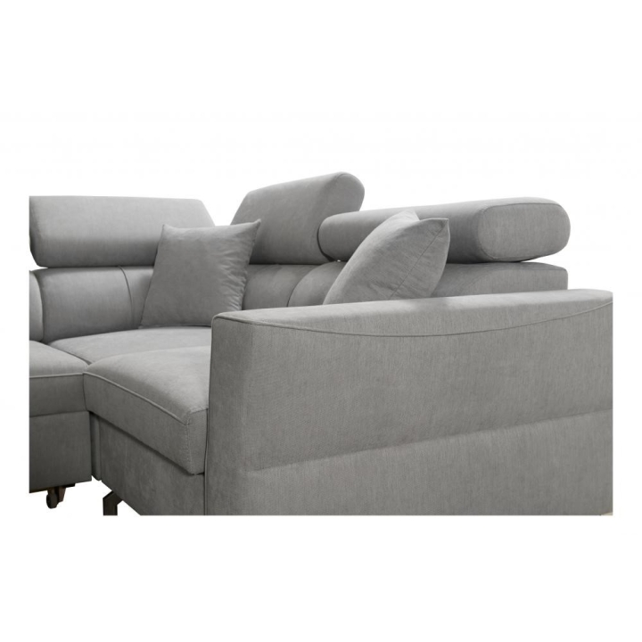 W zestawie znajdują się poduszki widoczne na zdjęciu – dostępne bez dodatkowych opłat, co podnosi walory użytkowe narożnika. Mebel posiada 5 regulowanych zagłówków, umożliwiających dostosowanie podparcia do indywidualnych oczekiwań. Dwa obszerne pojemniki na pościel pozwalają na utrzymanie porządku i wygodne przechowywanie tekstyliów.
