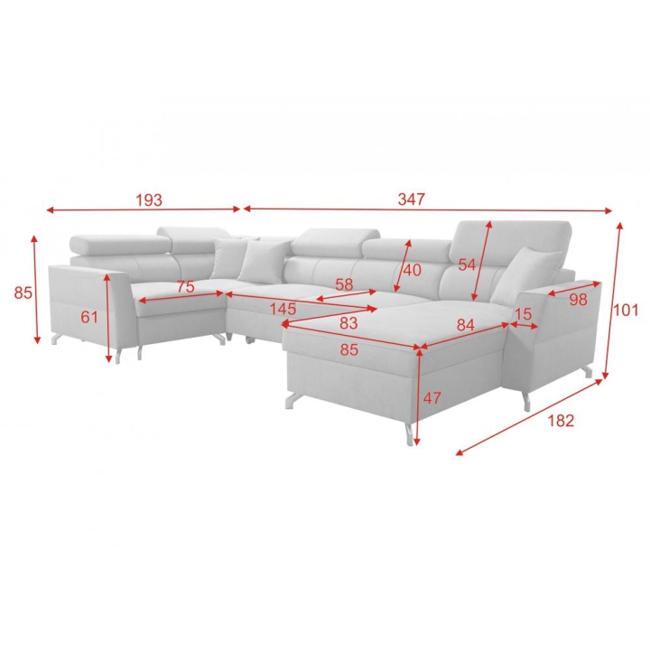 Narożnik Veno V Brattex to rozbudowany mebel wypoczynkowy w kształcie litery U, dostępny w wersji prawo- lub lewostronnej. Konstrukcja o szerokości 347 cm, głębokości 193 cm oraz wysokości 101 cm zapewnia odpowiednio dużą przestrzeń do codziennego użytkowania. Zróżnicowane proporcje – dłuższy bok 193 cm oraz krótszy bok 182 cm – umożliwiają dopasowanie narożnika do wielu typów pomieszczeń.