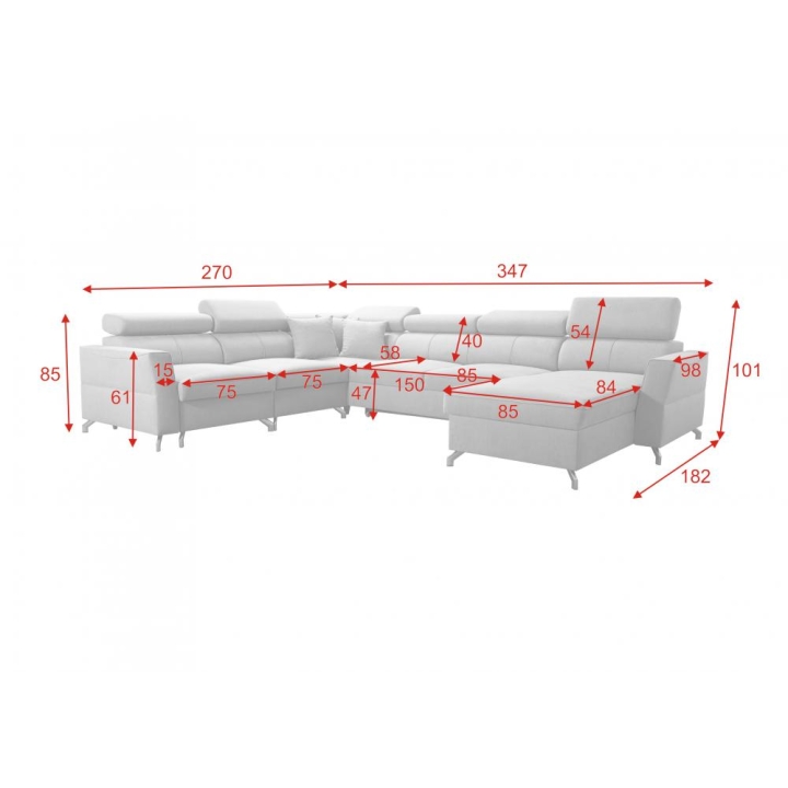 Narożnik Veno VII Brattex to rozbudowana propozycja wypoczynkowa o układzie U, dostępna w wersji prawo- lub lewostronnej. Model wyróżnia się imponującą szerokością 347 cm, a jego głębokość oraz dłuższy bok wynoszą 270 cm, przy czym krótszy bok mierzy 182 cm. Całość osiąga wysokość 101 cm, tworząc solidną i komfortową przestrzeń do codziennego użytkowania.