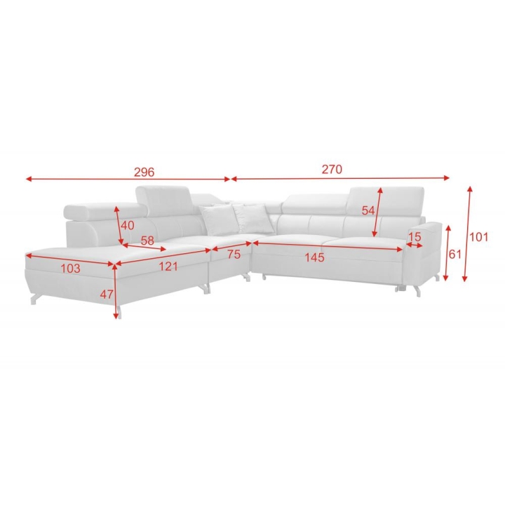 Narożnik Veno VIII Brattex to rozbudowany model w kształcie litery L, dostępny w wersji prawo- lub lewostronnej, który zapewnia odpowiednie zagospodarowanie przestrzeni wypoczynkowej. Jego proporcje – szerokość 270 cm, głębokość 296 cm, dłuższy bok 296 cm oraz krótszy bok 103 cm – sprzyjają komfortowemu rozmieszczeniu mebla w większych wnętrzach. Konstrukcja o wysokości 101 cm podkreśla solidność wykonania i zapewnia właściwe podparcie podczas codziennego użytkowania.