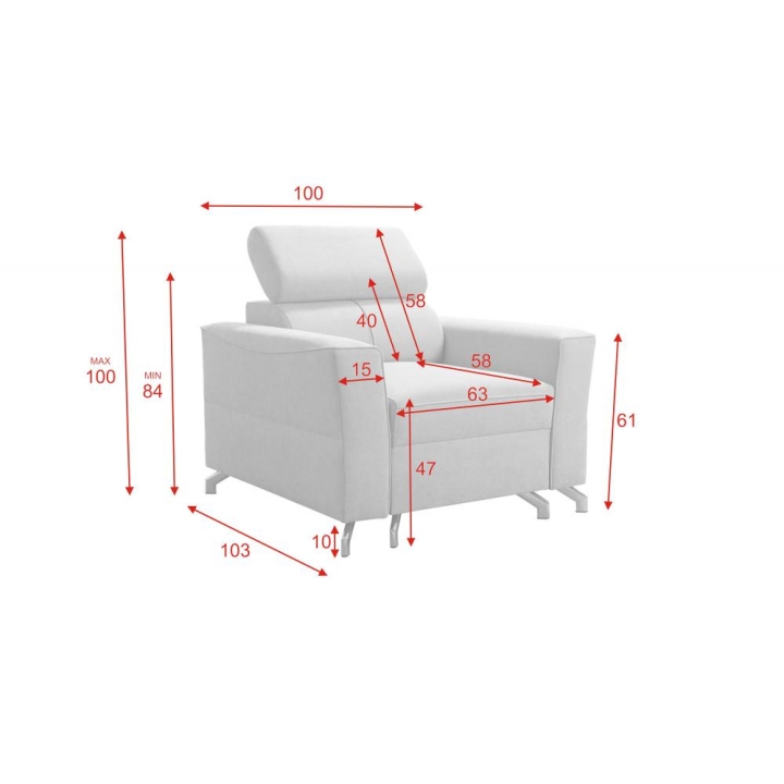 Wymiary fotela zostały dobrane tak, aby zapewnić wygodne użytkowanie: szerokość 100 cm, głębokość 103 cm, wysokość 100 cm. Siedzisko umieszczono na wysokości 47 cm, a jego szerokość wynosi 63 cm, co sprzyja swobodnemu ułożeniu ciała. Konstrukcja cechuje się stabilnością, dzięki czemu fotel sprawdza się zarówno w przestrzeniach domowych, jak i reprezentacyjnych.