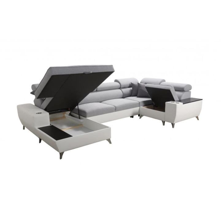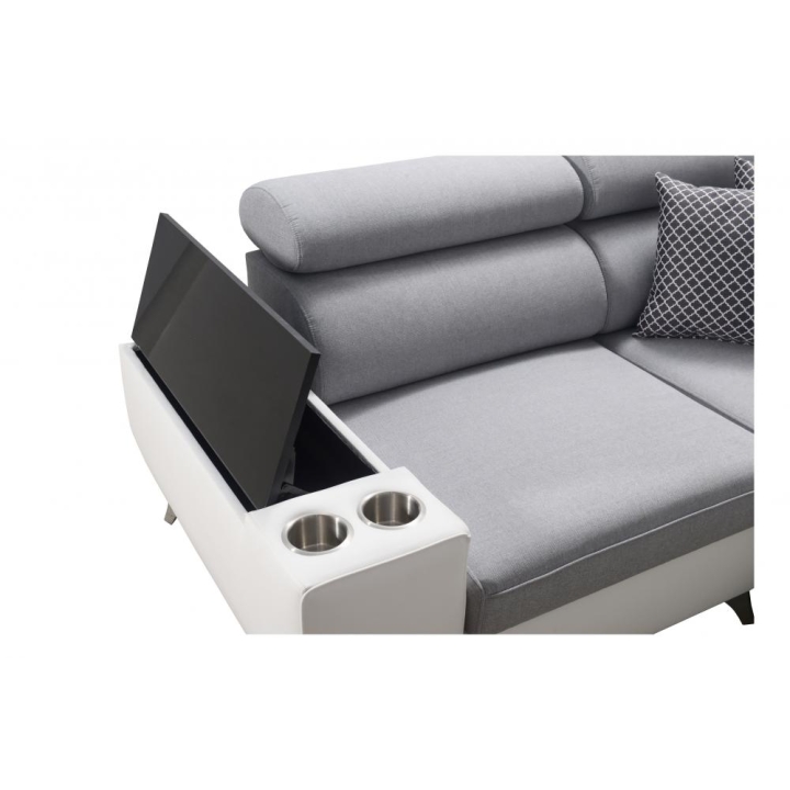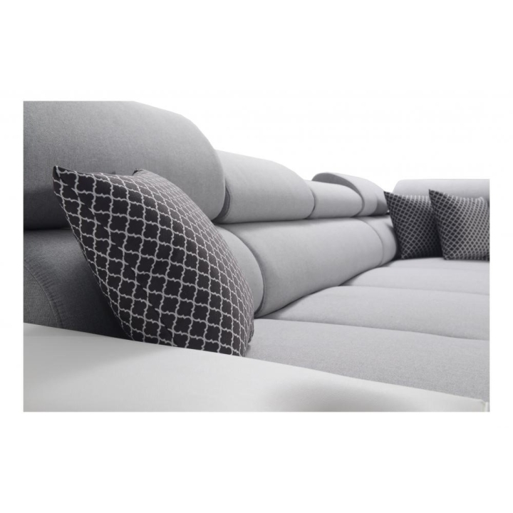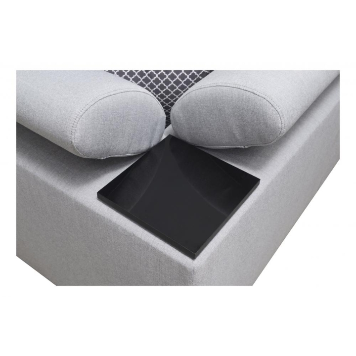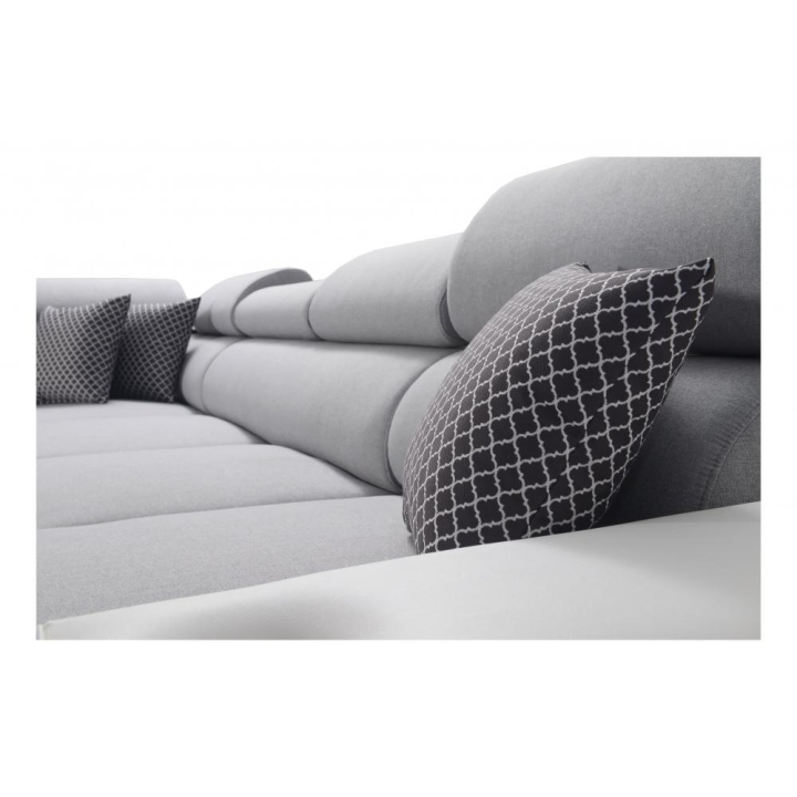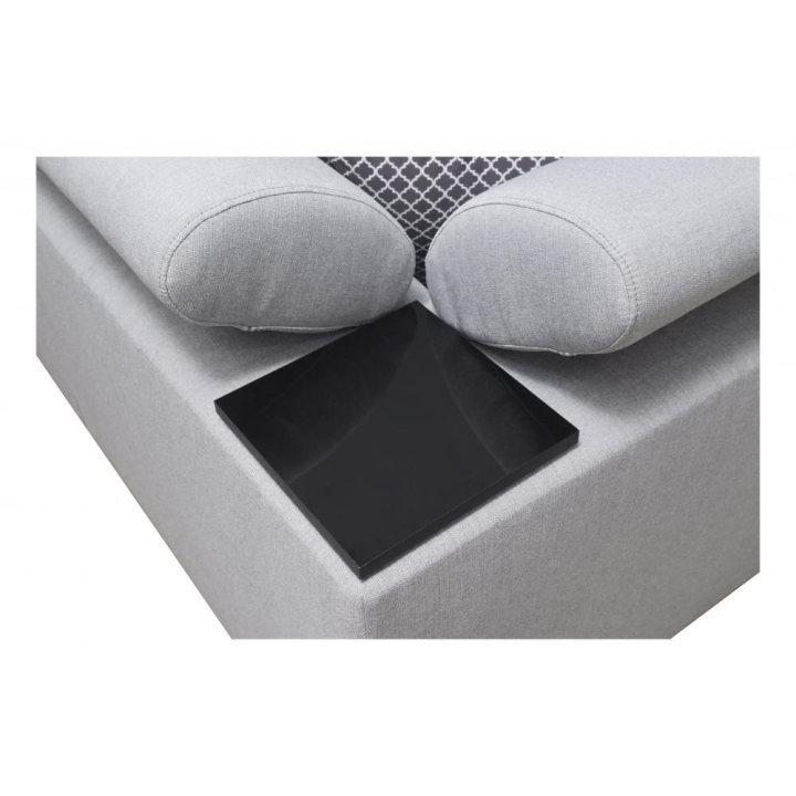 W standardowym wyposażeniu znajdują się 6 regulowanych zagłówków, które pozwalają na indywidualne ustawienie podparcia głowy. Mebel został uzupełniony o 2 pojemniki na pościel oraz otwierany barek, zwiększające zakres jego zastosowań. Poduszki widoczne na zdjęciu dołączane są gratis, bez dodatkowych kosztów.