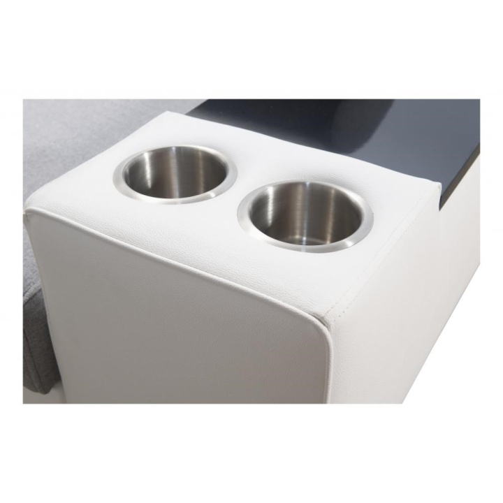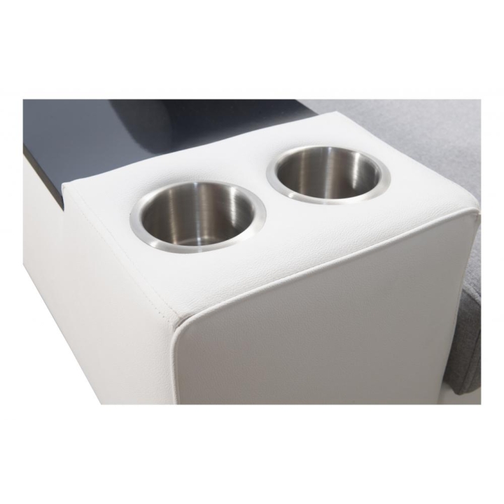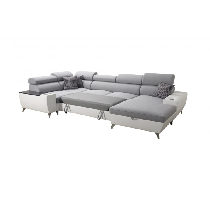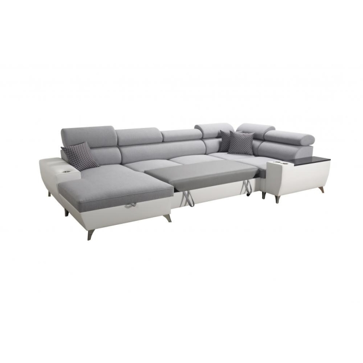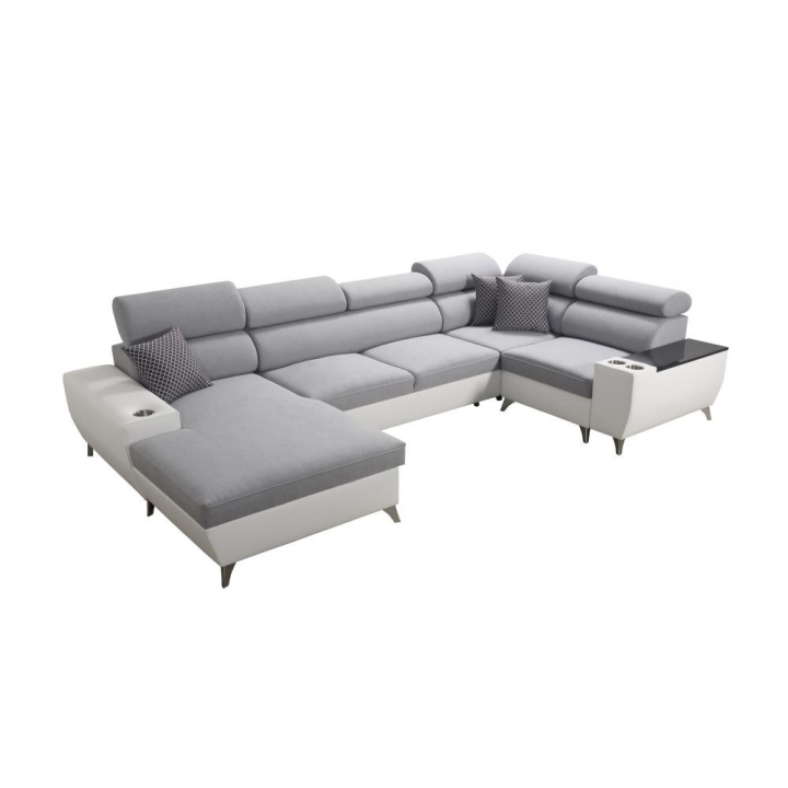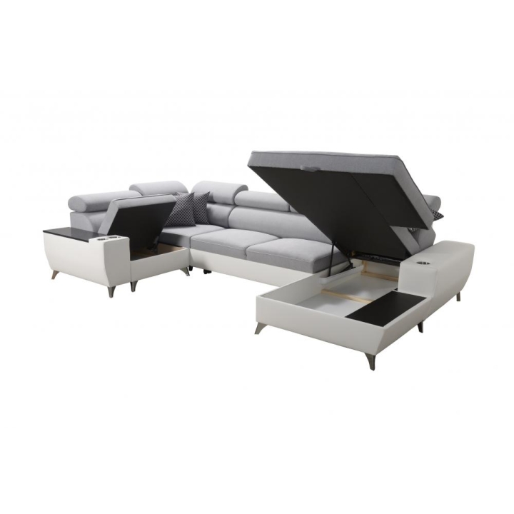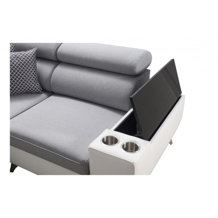 W standardowym wyposażeniu znajdują się 6 regulowanych zagłówków, które pozwalają na indywidualne ustawienie podparcia głowy. Mebel został uzupełniony o 2 pojemniki na pościel oraz otwierany barek, zwiększające zakres jego zastosowań. Poduszki widoczne na zdjęciu dołączane są gratis, bez dodatkowych kosztów.