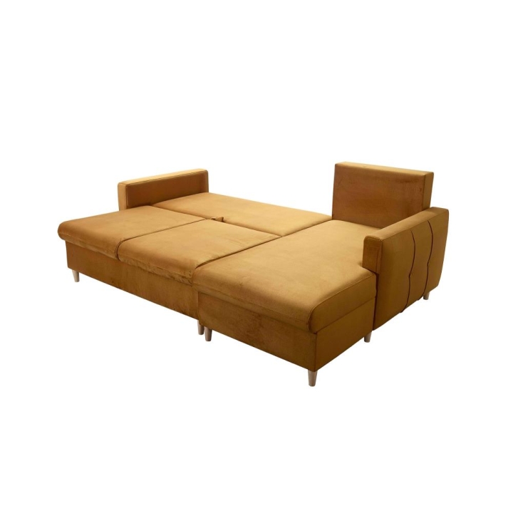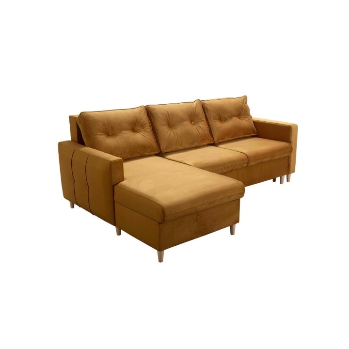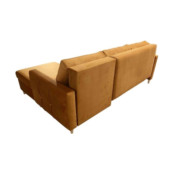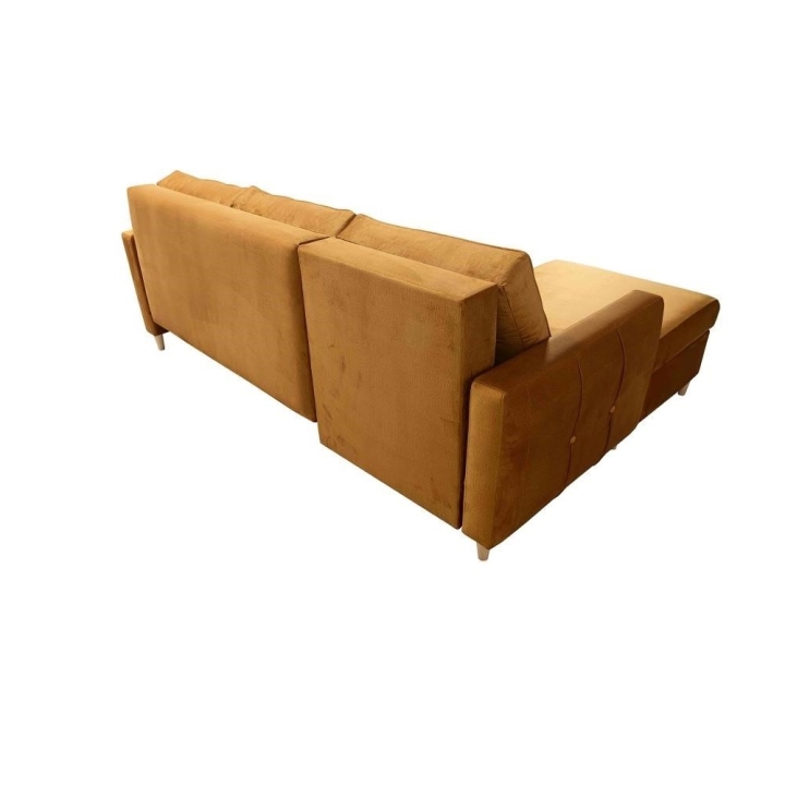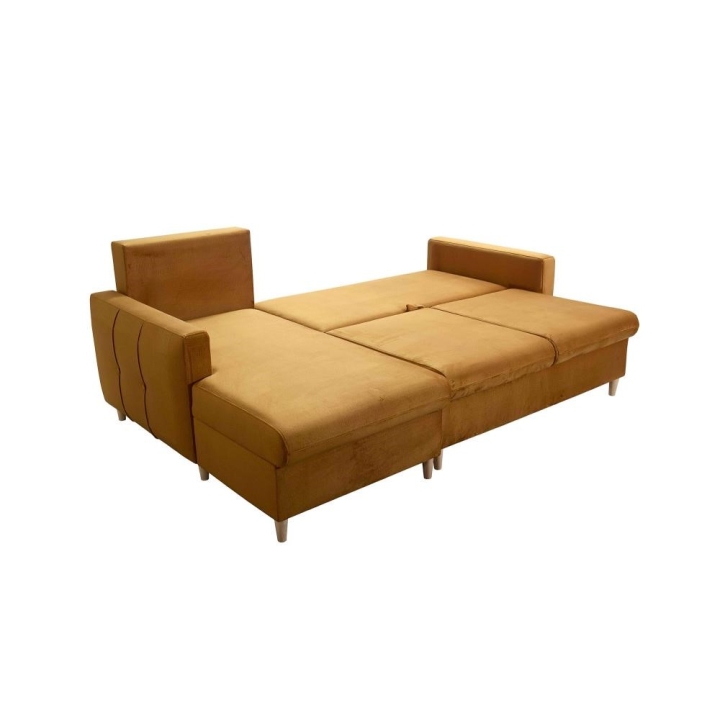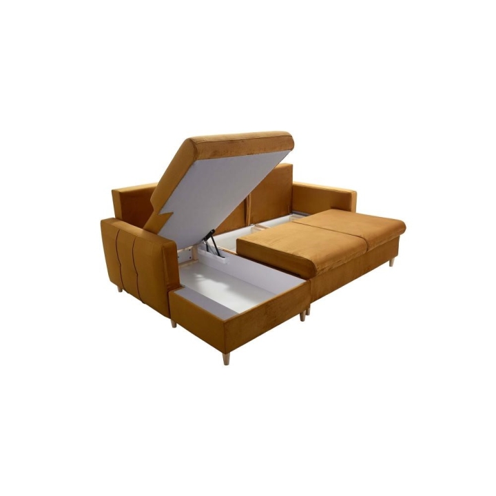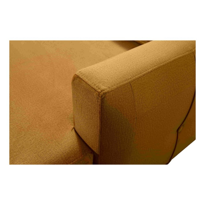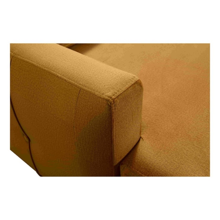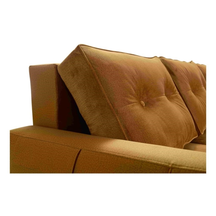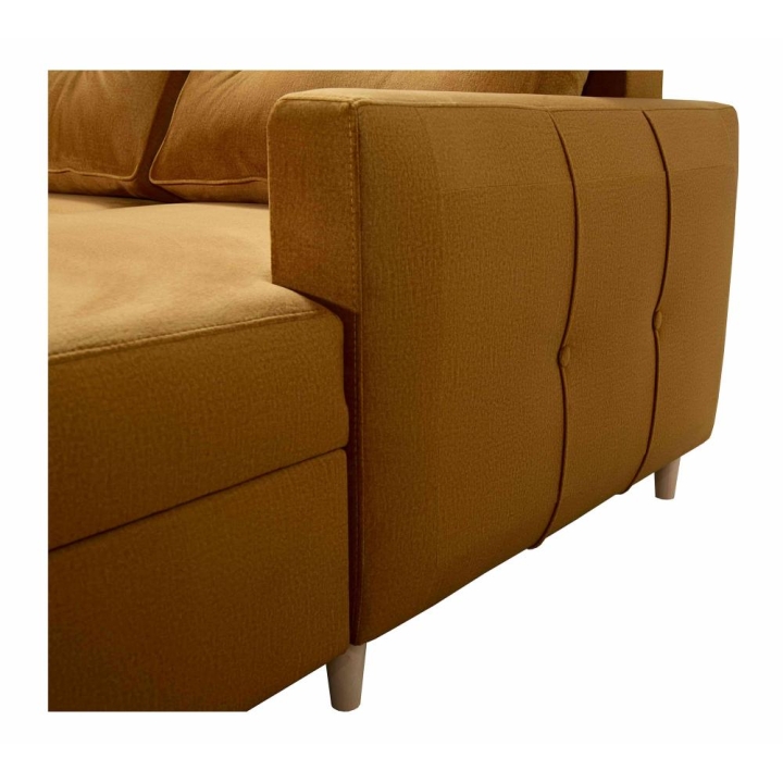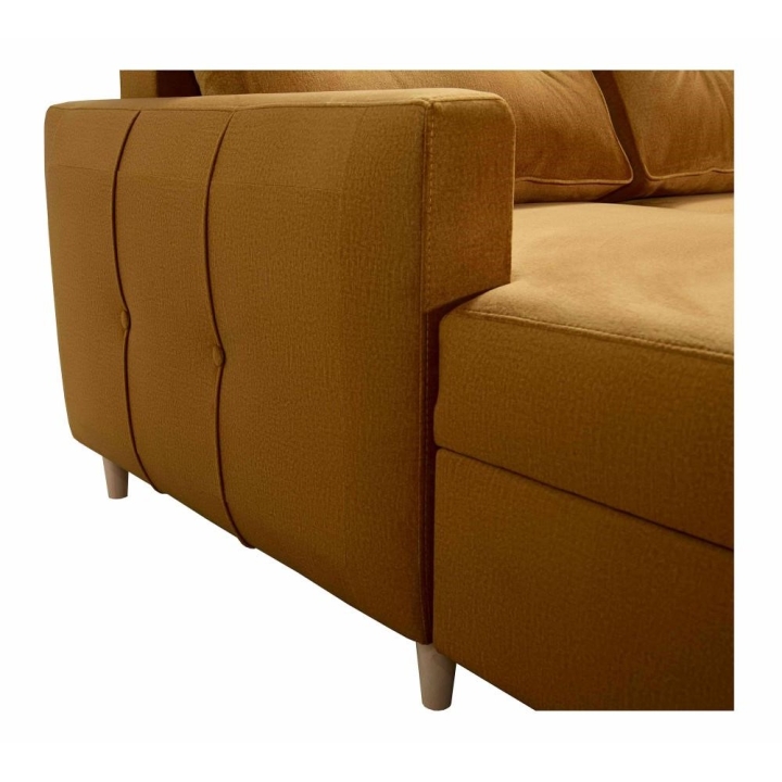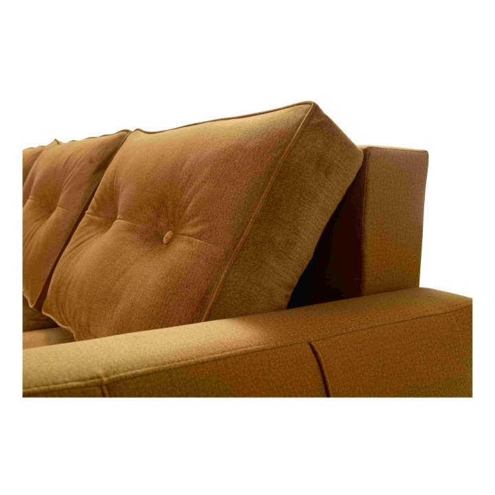 Wypełnienie siedzisk i oparć wykonano na sprężynach falistych oraz utwardzonej piance T-30, co wpływa na odpowiednią sprężystość i trwałość. Konstrukcję wzmacnia stelaż na ramie drewnianej łączonej z płytą wiórową, zapewniający stabilność całej bryły. Poduszki widoczne na zdjęciu są integralną częścią mebla i nie posiadają zamków, bez możliwości modyfikacji tego elementu.