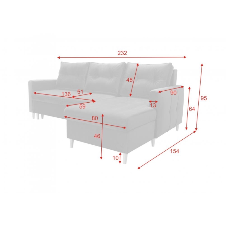 Wymiary narożnika wynoszą 232 cm szerokości, 154 cm głębokości oraz 95 cm wysokości, co zapewnia odpowiednie proporcje do codziennego użytkowania. Wysokość siedziska 46 cm sprzyja komfortowej pozycji podczas siedzenia. Krótszy bok o długości 90 cm pozwala na swobodne zagospodarowanie narożnej części mebla.
