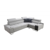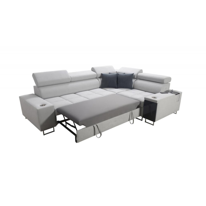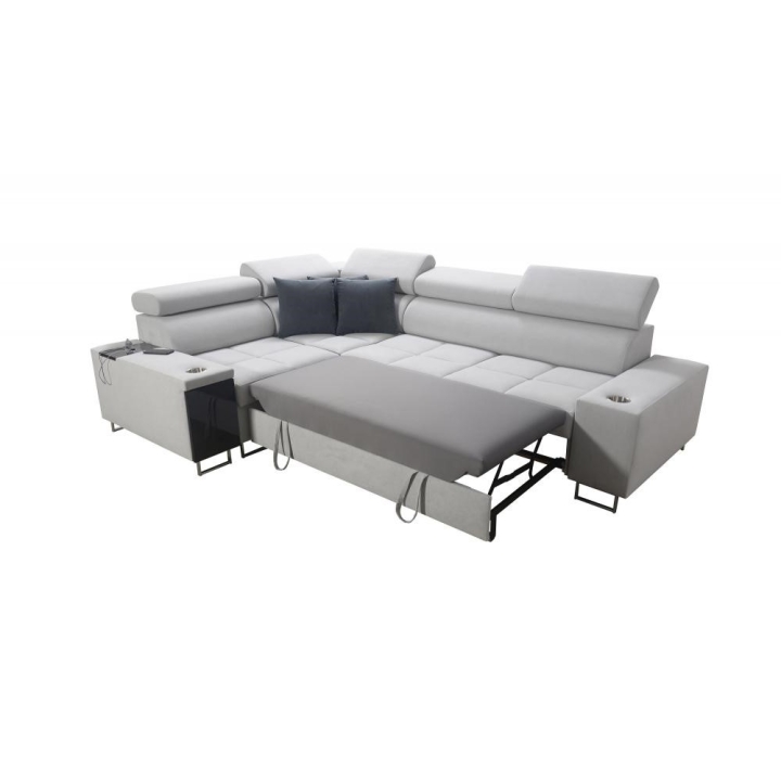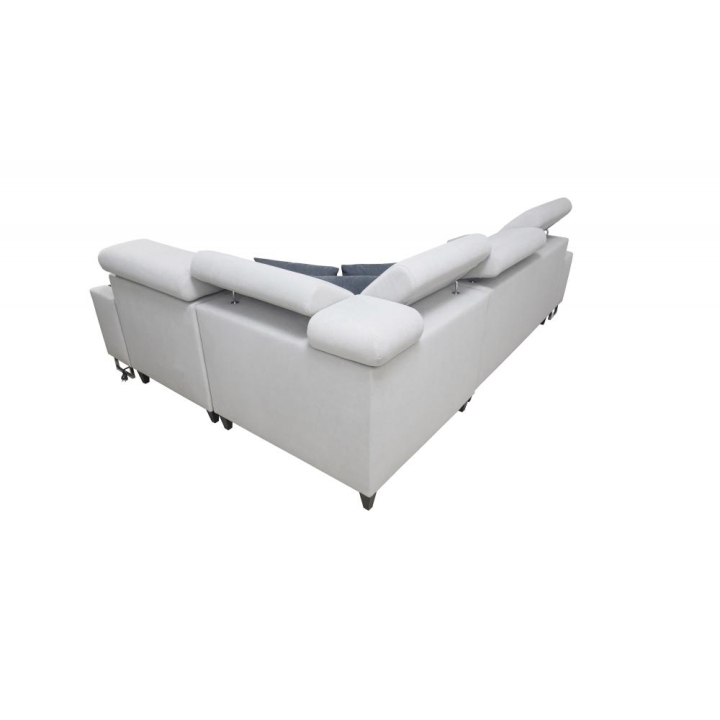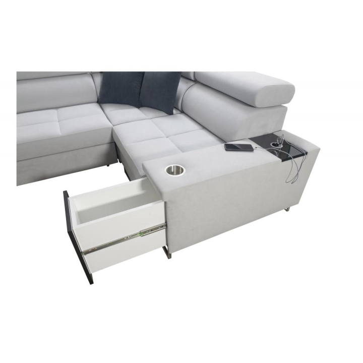 W wyposażeniu przewidziano 5 regulowanych zagłówków, które umożliwiają indywidualne ustawienie podparcia. Mebel posiada 1 pojemnik na pościel, otwierany barek, a także wejście pod USB i gniazdo elektryczne, dyskretnie wkomponowane w konstrukcję. Takie rozwiązania podnoszą komfort codziennego użytkowania bez ingerencji w spójną formę narożnika.