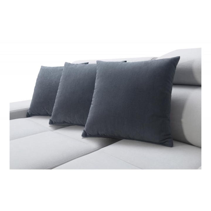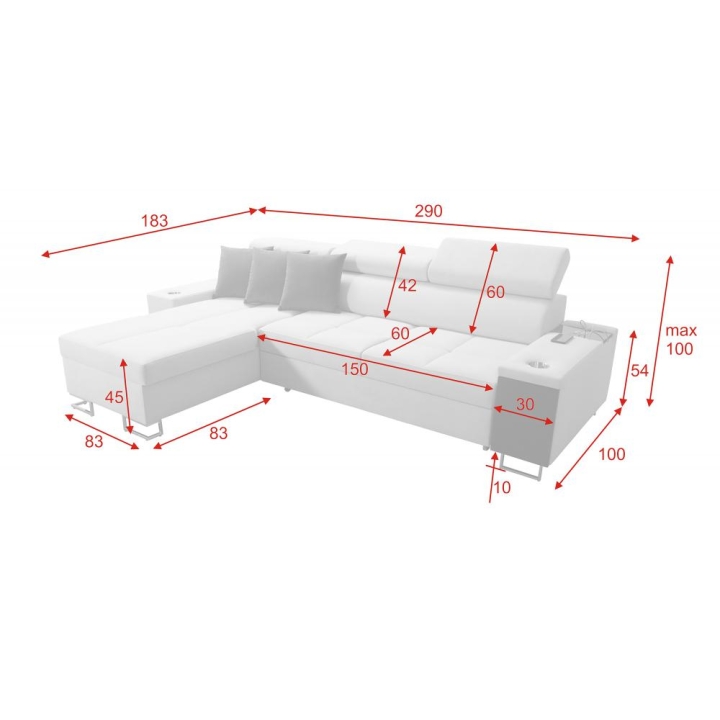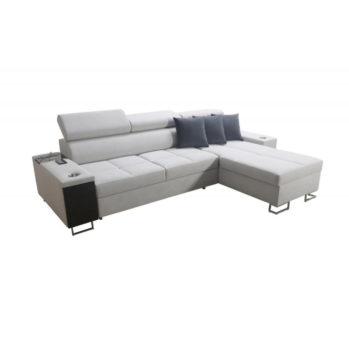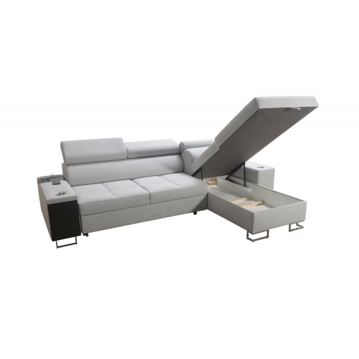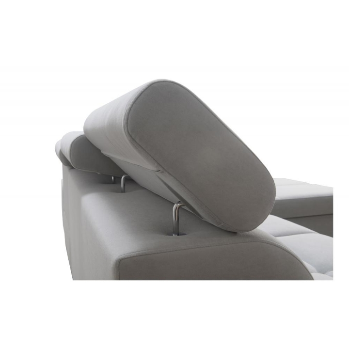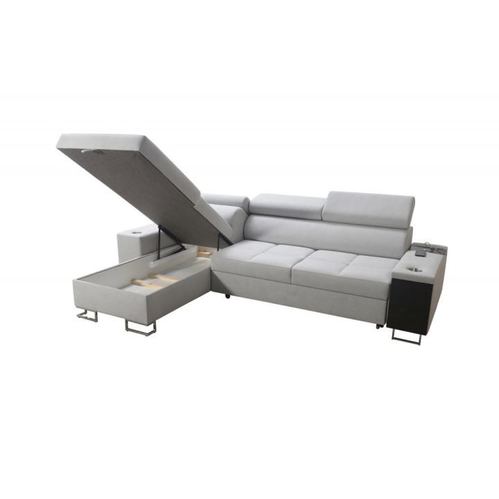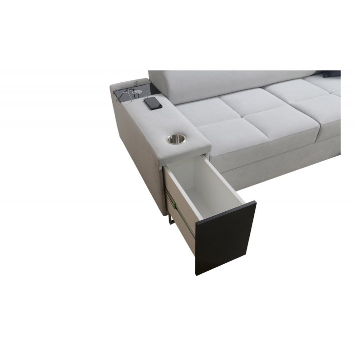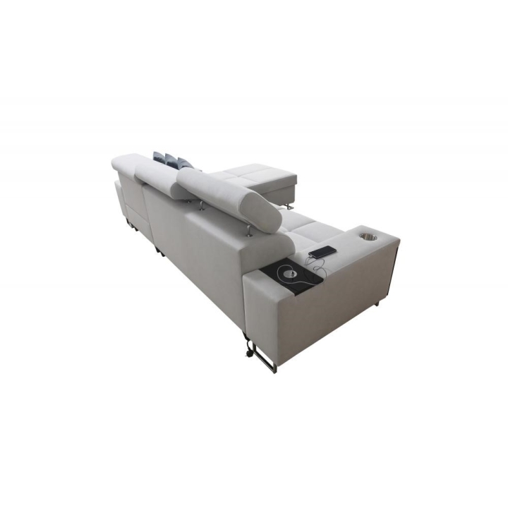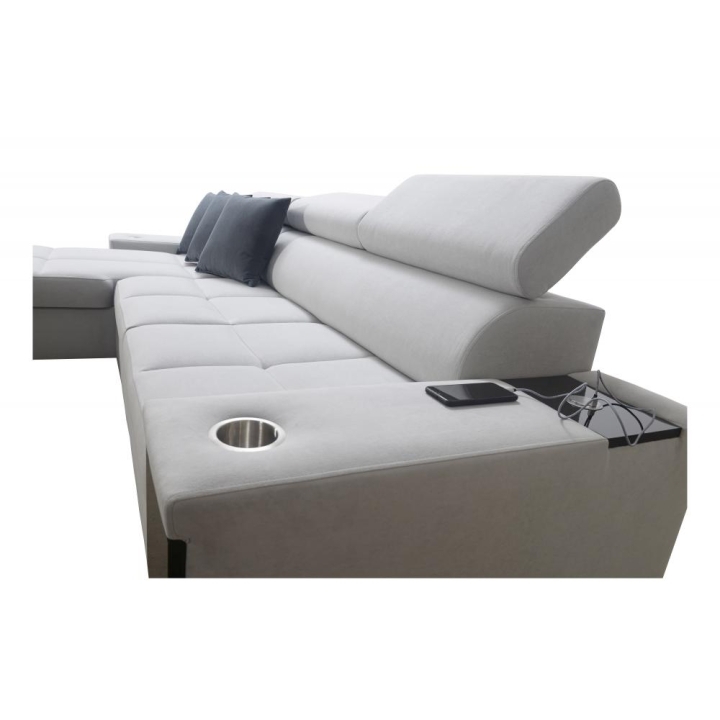 Mebel został wyposażony w 3 regulowane zagłówki, 1 pojemnik na pościel oraz otwierany barek, który zwiększa zakres zastosowań narożnika. Dodatkowym udogodnieniem jest wejście pod USB oraz gniazdo elektryczne, ułatwiające codzienne korzystanie z urządzeń elektronicznych. Rozwiązania te zostały zintegrowane w sposób spójny z konstrukcją mebla.