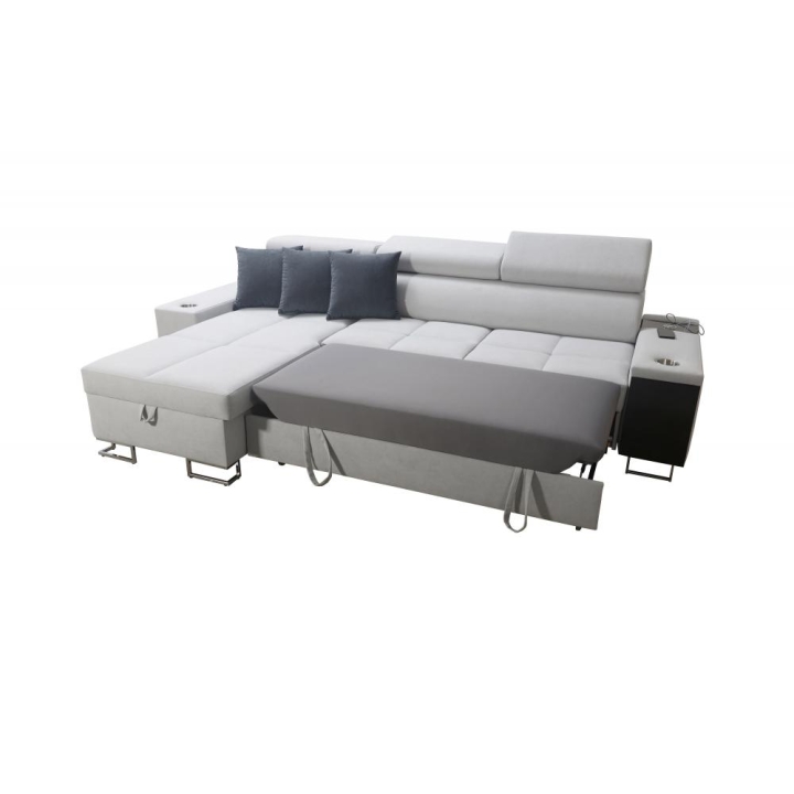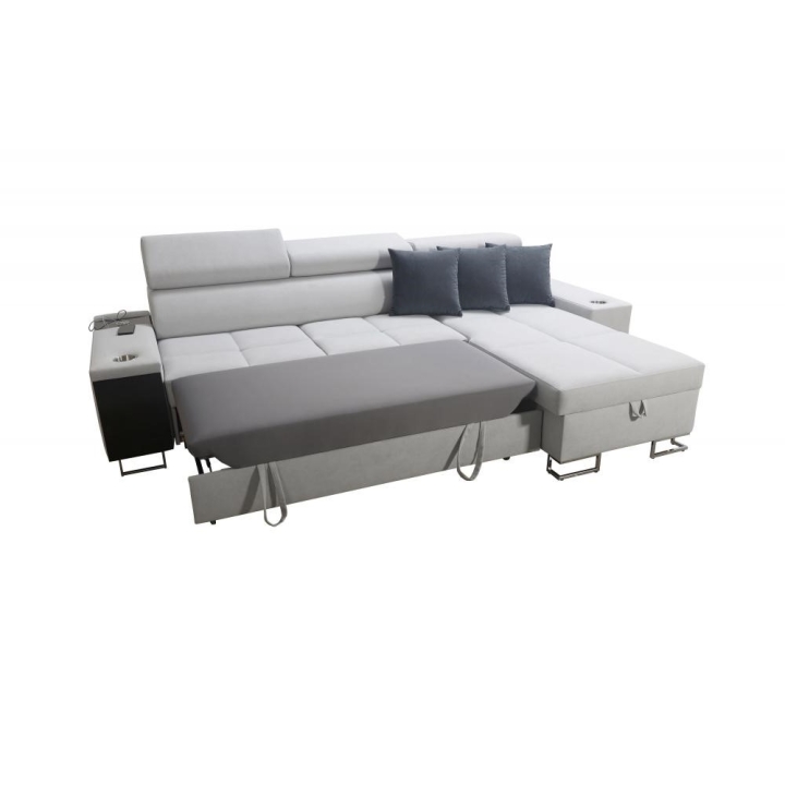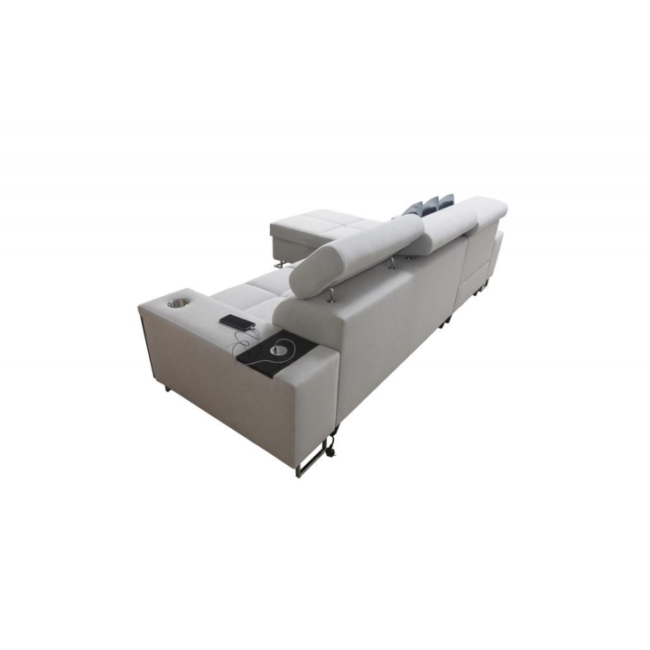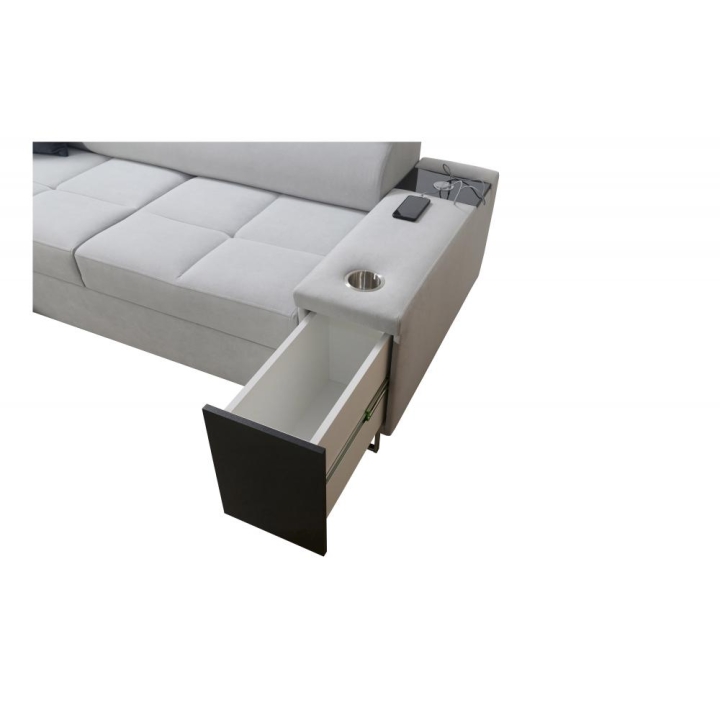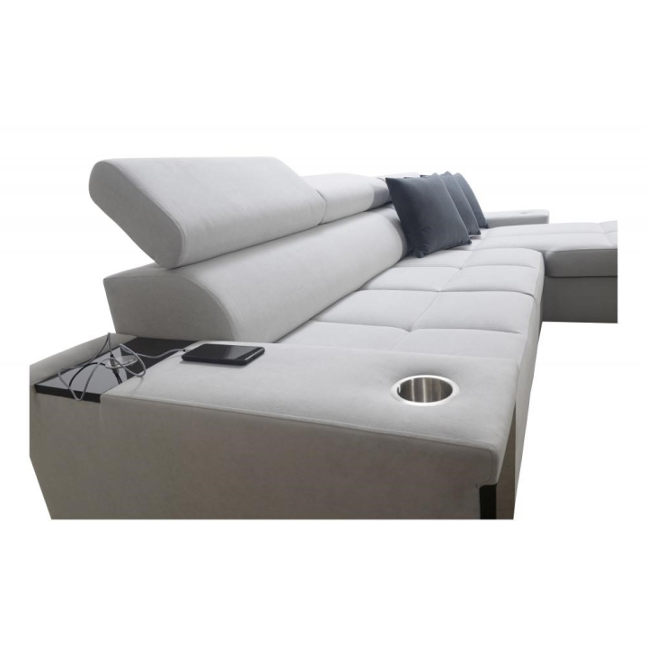 Model wyposażono w 3 regulowane zagłówki, które pozwalają na indywidualne ustawienie oparcia. Do dyspozycji pozostaje 1 pojemnik na pościel, a także otwierany barek, który zwiększa zakres zastosowań mebla. Dodatkowym atutem jest wejście pod USB oraz gniazdo elektryczne, umożliwiające korzystanie z urządzeń bez potrzeby stosowania przedłużaczy.
