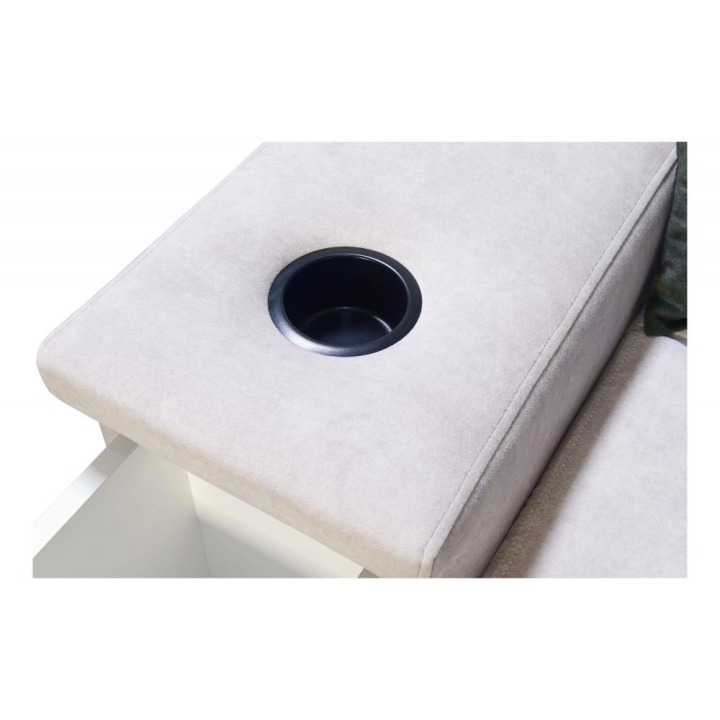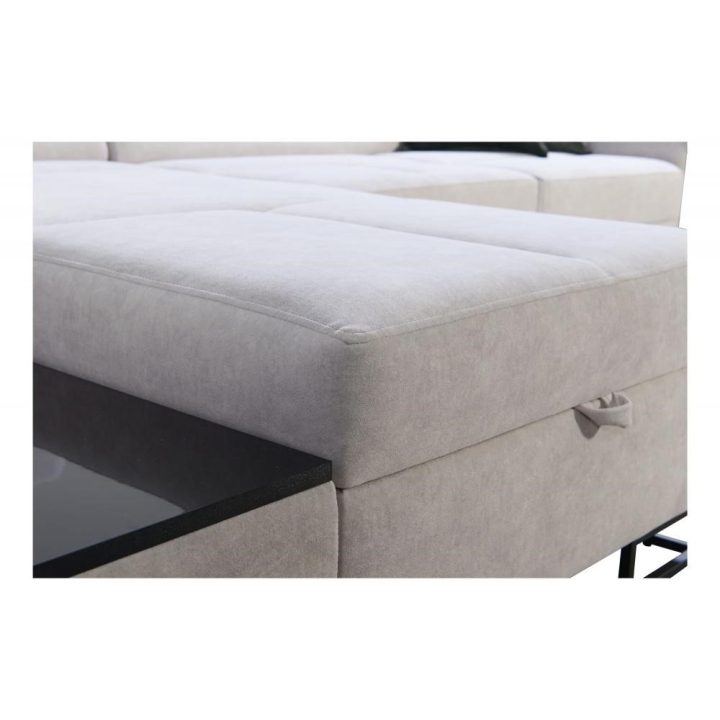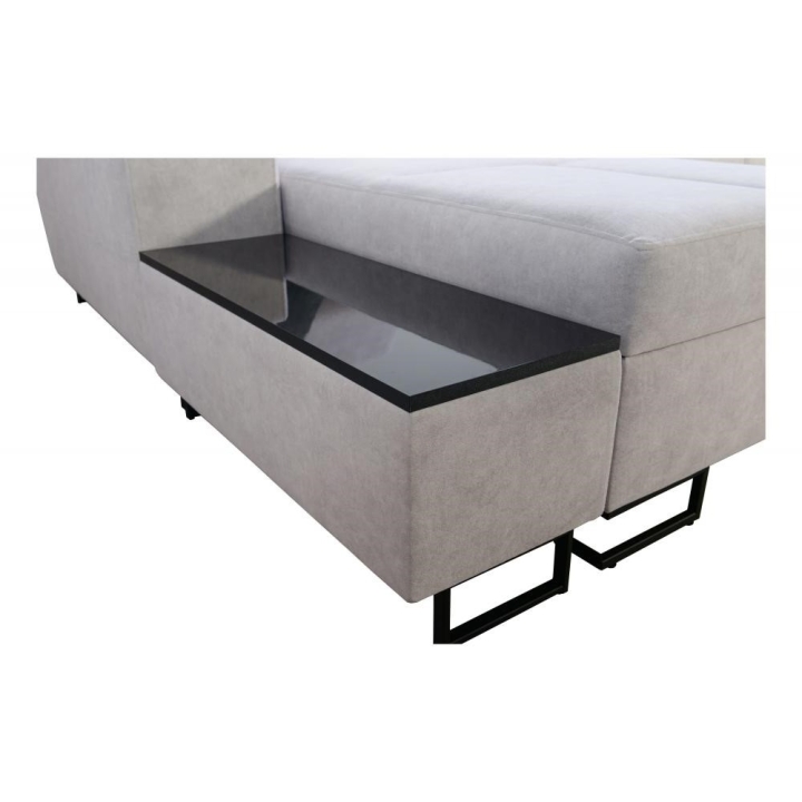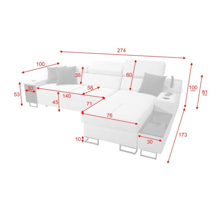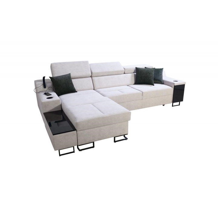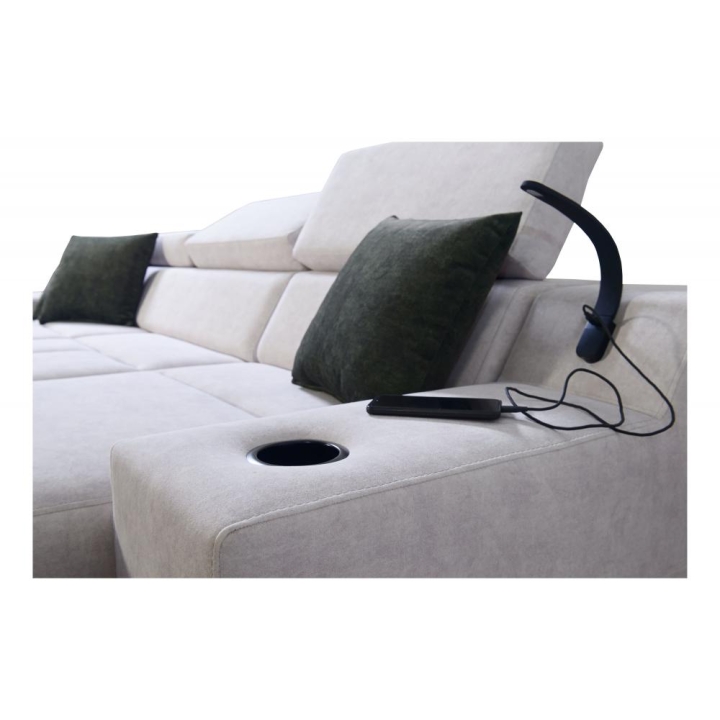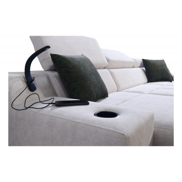 Mebel wyposażono w 3 regulowane zagłówki, 1 pojemnik na pościel oraz otwierany barek. Dodatkowym elementem jest ruchoma dostawka, zwiększająca możliwości aranżacyjne narożnika. Poduszki widoczne na zdjęciu dołączane są gratis, bez dodatkowych kosztów.