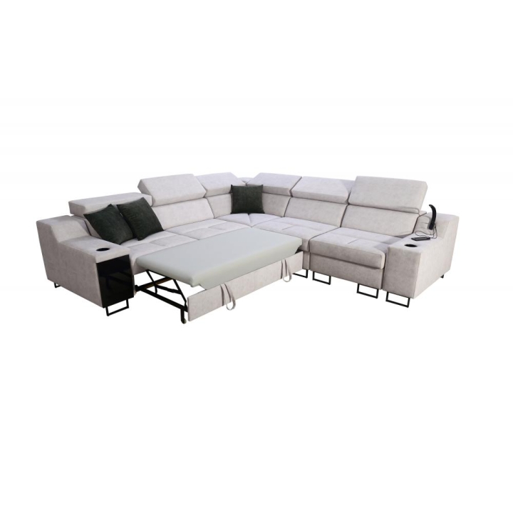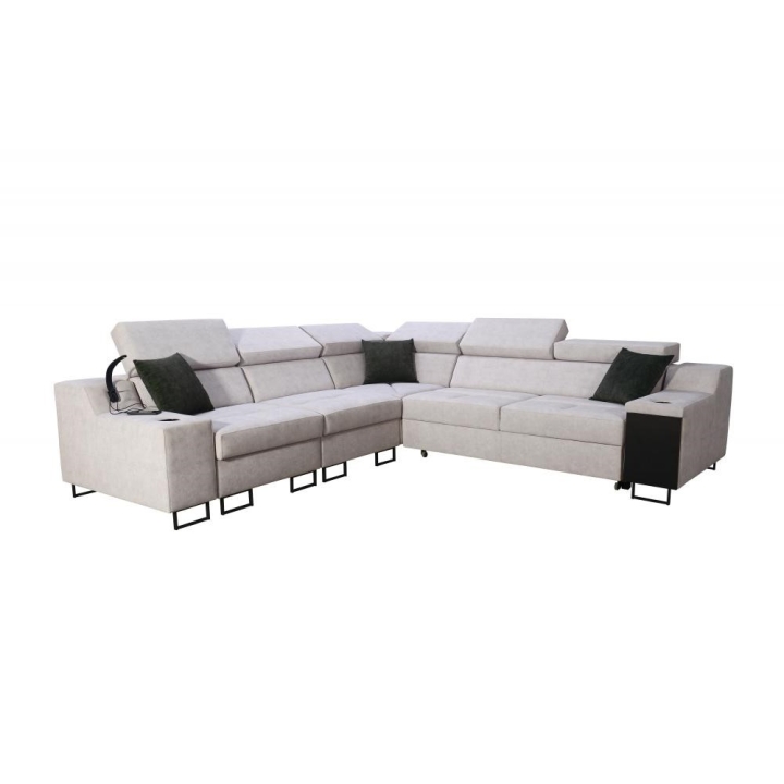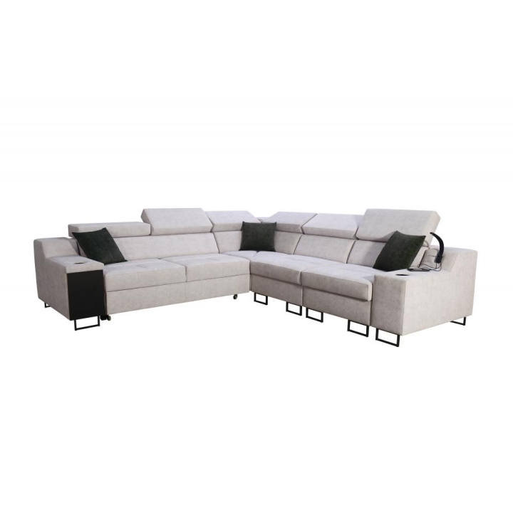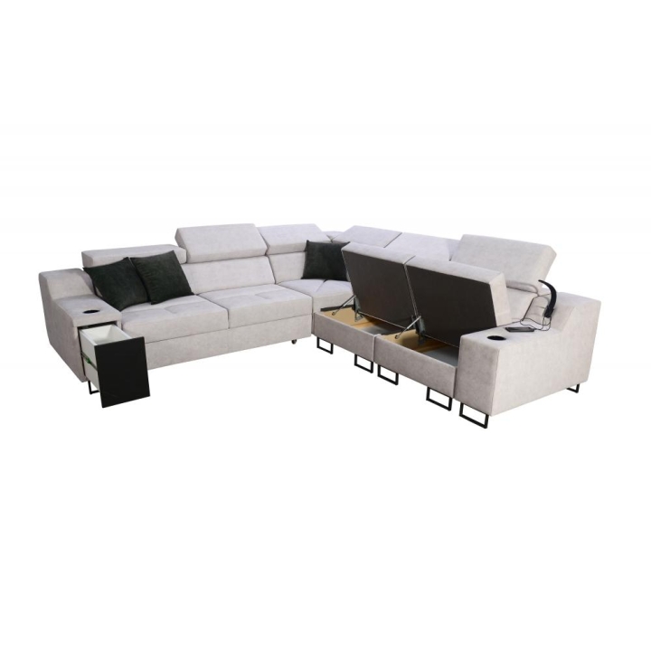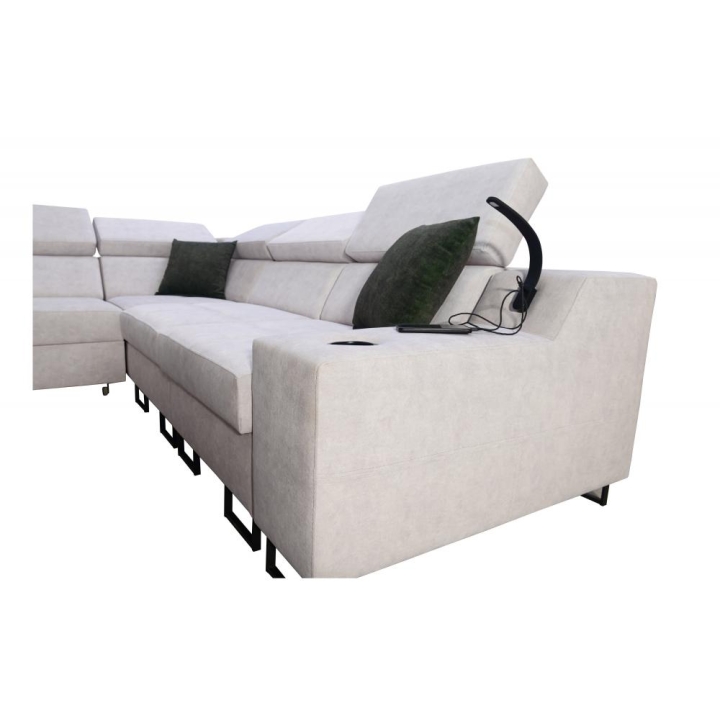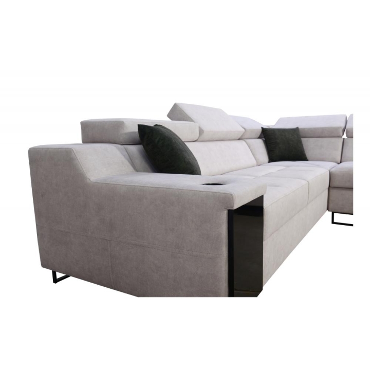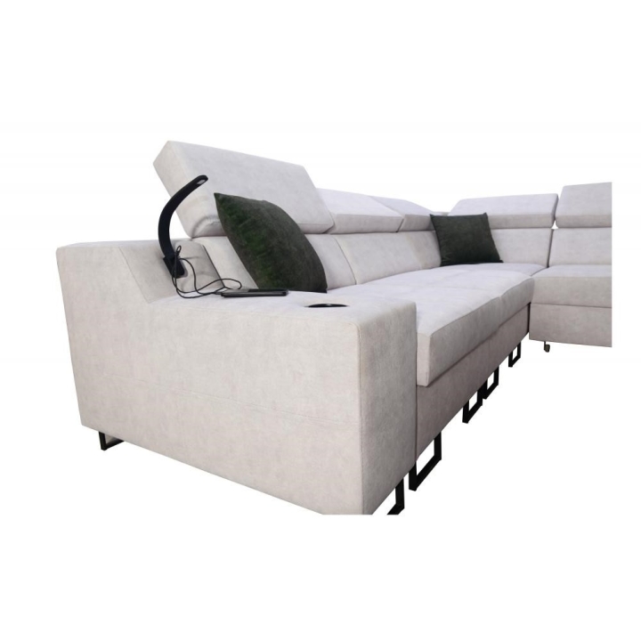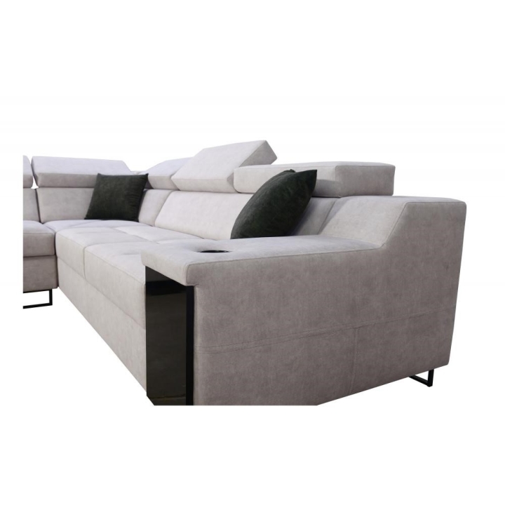 W standardzie mebel wyposażono w 6 regulowanych zagłówków, które umożliwiają indywidualne ustawienie oparcia. Do dyspozycji pozostają również 2 pojemniki na pościel oraz otwierany barek, zwiększające możliwości użytkowe. Poduszki widoczne na zdjęciu dołączane są gratis, bez dodatkowych kosztów.