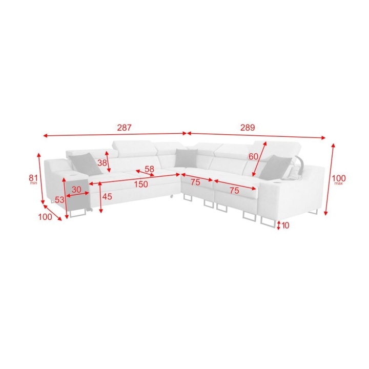Model posiada szerokość 287 cm, głębokość 289 cm oraz wysokość 100 cm, przy czym krótszy bok ma 100 cm. Wysokość siedziska wynosi 45 cm, co zapewnia komfortową pozycję siedzącą. Po rozłożeniu narożnik oferuje powierzchnię spania 210 × 127 cm, odpowiednią do codziennego odpoczynku nocnego.