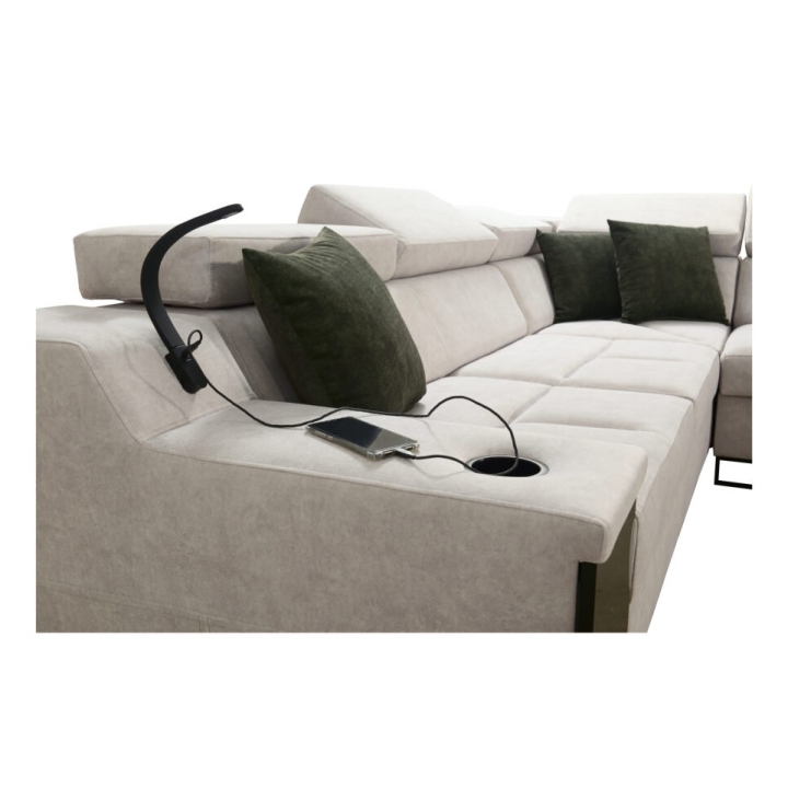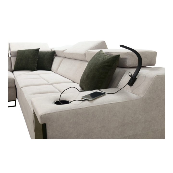 Narożnik Alicanto VII Brattex to rozkładany narożnik z funkcją spania, wyposażony w otwierany barek, cup holder, lampkę z wbudowanym portem USB oraz 5 regulowanych zagłówków. Konstrukcję oparto na ramie drewnianej łączonej z płytą wiórową, a w siedziskach zastosowano system sprężyn falistych. Całość stanowi mebel wolnostojący, przeznaczony do ustawienia w centralnej części pomieszczenia.