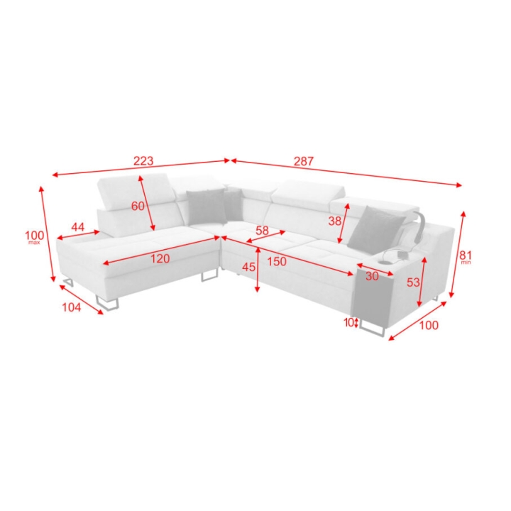Wymiary mebla wynoszą 287 cm szerokości, 223 cm głębokości, 45 cm wysokości siedziska oraz 100 cm maksymalnej wysokości narożnika. Producent dopuszcza tolerancję wymiarów +/- 5 cm, co należy uwzględnić podczas planowania ustawienia. Do zestawu dołączone są poduszki dekoracyjne widoczne na zdjęciu – gratis.