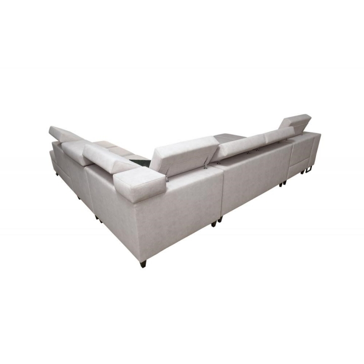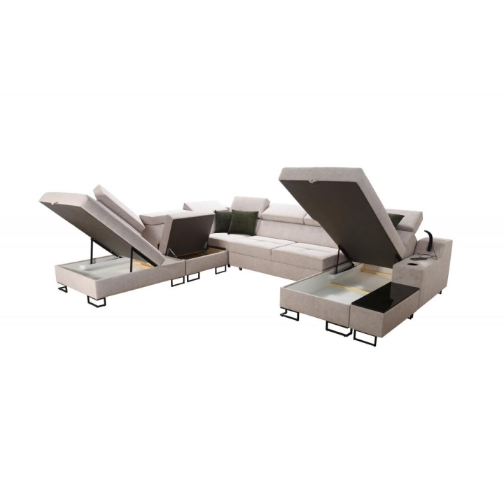 Komfort użytkowania podnoszą 7 regulowanych zagłówków, pozwalających na indywidualne ustawienie oparcia. Narożnik wyposażono również w ruchomą dostawkę, która rozszerza możliwości aranżacyjne bryły. Integralnym elementem jest zestaw wielofunkcyjnej lampy z ładowaniem USB i elastycznym ramieniem, zasilanej 12V/230V, o neutralnej barwie światła.