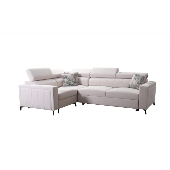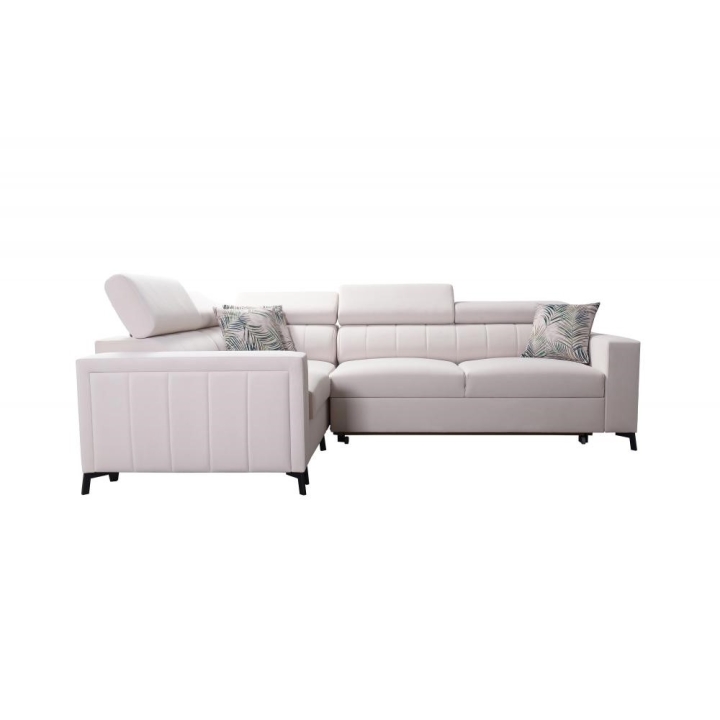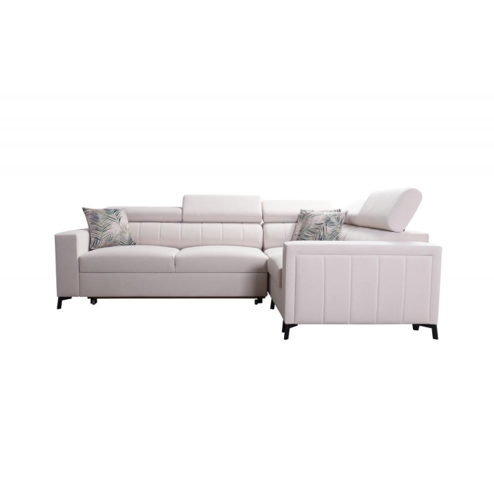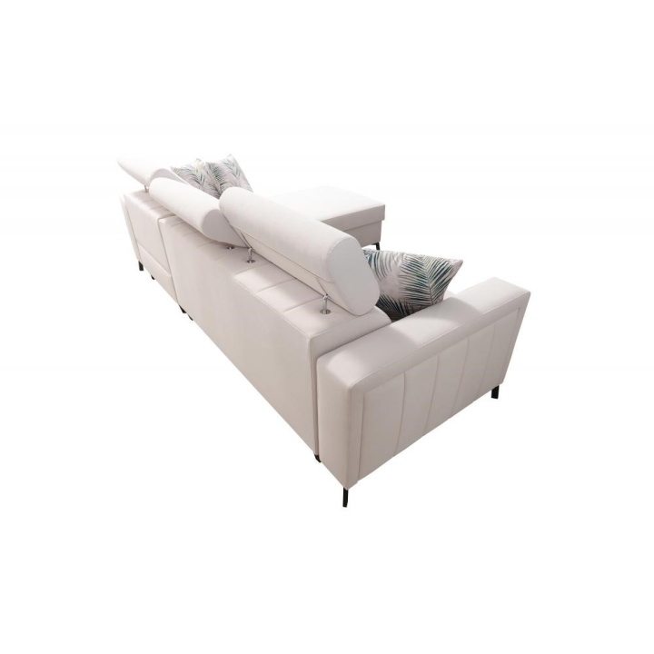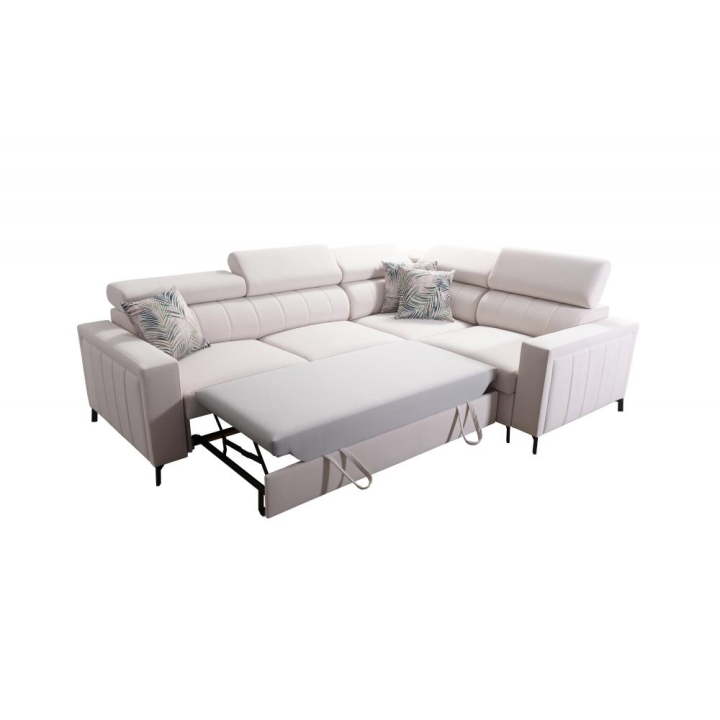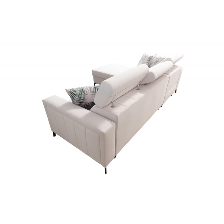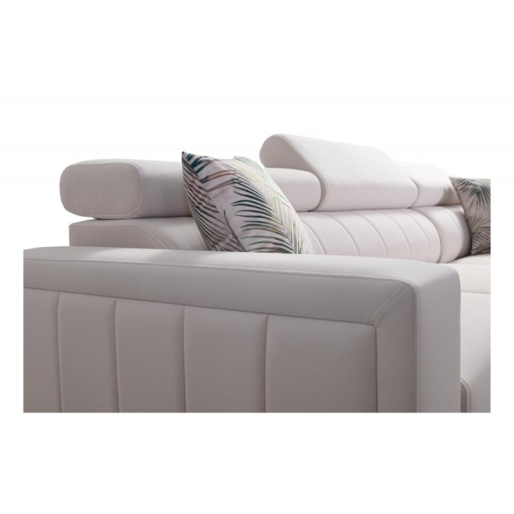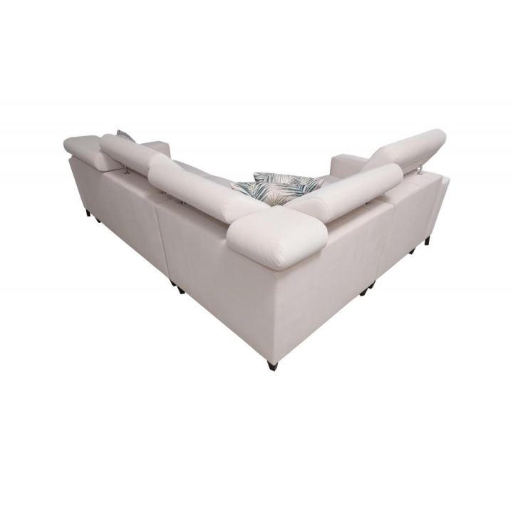 Narożnik wyposażono w 5 regulowanych zagłówków, które pozwalają na indywidualne ustawienie podparcia. Do dyspozycji użytkownika pozostaje także 1 pojemnik na pościel, dyskretnie zintegrowany z konstrukcją. Elementy te podnoszą wygodę codziennego użytkowania bez ingerencji w formę mebla.