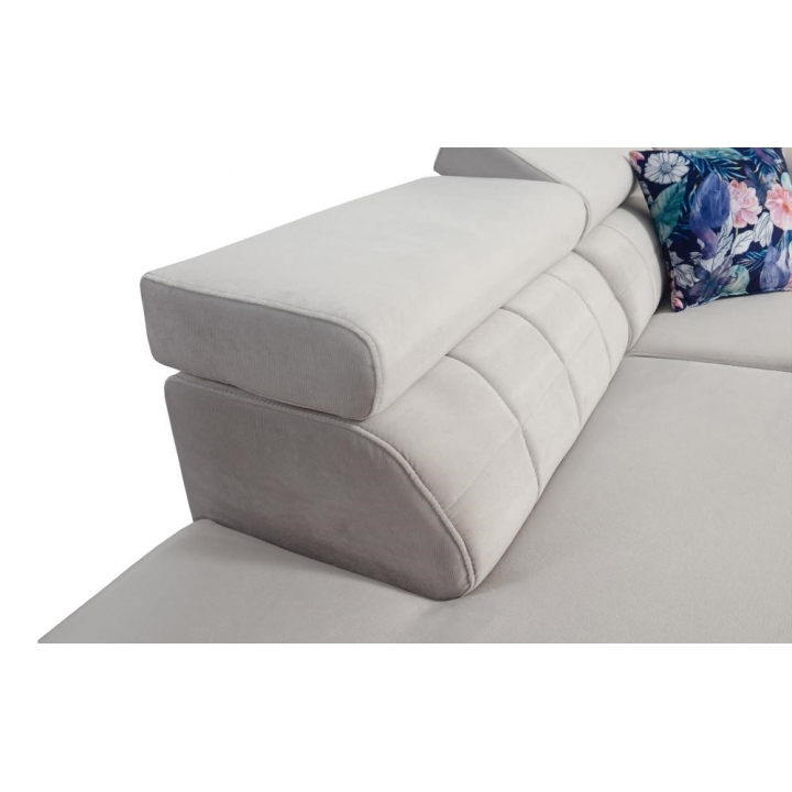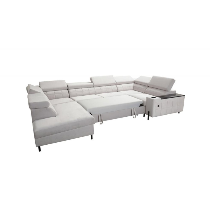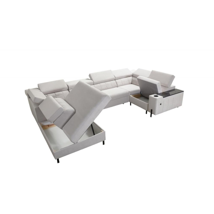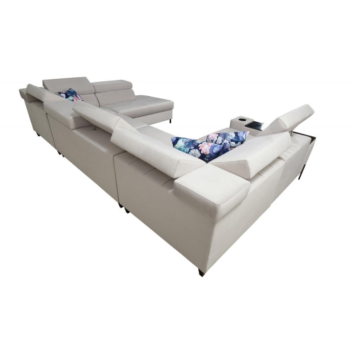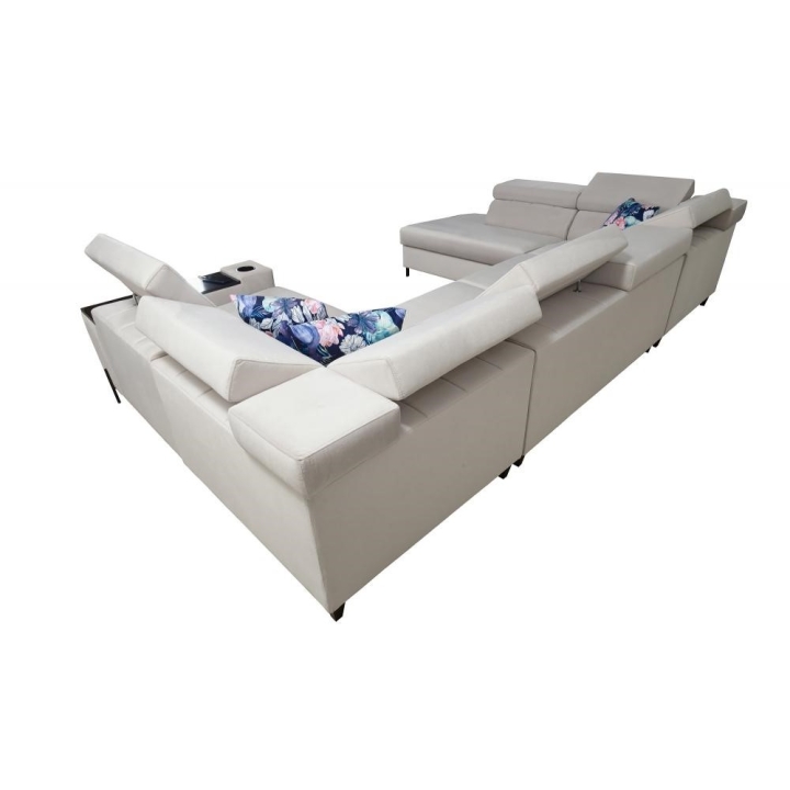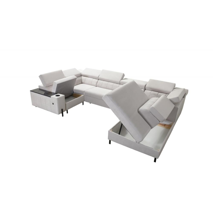 Model wyposażono w 8 regulowanych zagłówków, które pozwalają na precyzyjne dopasowanie pozycji oparcia. Do dyspozycji użytkownika pozostają również 2 pojemniki na pościel, ułatwiające organizację przestrzeni. Dodatkowym elementem jest otwierany barek, dyskretnie wkomponowany w konstrukcję mebla.