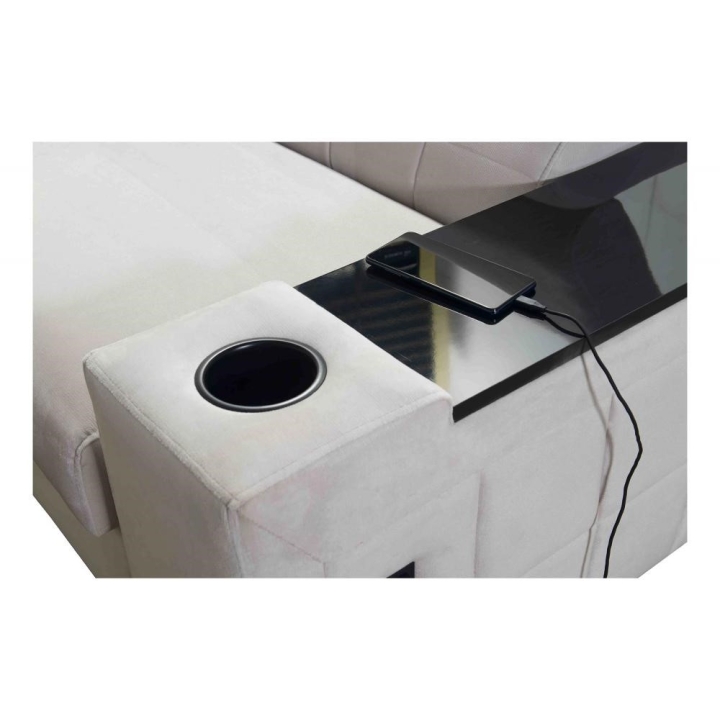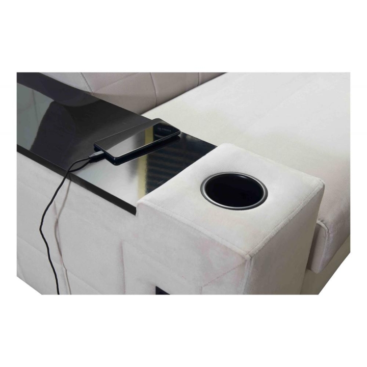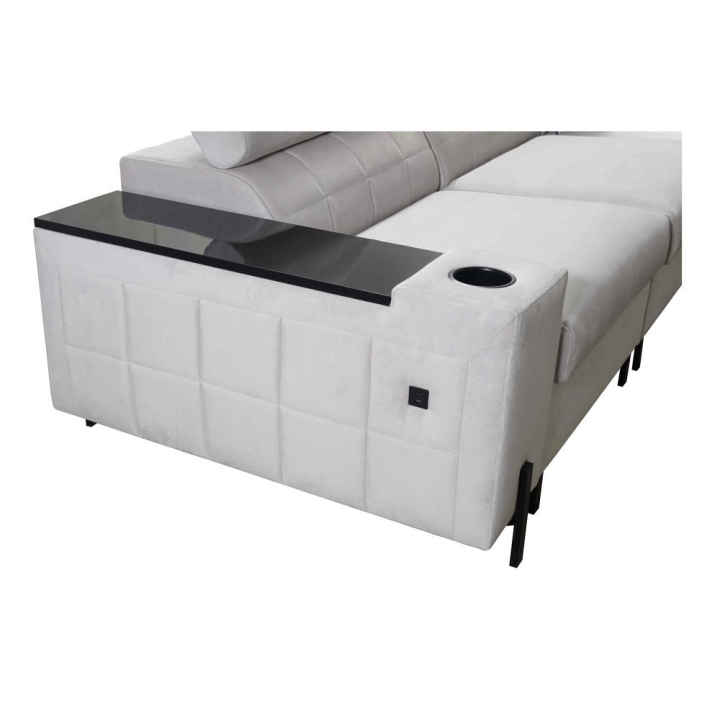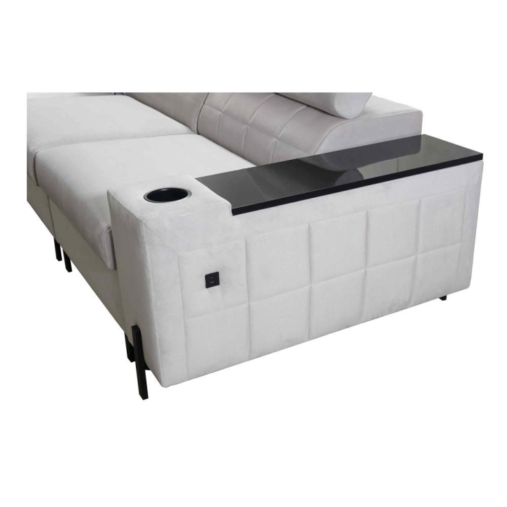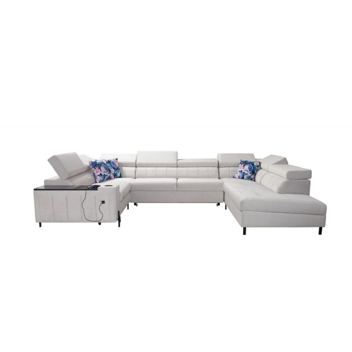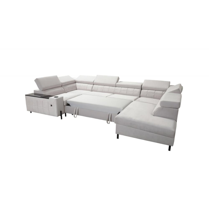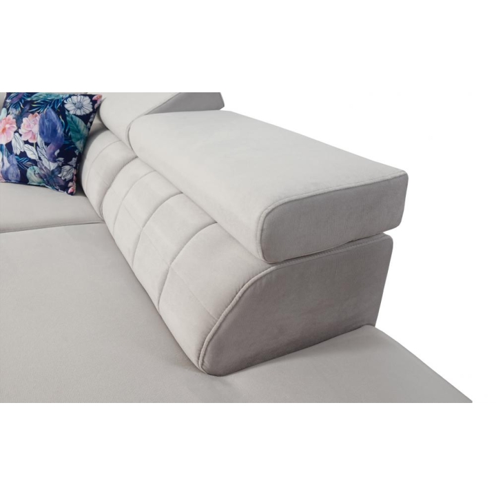 Model wyposażono w 8 regulowanych zagłówków, które pozwalają na precyzyjne dopasowanie pozycji oparcia. Do dyspozycji użytkownika pozostają również 2 pojemniki na pościel, ułatwiające organizację przestrzeni. Dodatkowym elementem jest otwierany barek, dyskretnie wkomponowany w konstrukcję mebla.