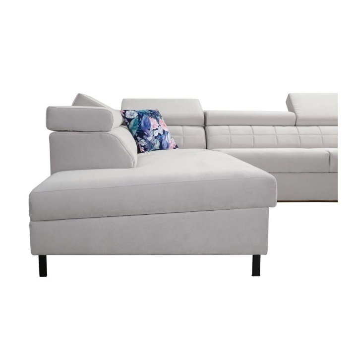 Narożnik został wykonany na sprężynach falistych oraz utwardzonej piance T-30, przy użyciu tkanin najwyższej jakości. Całość oparto na wzmocnionym stelażu wykonanym na ramie drewnianej łączonej z płytą wiórową, co zapewnia stabilność i trwałość konstrukcji. Dostępne są liczne warianty wykończenia, obejmujące kolorystykę półek, stopki przednie i tylne oraz kubki w kolorze czarnym lub srebrnym, z możliwością wyboru m.in. metalu chromowanego, czarnego matu lub drewna w odcieniach czarnym, białym, olcha, buk i venge.