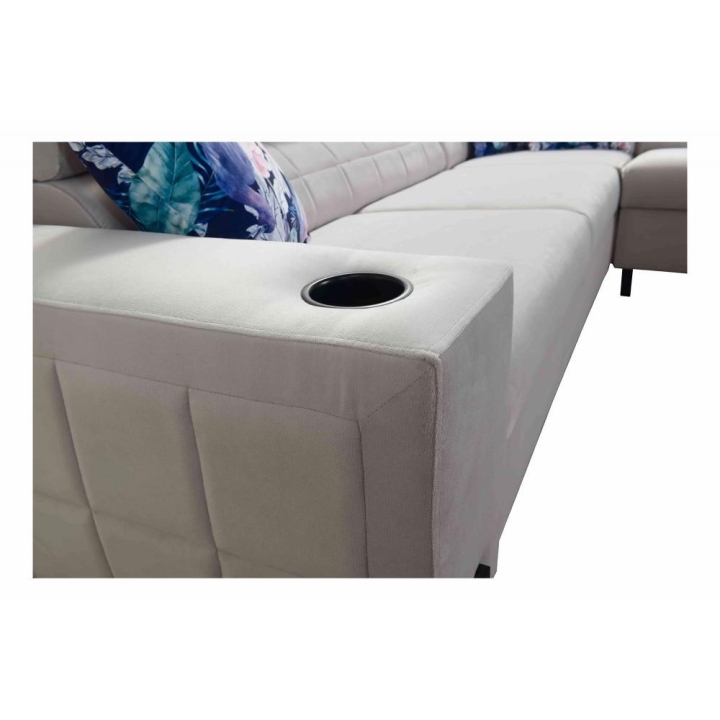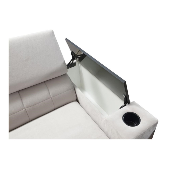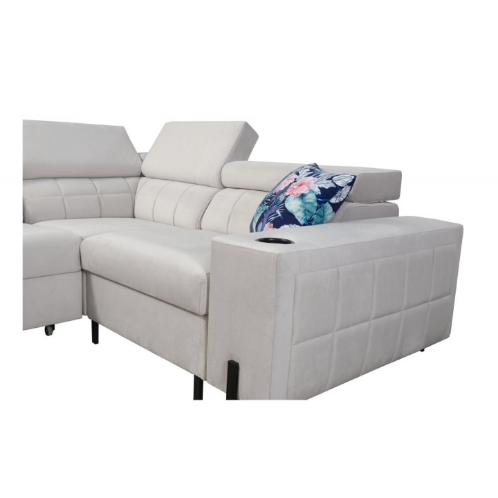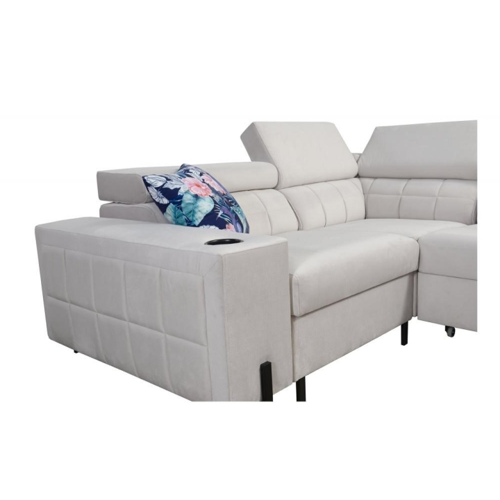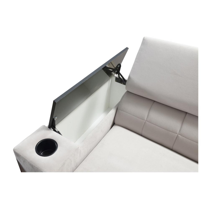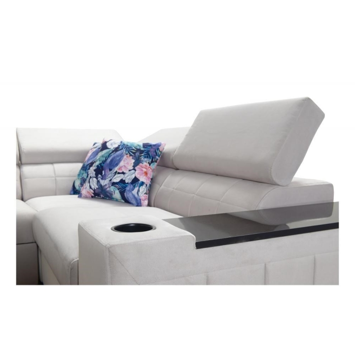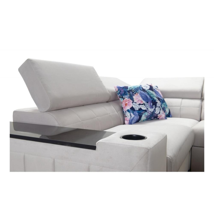 Model został wyposażony w 8 regulowanych zagłówków, umożliwiających indywidualne ustawienie podparcia dla głowy i karku. Dodatkowym atutem są 2 pojemniki na pościel, które ułatwiają organizację przestrzeni, oraz otwierany barek z wbudowanymi kubkami dostępnymi w kolorze czarnym lub srebrnym. Rozwiązania te zostały dyskretnie wkomponowane w konstrukcję narożnika.