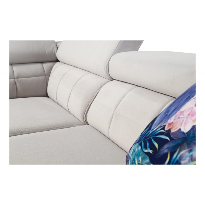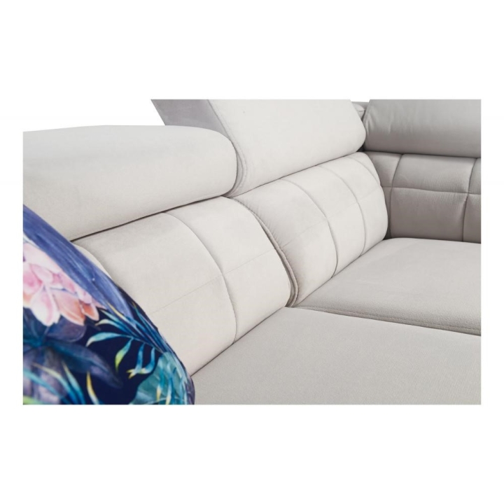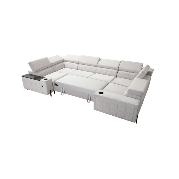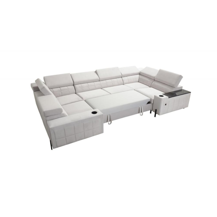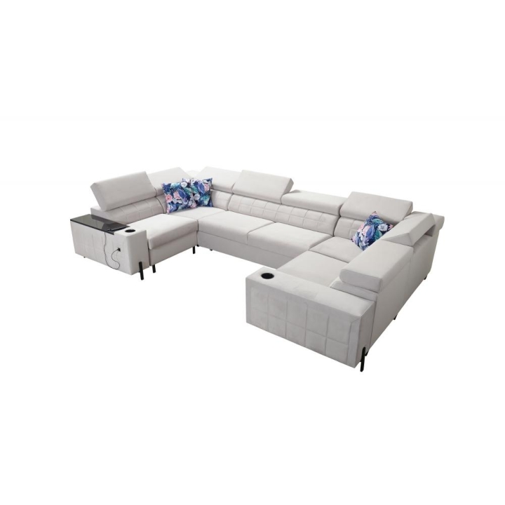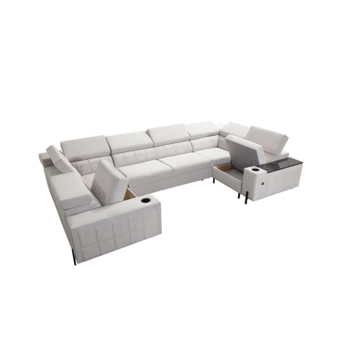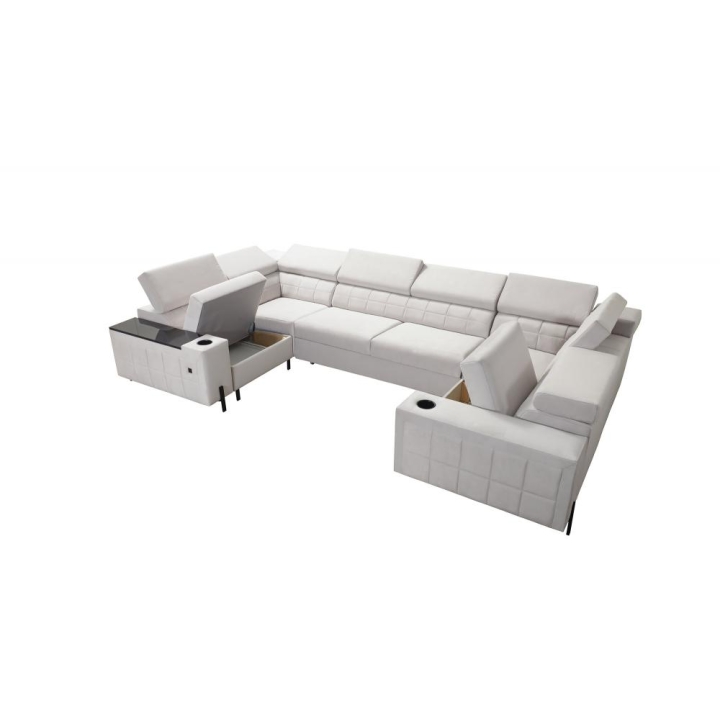 Model został wyposażony w 8 regulowanych zagłówków, umożliwiających indywidualne ustawienie podparcia dla głowy i karku. Dodatkowym atutem są 2 pojemniki na pościel, które ułatwiają organizację przestrzeni, oraz otwierany barek z wbudowanymi kubkami dostępnymi w kolorze czarnym lub srebrnym. Rozwiązania te zostały dyskretnie wkomponowane w konstrukcję narożnika.