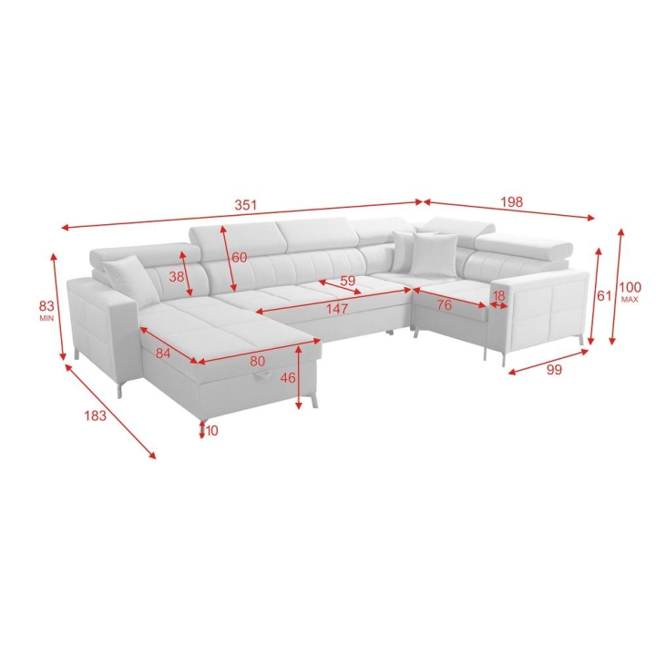 Wymiary narożnika obejmują szerokość 351 cm oraz głębokość 183 cm z lewej strony i 198 cm z prawej strony. Wysokość siedziska wynosi 46 cm, natomiast maksymalna wysokość narożnika to 100 cm, co zapewnia odpowiednie podparcie pleców i głowy. Proporcje mebla zostały dobrane tak, aby zachować spójny wygląd przy dużej powierzchni użytkowej.