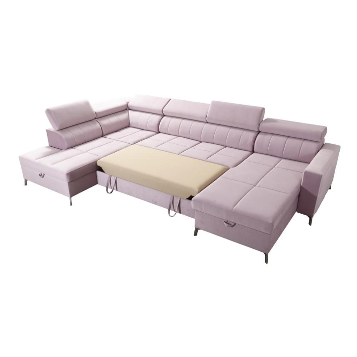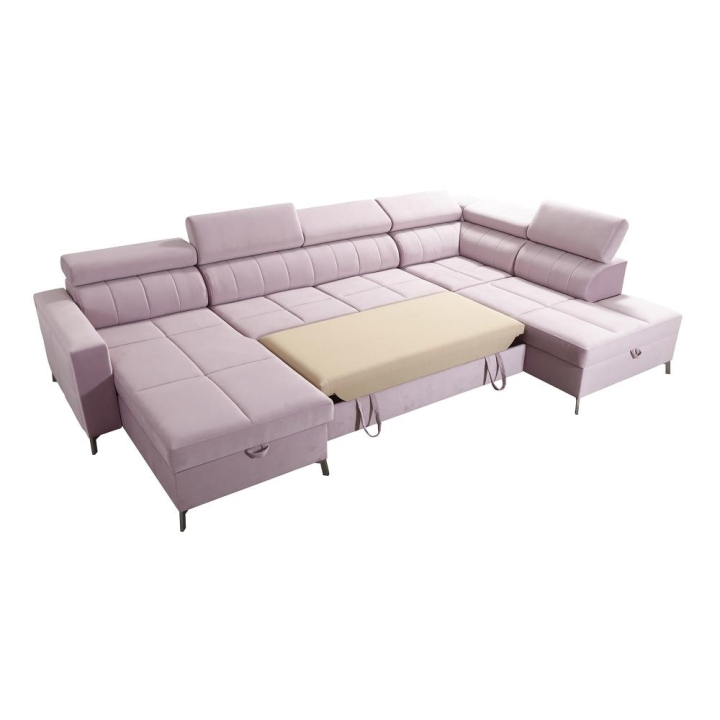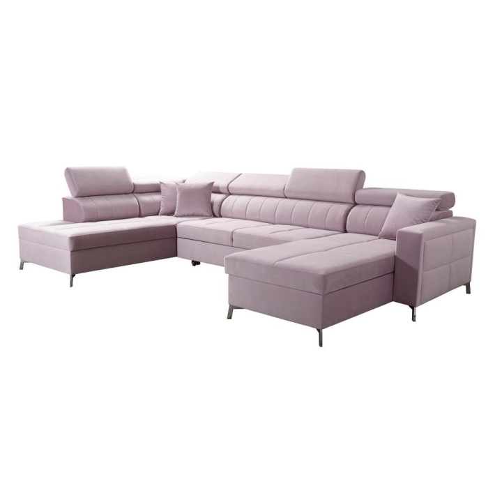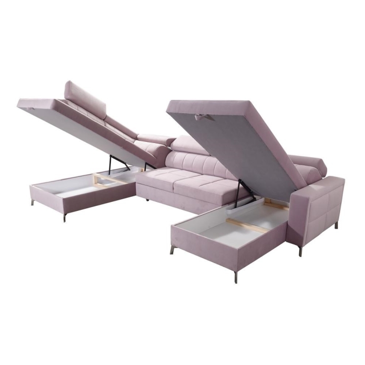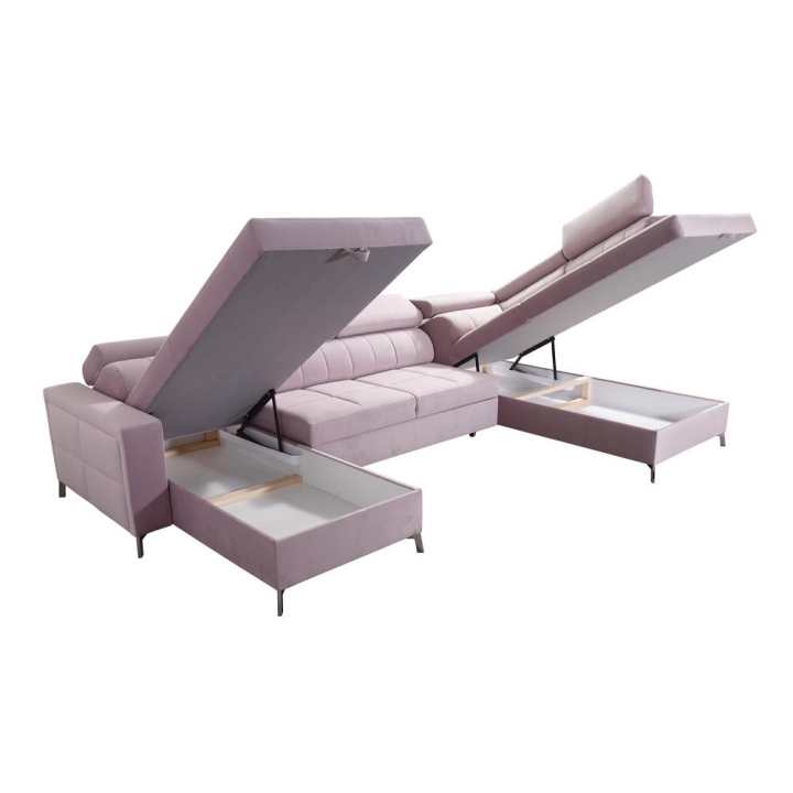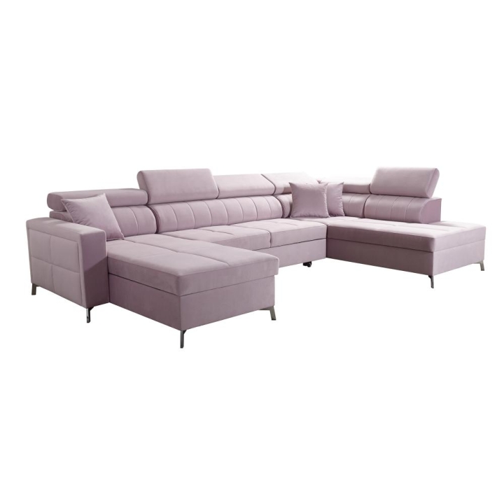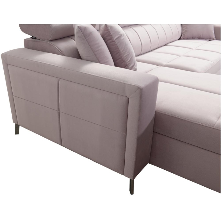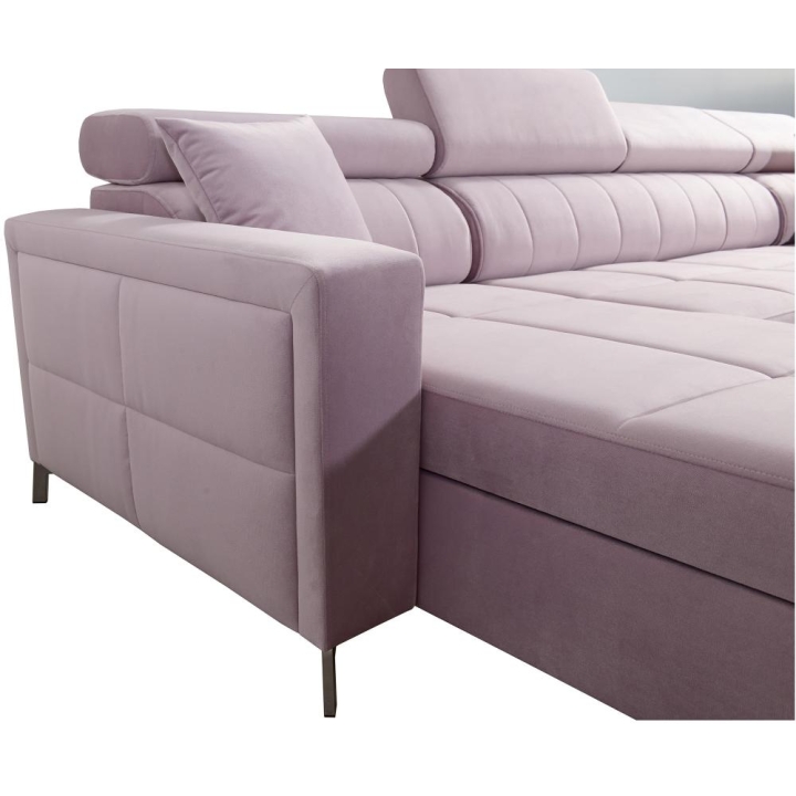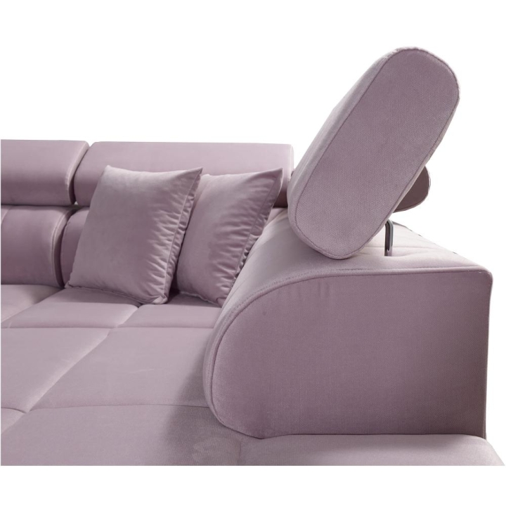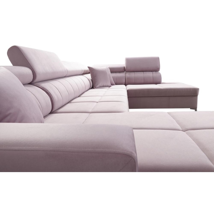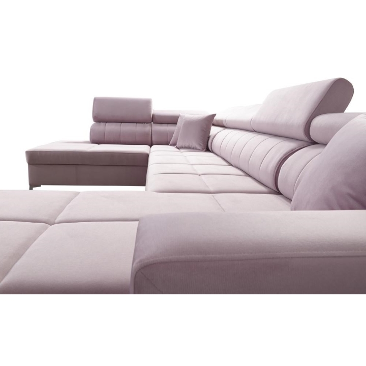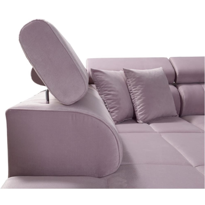 Model wyposażono w 6 regulowanych zagłówków, umożliwiających indywidualne ustawienie oparcia głowy. Dodatkowo mebel posiada 2 pojemniki na pościel, dyskretnie zintegrowane z konstrukcją narożnika. Poduszki widoczne na zdjęciu dołączane są gratis, co stanowi uzupełnienie zestawu bez dodatkowych kosztów.