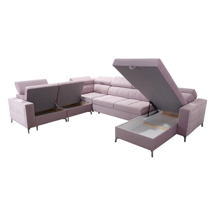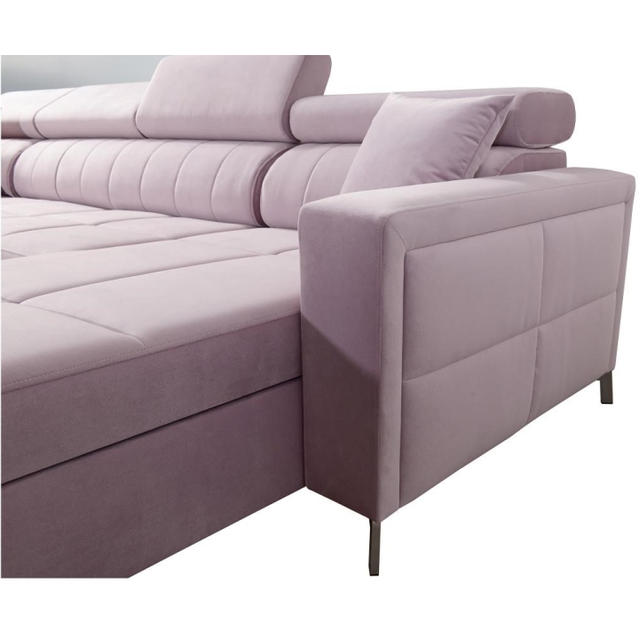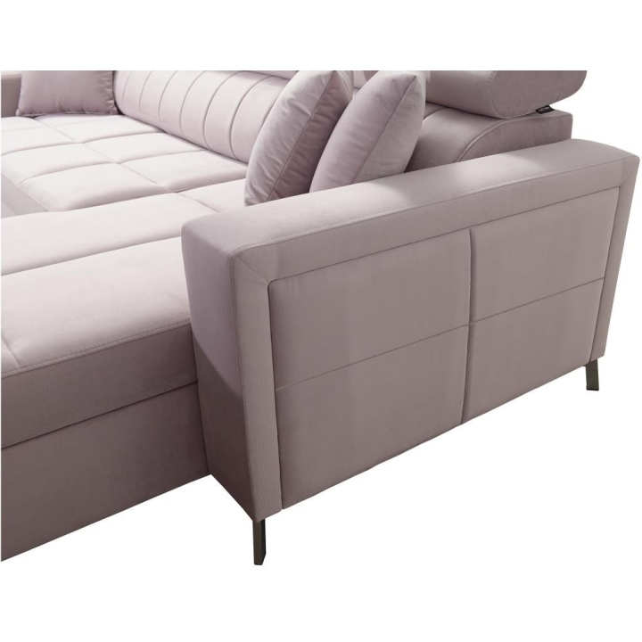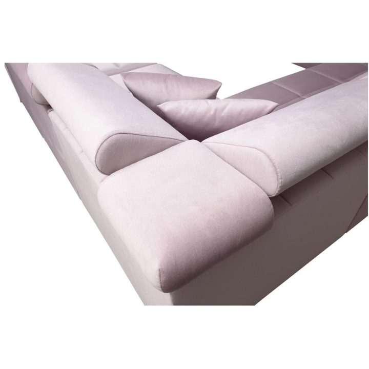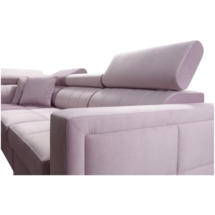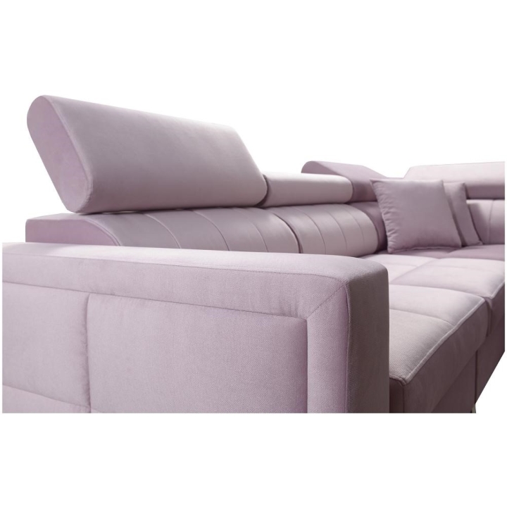 Model został wyposażony w 7 regulowanych zagłówków, umożliwiających indywidualne ustawienie oparcia. Do dyspozycji użytkownika pozostają także 3 pojemniki na pościel, dyskretnie zintegrowane z bryłą mebla. Poduszki widoczne na zdjęciu dołączane są gratis, bez dodatkowych opłat.