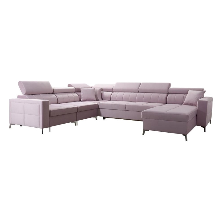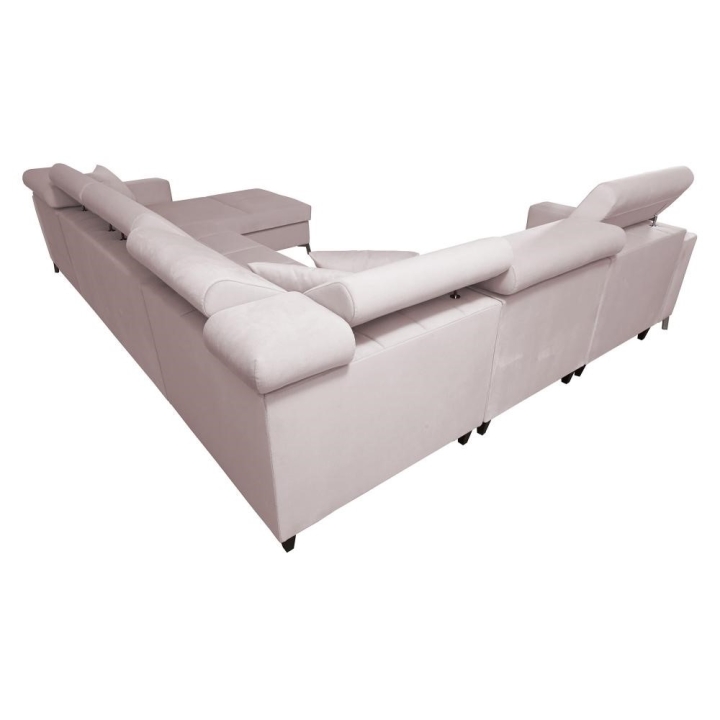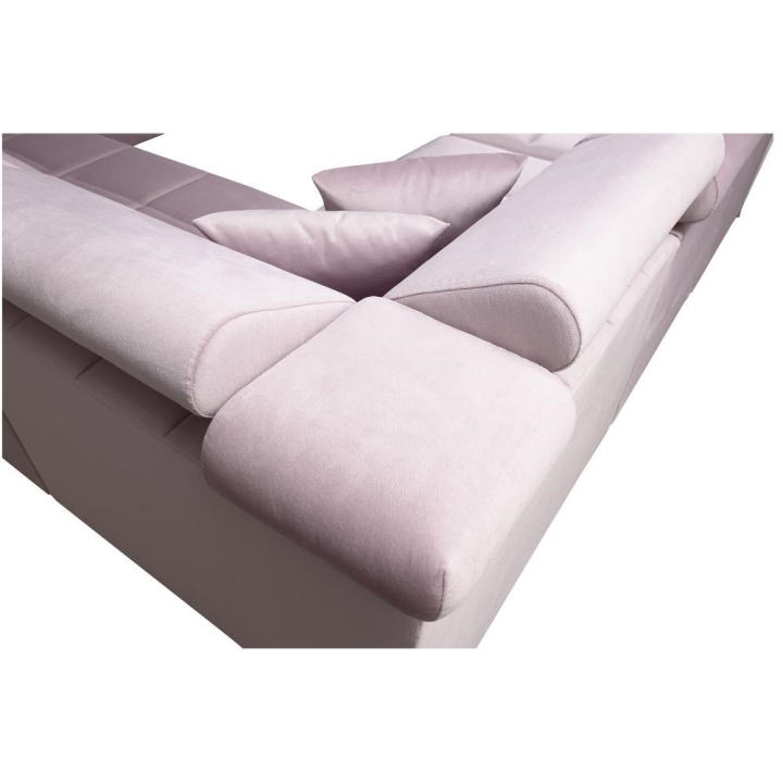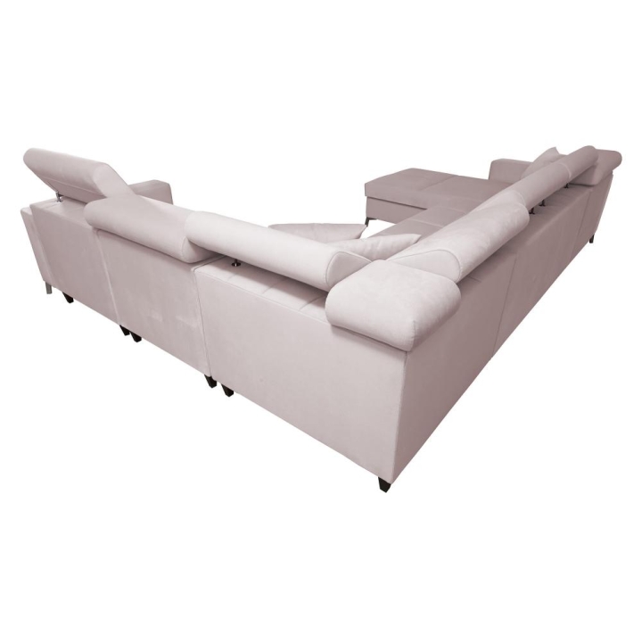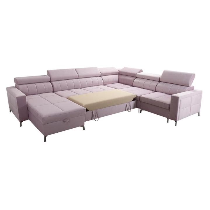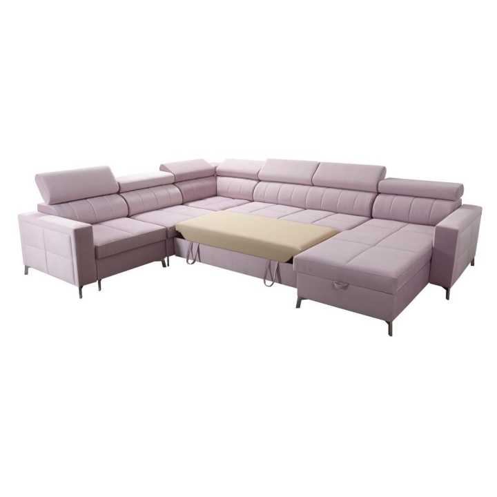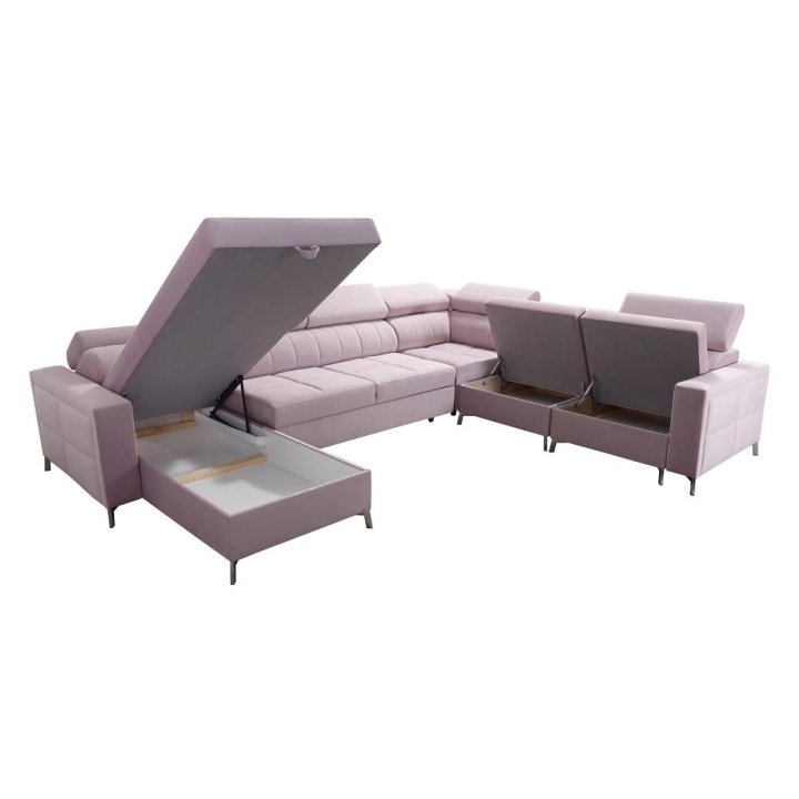 Model został wyposażony w 7 regulowanych zagłówków, umożliwiających indywidualne ustawienie oparcia. Do dyspozycji użytkownika pozostają także 3 pojemniki na pościel, dyskretnie zintegrowane z bryłą mebla. Poduszki widoczne na zdjęciu dołączane są gratis, bez dodatkowych opłat.