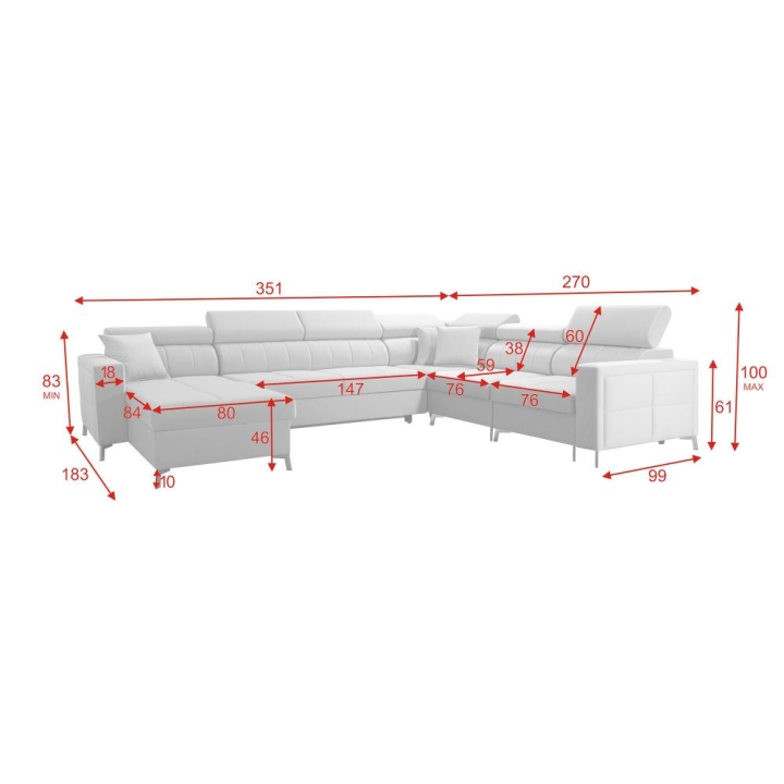 Całkowita szerokość wynosi 351 cm, natomiast głębokość to 183 cm z lewej strony oraz 270 cm z prawej strony. Narożnik oferuje powierzchnię spania o wymiarach 286 cm x 127 cm, co pozwala na komfortowe użytkowanie również w trybie nocnym. Wysokość siedziska 46 cm oraz maksymalna wysokość 100 cm zapewniają stabilne podparcie ciała.