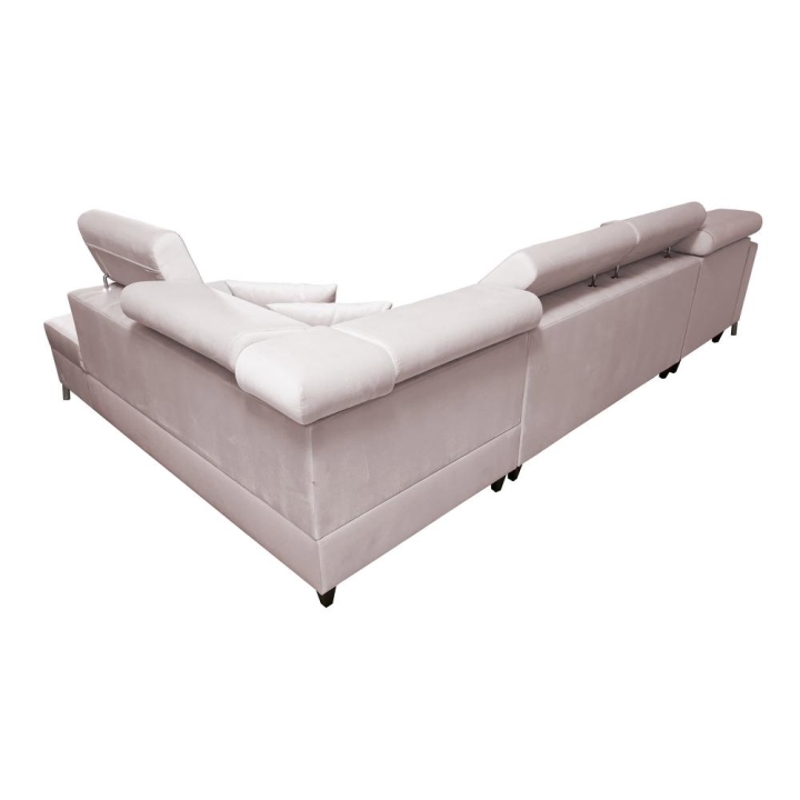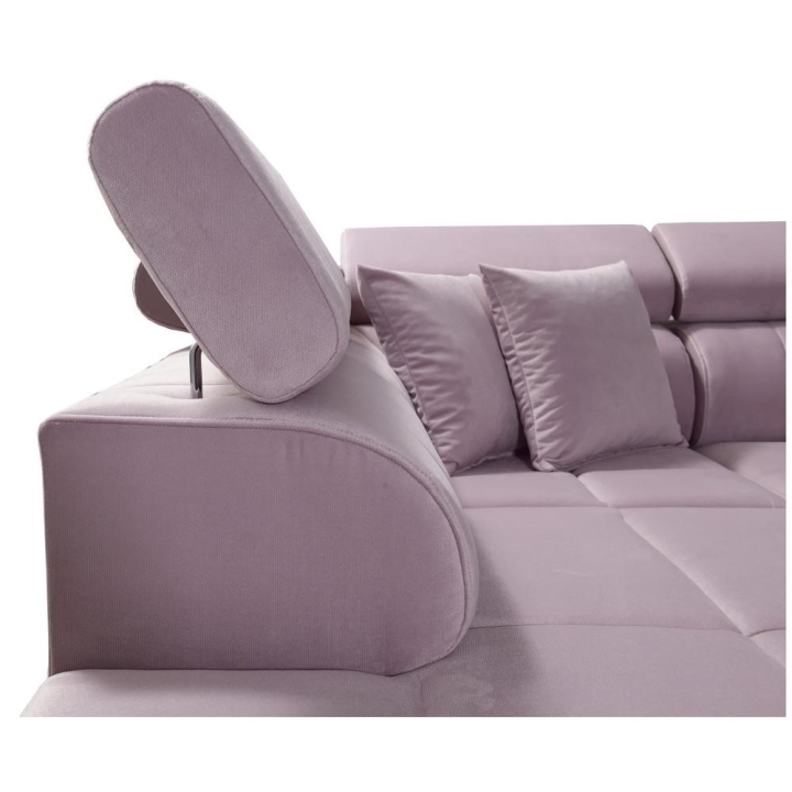 Model został wyposażony w 6 regulowanych zagłówków, umożliwiających precyzyjne ustawienie pozycji oparcia. Dodatkowym atutem są 2 pojemniki na pościel, dyskretnie wkomponowane w konstrukcję mebla. Rozwiązanie to sprzyja utrzymaniu porządku bez ingerencji w bryłę narożnika.
