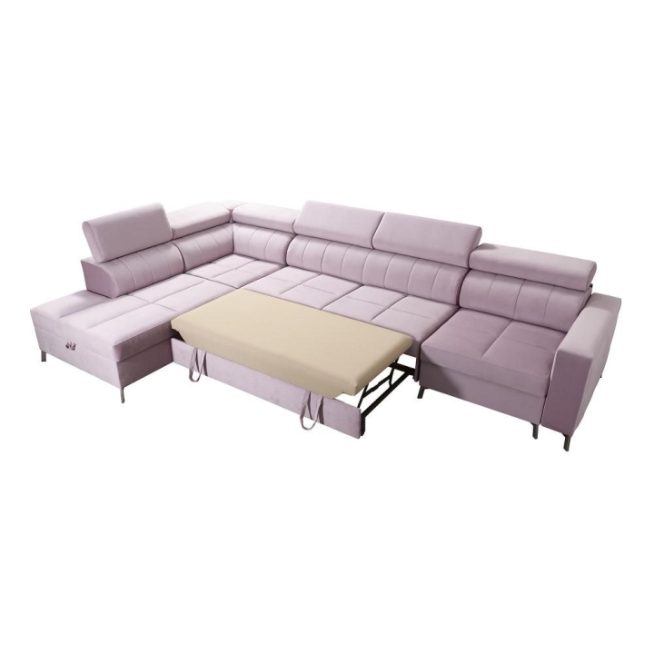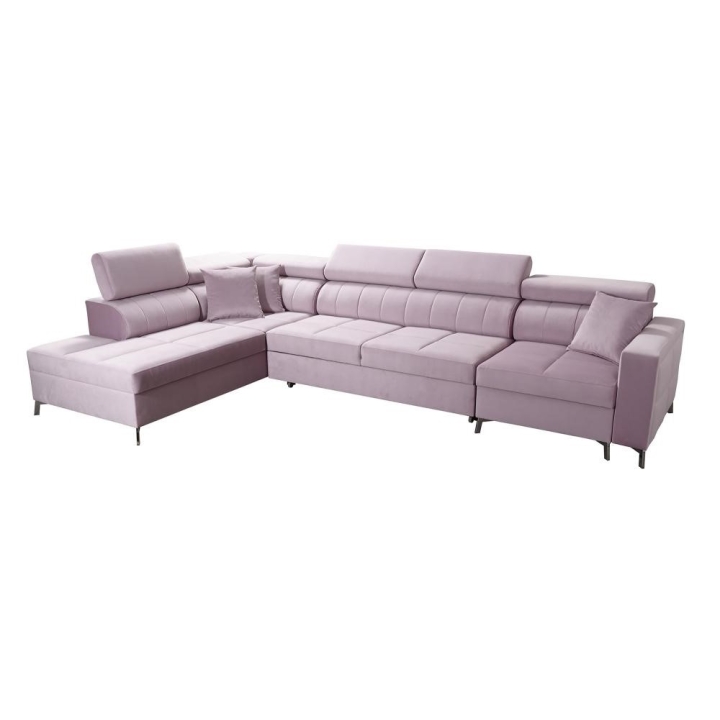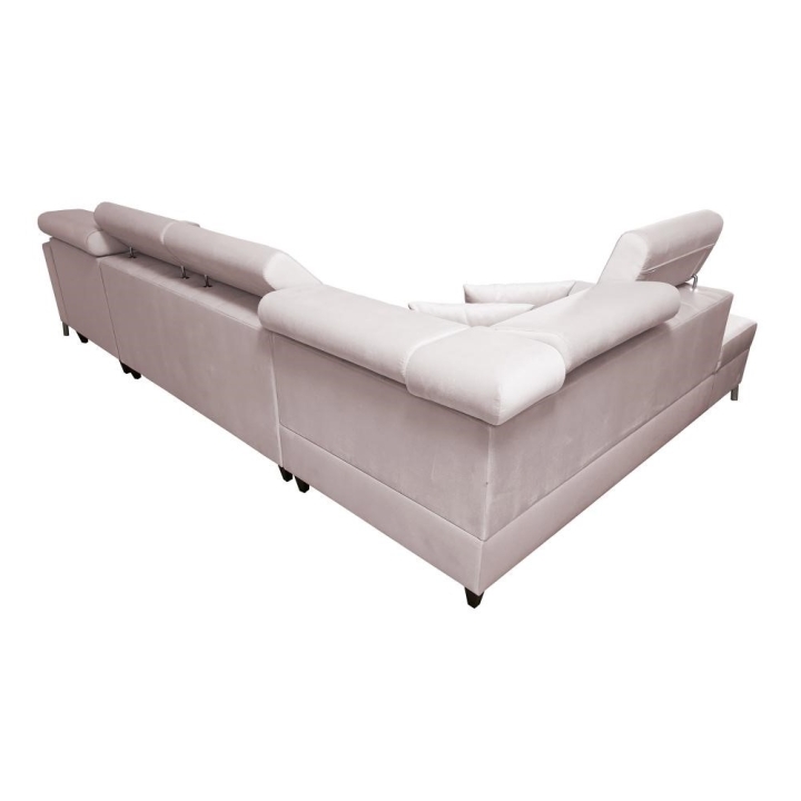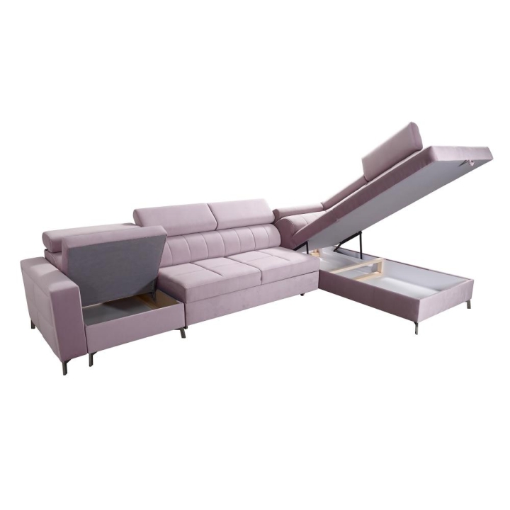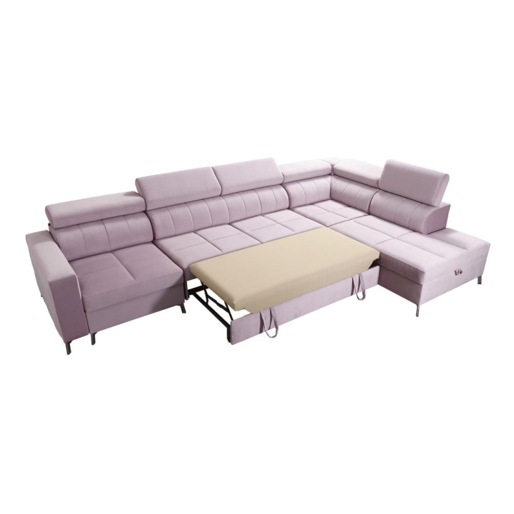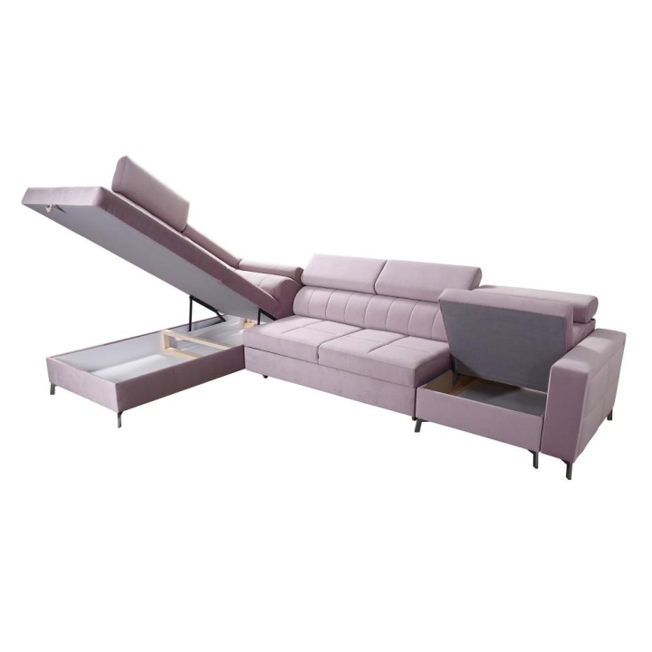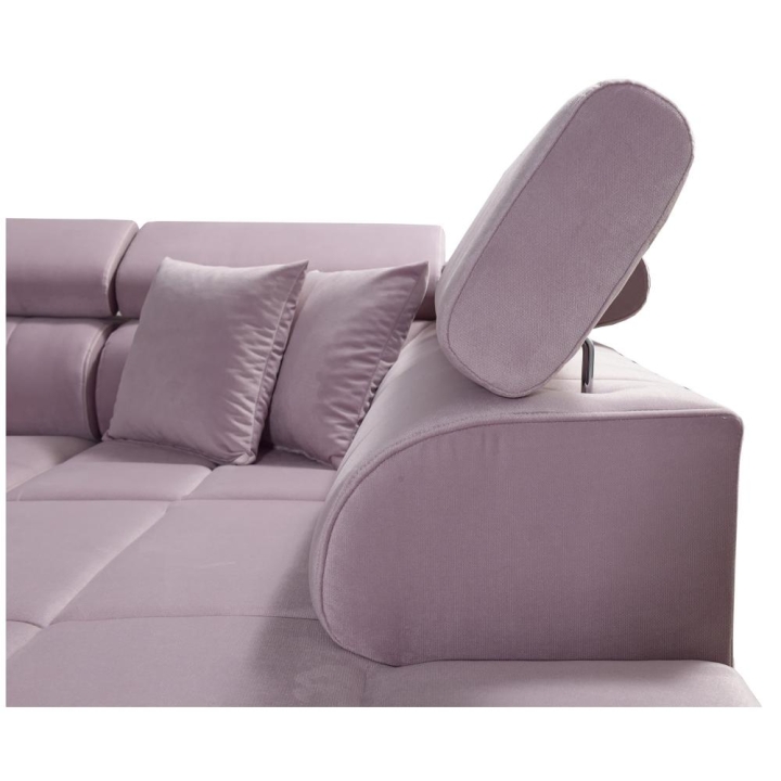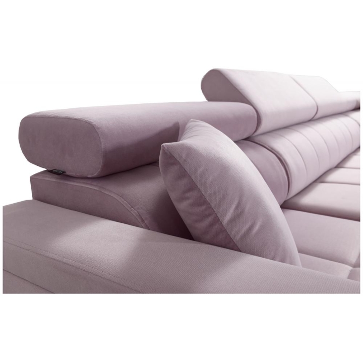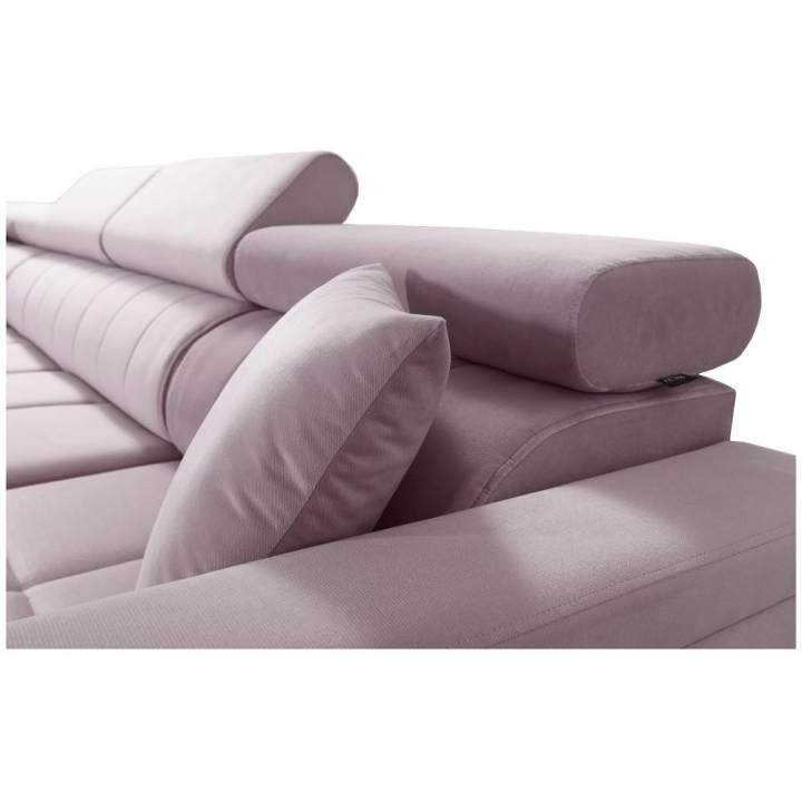 Wyposażenie obejmuje 6 regulowanych zagłówków, pozwalających na indywidualne dopasowanie pozycji oparcia. Mebel wykonano na sprężynach falistych oraz utwardzonej piance T-30, z użyciem tkanin najwyższej jakości. Całość została wzmocniona stelażem na ramie drewnianej połączonej z płytą wiórową, co przekłada się na trwałość konstrukcji.