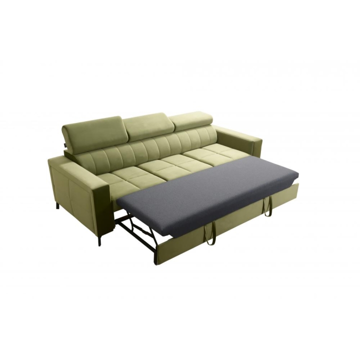 Model oferuje pełnowymiarową powierzchnię spania o wymiarach 195 cm x 127 cm, co pozwala na wygodne użytkowanie również w trybie nocnym. Istotnym atutem są 3 regulowane zagłówki, które umożliwiają indywidualne ustawienie podparcia głowy i karku. Poduszki widoczne na zdjęciu dołączone są gratis, co stanowi dodatkową wartość przy zakupie.