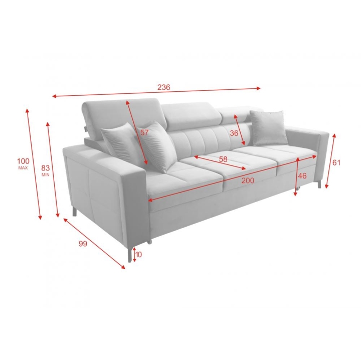 Bryła sofy ma 236 cm szerokości oraz 99 cm głębokości, co zapewnia odpowiednią przestrzeń do codziennego użytkowania. Wysokość siedziska wynosi 46 cm, natomiast maksymalna wysokość sofy to 100 cm, dzięki czemu proporcje mebla pozostają harmonijne. Tak dobrane wymiary umożliwiają zachowanie komfortu zarówno podczas siedzenia, jak i odpoczynku.
