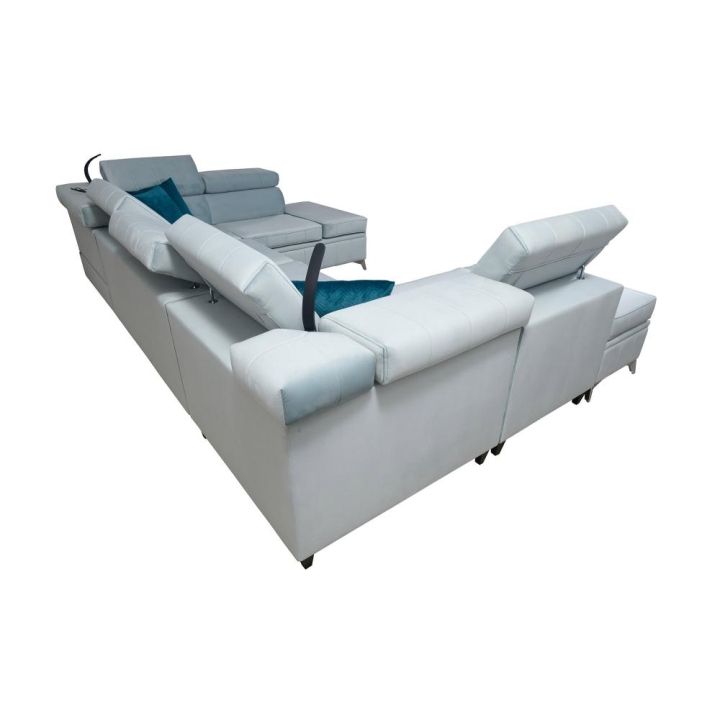 Dodatkowym atutem są 8 regulowanych zagłówków, pozwalających dostosować oparcie do indywidualnych preferencji użytkowników. Umożliwiają one zarówno wygodne podparcie głowy podczas relaksu, jak i stabilne oparcie przy dłuższym siedzeniu. W komplecie znajdują się również poduszki widoczne na zdjęciu – w cenie mebla, co stanowi estetyczne uzupełnienie całości.