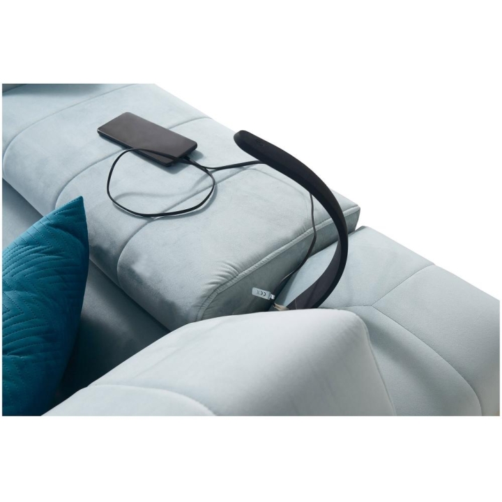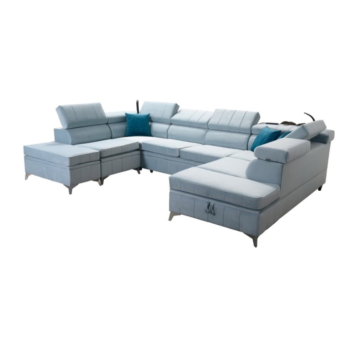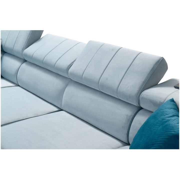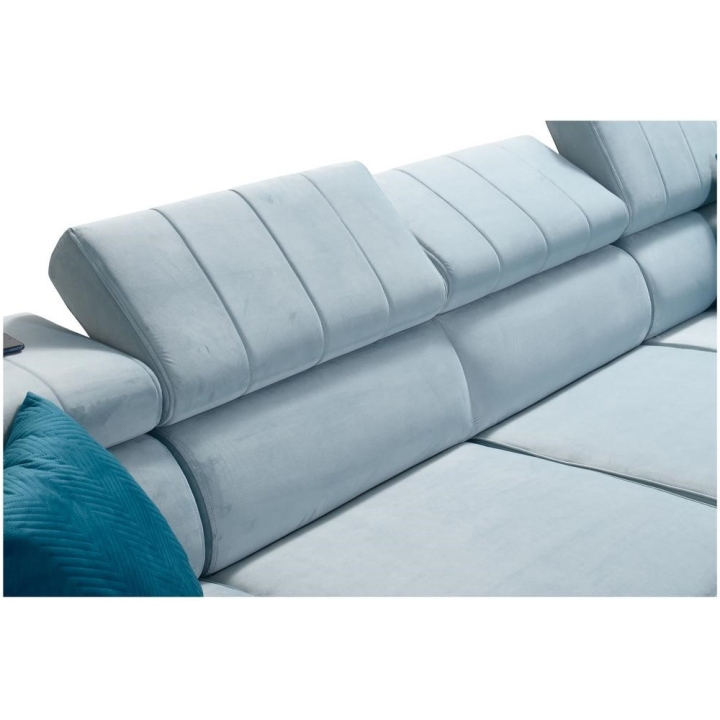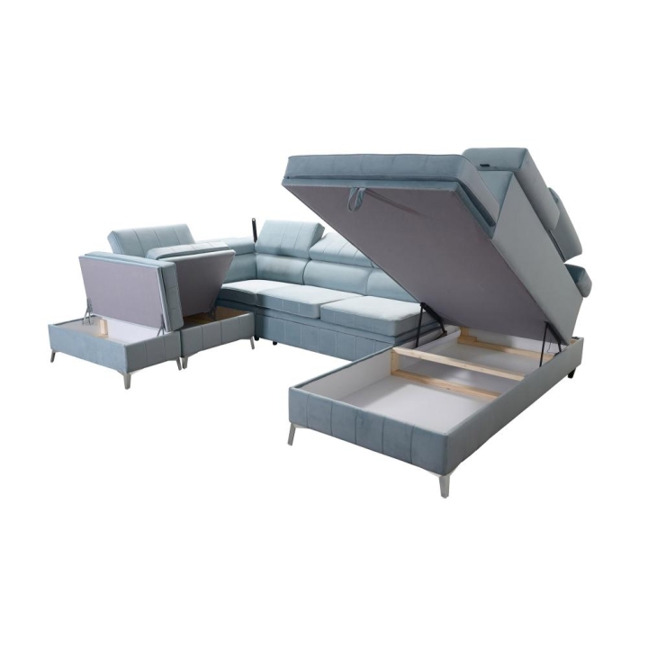 Po rozłożeniu narożnik oferuje obszerną przestrzeń do snu o wymiarach 260 cm x 131 cm, umożliwiającą swobodny odpoczynek dwóch osób. W konstrukcji przewidziano aż 3 pojemniki na pościel, które ułatwiają przechowywanie kołder, poduszek oraz innych tekstyliów. Dzięki temu wnętrze pozostaje uporządkowane bez konieczności stosowania dodatkowych mebli.